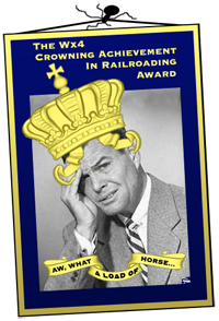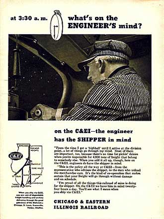 | Still a couple of years away from a 'good' job (or age-related death), this elderly hoghead is fighting to maintain consciousness in the wee hours because he 's dedicated to the shippers. Yep, you betcha! We believe that this piece of patent propaganda needs to be recognized, because we judge that it represents perhaps the most preposterous piece of advertising claptrap ever put forth by an American railroad. Taking into consideration the other offerings on this page, this is no small accomplishment. Thus we have come up with a befitting way to laud the C&EI for a truly wondrous exercise in detachment from reality, The Wx4 Crowning Achievement in Railroading Award. Way to go, boys! |