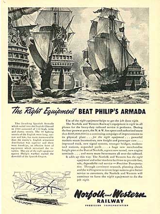 | Now that the beloved C&EI has set the tone, let's look at an example of what Norfolk and Western has contributed to clueless advertising. Around mid-Century, N&W put out a series of ads that strived (unsuccessfully, we opine), to compare their railroad with totally unrelated history. In ironic fashion, this example is probably apropos. Perhaps the N&W's cut-rate (merely a guess based upon the quality of their work) ad agency executives were subconsciously thinking of the railroad's technological state in composing this masterwork. After all, in 1953, N&W was still merrily constructing steam locomotives well after many large railroads had totally dieselized. Sure, N&W did this to placate coal shippers, but to the larger public, N&W 's fleet appeared more like the Spanish Armada's square riggers at than, say, Bull Halsey's aircraft carriers. Sometimes accurate associations are not the best thing. |