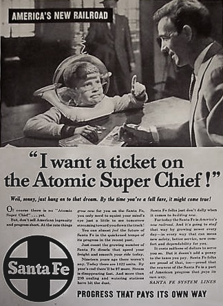 If you know anything about Santa Fe history, you probably know that, around the turn of the Twentieth Century, the company was intimately involved in the huckstering of land in what later became part of the Dust Bowl. One of "Uncle John's" ploys to lure unsuspecting settlers was to explain that while, yes, the short grass prairie was presently too arid for dependable dry land farming, it was a demonstrated scientific fact that the vapor from steam locomotives on its new railroad lines was advancing the line of sufficient rainfall westward from more humid areas at the rate of 18 miles a year. Yep pardner, the land may look like hell now, but give it a couple of years of passing trains and it'll be a Garden of Eden. I wonder why there's still an ongoing debate about human-caused climatic change - Santa Fe proved that we could do it a hundred years ago! And, to boot, all of those farmers that the railroad hauled eventually caused one of the greatest ecological disaster in American history. Nice work! So, fast forward a few decades, and here is Santa Fe at it again. If you've ever perused old copies of Popular Science from the 1950's, you'd know that most folks thought that atomic-powered cars, planes and personal vibrators were just around the corner, Thus, an atomic-powered Super Chief was not too fantastic to be beyond believability. Here we see an intent Santa Fe ticket agent explaining passenger nuclear safety to a happy customer. The ad is pretty avant-garde for the times: notice that Mr. John Q. Public is not wearing a hat! Where the ticket agent got his helmet, I don't know, but I believe that it subsequently wound up as a prop on Lost in Space after a collision between the Atomic Super Chief and a nuclear-powered ice cream truck led Santa Fe to reconsider the whole thing. The mushroom cloud sure must have produced a fair amount of rain, though! |
