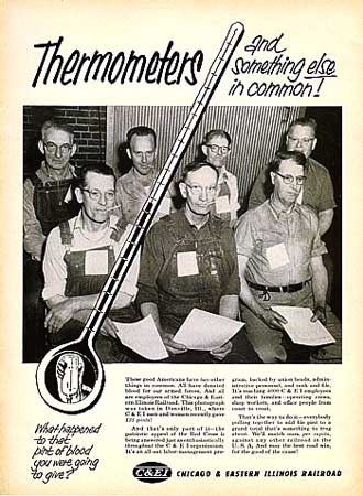 | Question: Why do old railroad roundhouse sites end up on the Superfund list? Answer: Because, back in the pre-EPA days, railroads used about every kind of noxious, caustic and carcinogenic chemical known to mankind to maintain and fuel their equipment. For instance, just ask these twenty-something-year-old roundhouse laborers here at the company hospital, where they are undergoing the annual check on their state of slow death. Most of them probably will have to give us written answers, since their lungs are too wracked with mesothelioma to respond verbally. Nevertheless, why do they look so content? Because this get-together also doubles as the annual meeting of their 1944 Hires Last Man Standing Club. It now being 1951, these guys are what's left of the original 68 members of the 1944 class. Of the originals, two guys quit in the interim, while the others who didn't make the photo were terminated for various rules violations, such as drowning in the turntable pit, croaking from benzene-related illness, or maybe even for being hit by a crane. So, yes, these guys are happy survivors, as were the two iron men who returned for the 1952 meeting. In reality, the blood drive thing was nothing more than an attempt by the embattled C&EI public relations department to recover face from the hoots and cat calls that received their disastrously funny 1951 campaign (above). Of course, after this ad appeared, a high incidence of leukemia and alcohol tainted blood nearly put the Red Cross out of business, and those of the public who viewed this ad swore-off blood transfusions. |