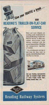 | And speaking of accurate associations... Back in the late 1970's we encountered a flatcar sitting near San Jose's Newhall Tower. On top was a beautiful new Chris-Craft 30 foot (or so) cabin cruiser...with a hole punched in the hull nearly large enough to sail the Spanish Armada through it. Sadly, this sort of thing has always been a sore spot with railroading. We ourselves learned that, even despite reasonable care, one's assemblage of valuable merchandise stands good chance of arriving in unassembled condition. Given the railroad industry's sorry record in this regard, we say here as we literally and figuratively have said so many times before: What in the heck were the ad guys thinking? Shipping manager: Hey Henry, get a load of this ad! These Reading boys are just plain stupid. Put that load of perfume bottles on the B&O, would ya? Christ... |
