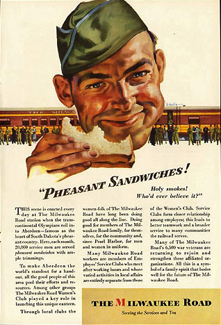 Giant heads were a popular advertising tool in the Forties. I've always found this approach to be disturbing. I'm sure that others share this feeling. Test: Suddenly thrust a full-size copy of this ad in front of a toddler and shout BOO! Thankfully, in the Fifties, these type of ads transmogrified into a more-appropriate genre of science fiction movies, such as Attack of the Giant Radioactive Head., the story of the victim of atomic bomb testing who goes on a destructive eating frenzy, or the sequel to the original The Day That the Earth Stood Still, entitled Etu Klaatu? - while returning to earth, Klaatu's spaceship is exposed to atomic bomb testing, causing Klaatu to suffer from horrible migraines due to the gigantic expansion of his head...and his suffering could only be relieved by the copious consumption of human blood! So here, the dear Milwaukee Road, one of the true fountainheads of bizarre advertising, hyped pheasant sandwiches, in a national ad campaign, no less. Maybe this bit of homeyness was an attempt to soften the blow of the negative publicity that arose from their trains constantly falling off of their tracks. Whatever their intent, you'd think that it probably backfired; implied that the South Dakota folks were devastating local wildlife (do you supposed that to meet the quota, the Army lent them machine guns ?) to feed the troops, because other types of meat were rationed. The folks in Tuscaloosa probably fed possum pie to passing troops, but Southern Railway was too smart to use that in ads, since that would remind Alabamians that they'd hunted off all of their pheasants for camp meat during the Civil War. |