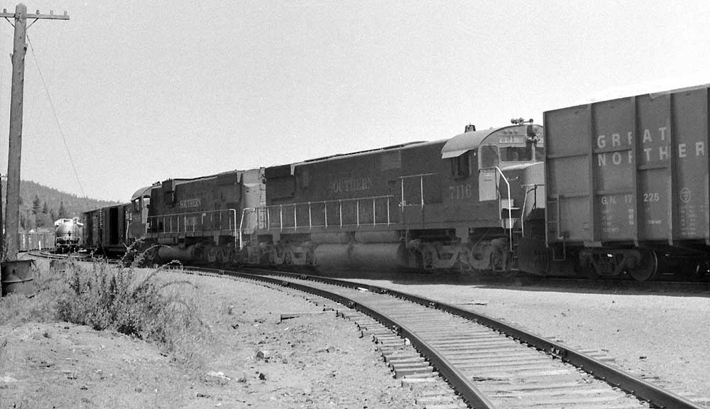 I'd judge that SP&S didn't win any Good Housekeeping Seal of Approvals for "Apple Pie Order Landscaping". Here we see two Alco RS-3's, SP&S #75 and BN #4075 (ex SP&S #95) lazing away the afternoon amid the clutter. These two units were some of the earlier class members to depart the BN roster. The discovery that this photo contained a prominently displayed Willys Jeep Station Wagon caused quite a stir around Wx4 offices, and resulted in immediate display of a cropped version, along with appropriate commentary, in Wx4's interdimensional Harmonic Convergence of Geeps and Jeeps. You foamers probably haven't noticed that half of Wx4 is devoted to said Wagons. |