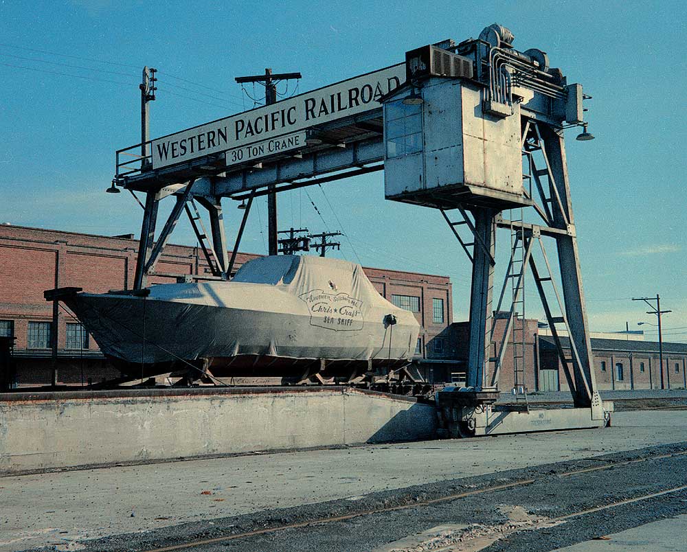 (above) West San Jose terminal's transfer crane, August 1965; Del Monte cannery warehouses in background along Bush Street.