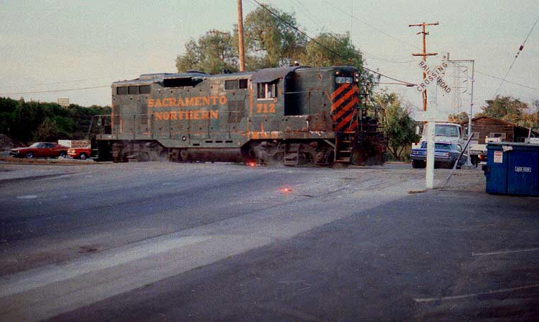 (above) Late evening for the SN 412: switching at Lonus Street (the I-280 enbankment is north of the engine at left) in Willow Glen, September, 1983.