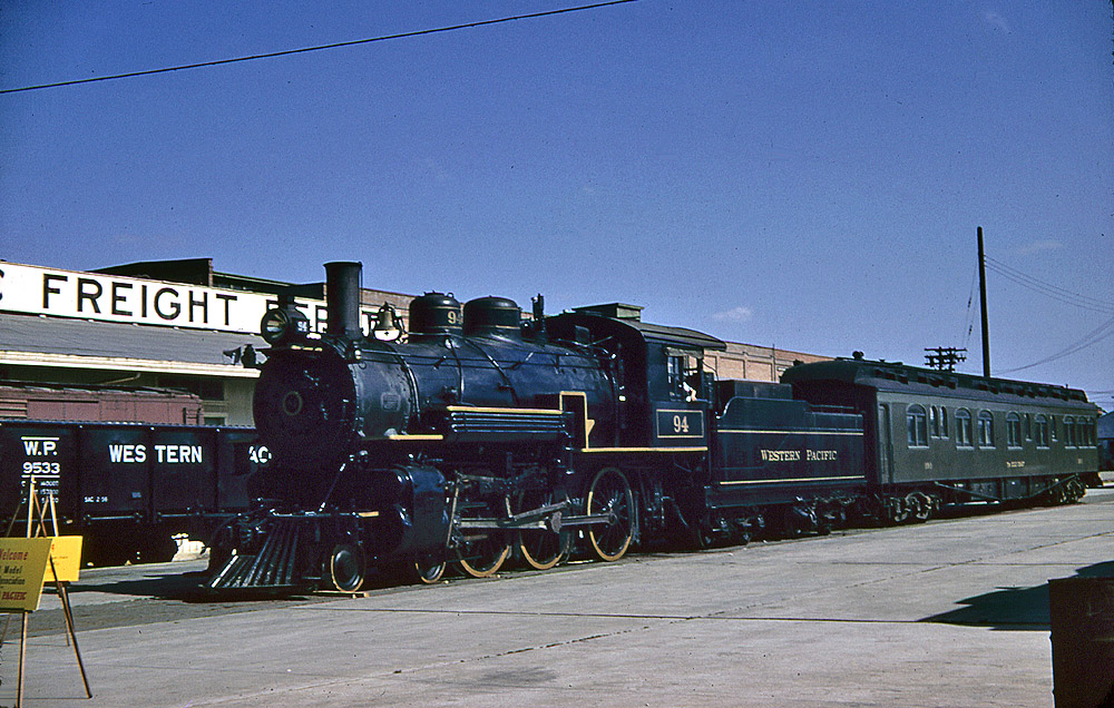 The main WP attraction, 4-6-0 #94, was "still warm" when well-known WP engineer / author / Almaden Stage Lines owner Norman Holmes used a switch engine to drag it down the branch from the main San Jose yard at William Street. Here we see her at West San Jose in all her polished glory. - slide from Wx4 Collection, photographer unknown; my thanks to Dave Hambleton and Ken middlebrook for supplying information on the event