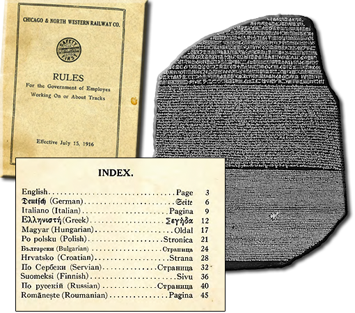 We used to pride ourselves as a nation of immigrants. When it comes to railroading, we immediately conjure up images of Chinese laborers risking life and limb to construct Central Pacific, but the truth was that in our developing rural hinterlands, railroad construction and maintenance crews resembled United Nations missions. The 1916 Chicago & North Western rule book for track workers (below) illustrates the assertion - It is printed in twelve languages! (click on the image for a PDF)