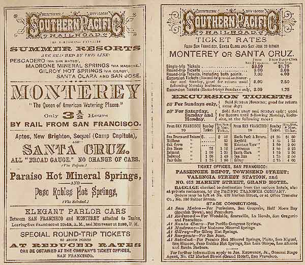 (below) Note that SP promoted the new Pacific Grove Extension by giving it a separate listing from the rest of the Monterey Branch. The line between Monterey and Lake Majella was not completed until August 1, 1889, about four months after the Del Monte Limited received its name. For a comparision, refer to the Ferbruary, 1889 timetable. (below right) New at Castroville was a dining hall - with free wine! Wx4 staff suspects that the free wine thing quickly backfired on SP. |