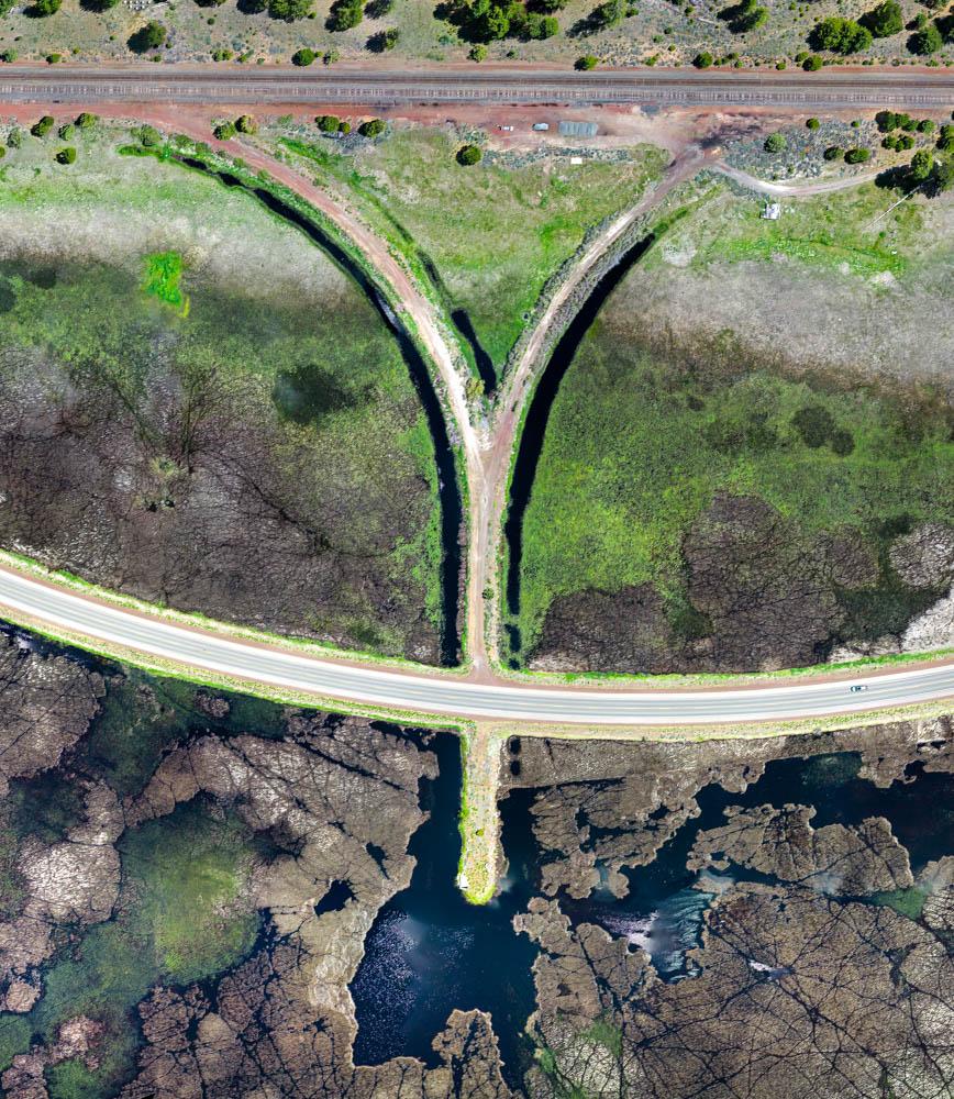 The first two images were recorded from a drone by Steve Bush, who has a "thing" for photographing wyes. We opine that his works transcend foamer photography in favor of the world of art. The third comes from Google Maps via Jeff Moore, who highlited the SP tracks in red, the Weed/Long Bell Lumber spurs in green and U.S. Highway 97 in blue. Note that the west spur ran through today's CalTrans maintenance station.
