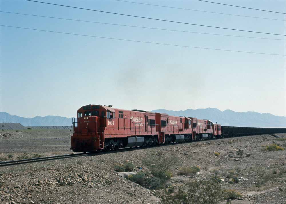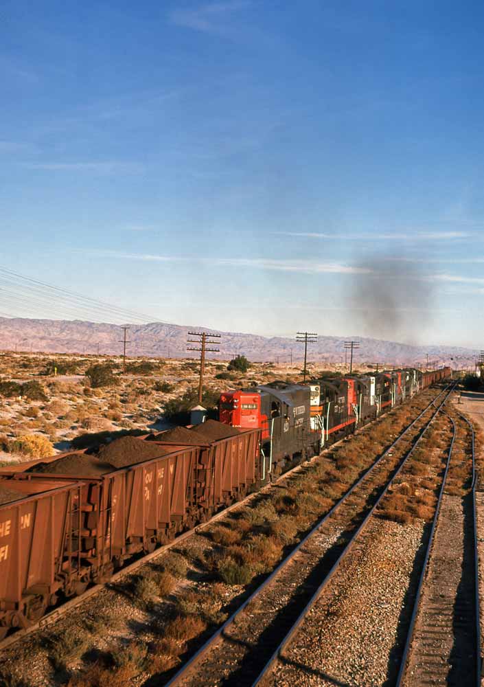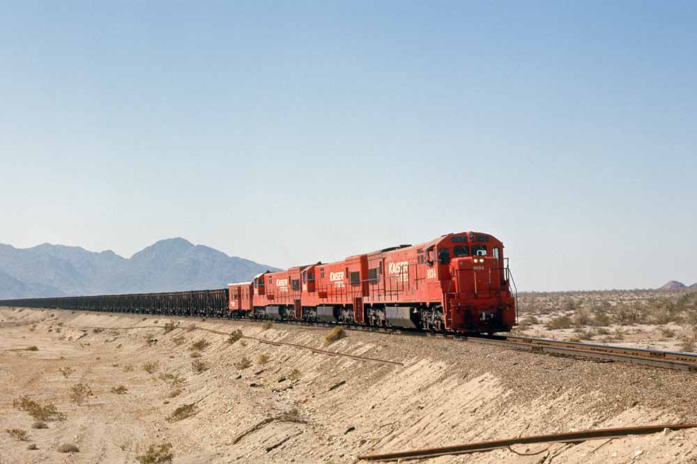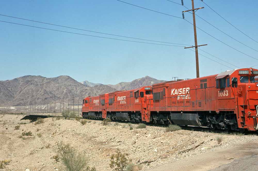 Kaiser handed the 100-car ore trains off to Southern Pacific at Ferrum for the balance of the journey to Fontana. Part of this movement included 47 miles of adverse 1.99% grade between Indio and Beaumont, which resulted in some impressive power lashups. In these first two photos we see a Kaiser ore train passing through Palm Springs with six units (U25B, four F-units, and a Geep or SD) on the point and then eight Geeps cut in as mid-train helpers. One last shot shows SP's enginehouse at Indio in 1958. |