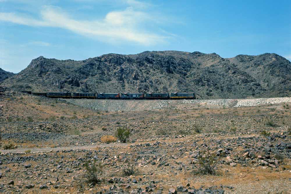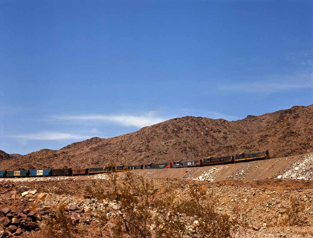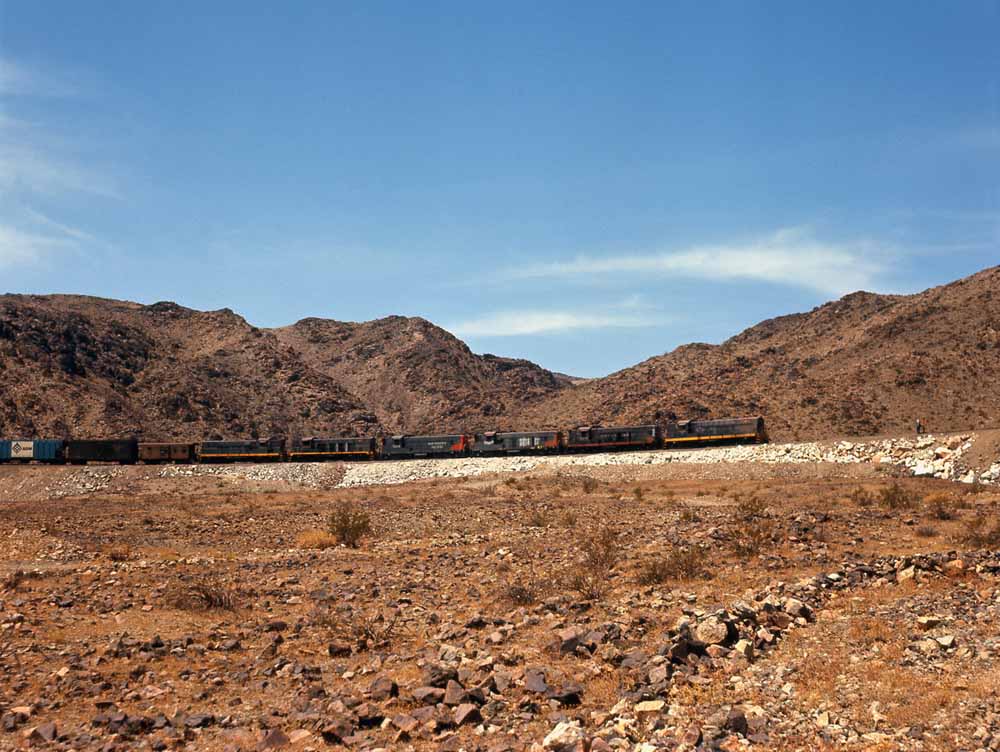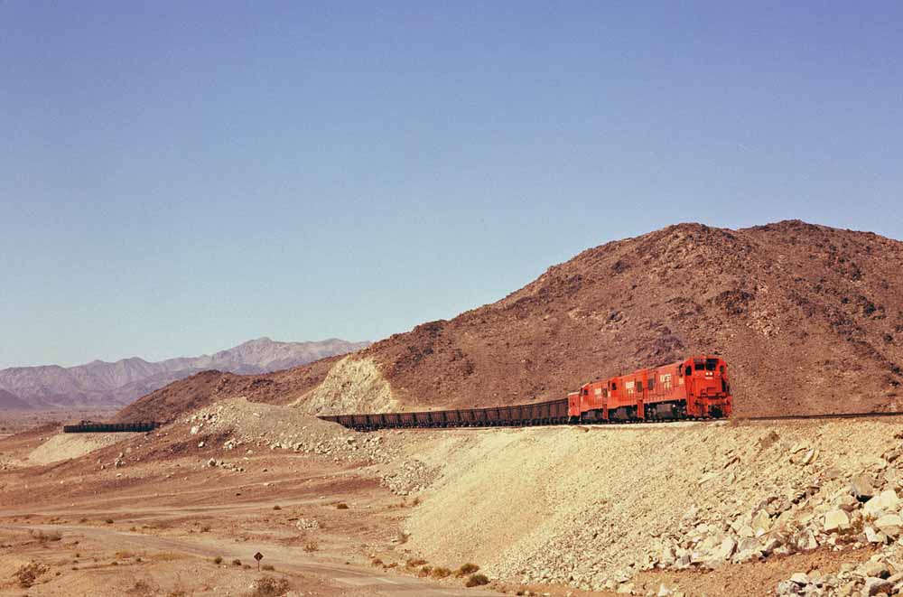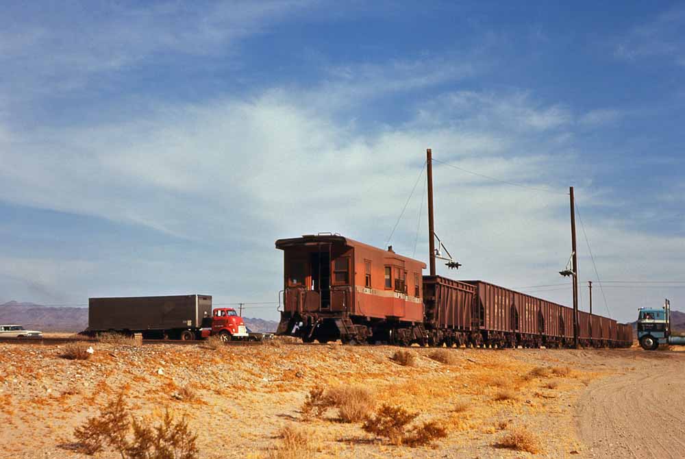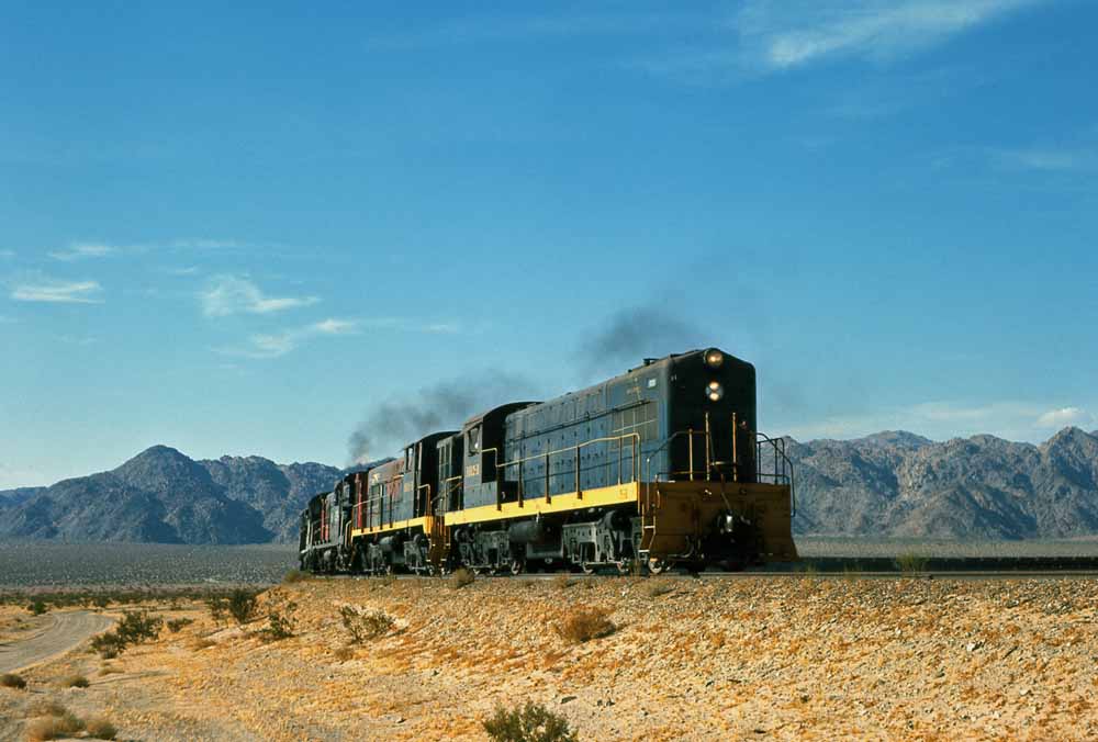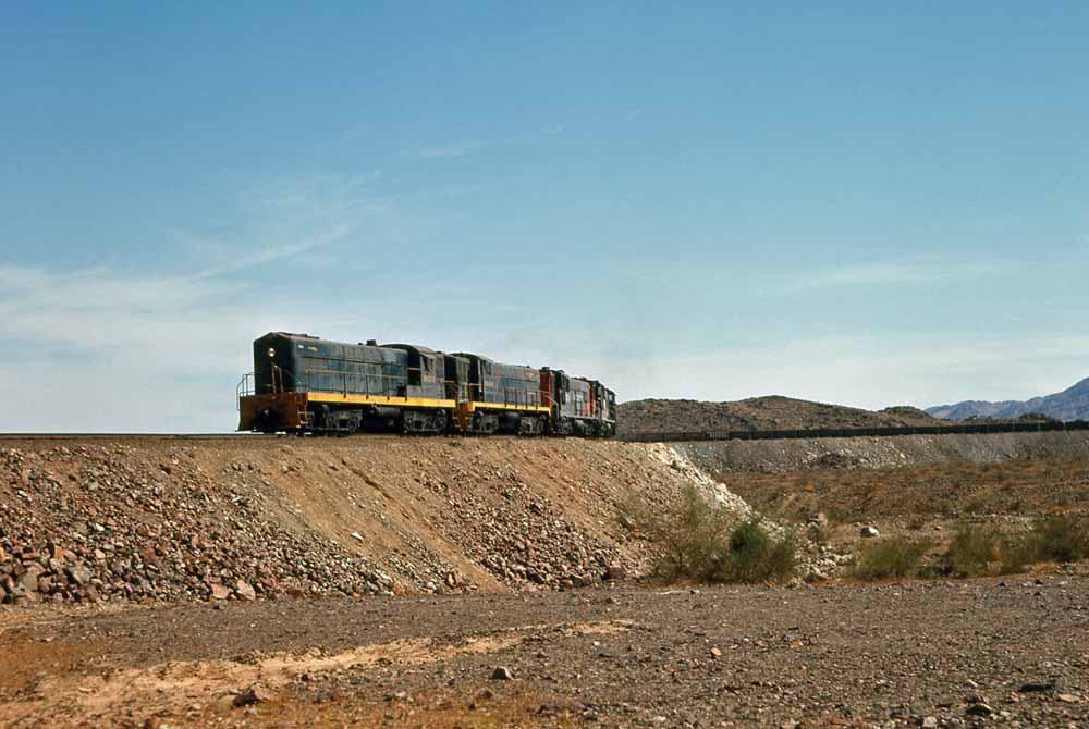 Charles visited the Eagle Mountain at least twice and maybe three times. During his first one or two visits he found the Baldwins still active, though looking tired and still carrying their original numbers. We'll start with a map of the railroad and then two of his Baldwin shots, first of four Kaiser Baldwins spliced by leased Southern Pacific AS-616 #5254 crossing the large steel bridge that carried the railroad over a normally dry wash, and then a going away shot of the 1012B and 1010B approaching a grade crossing.