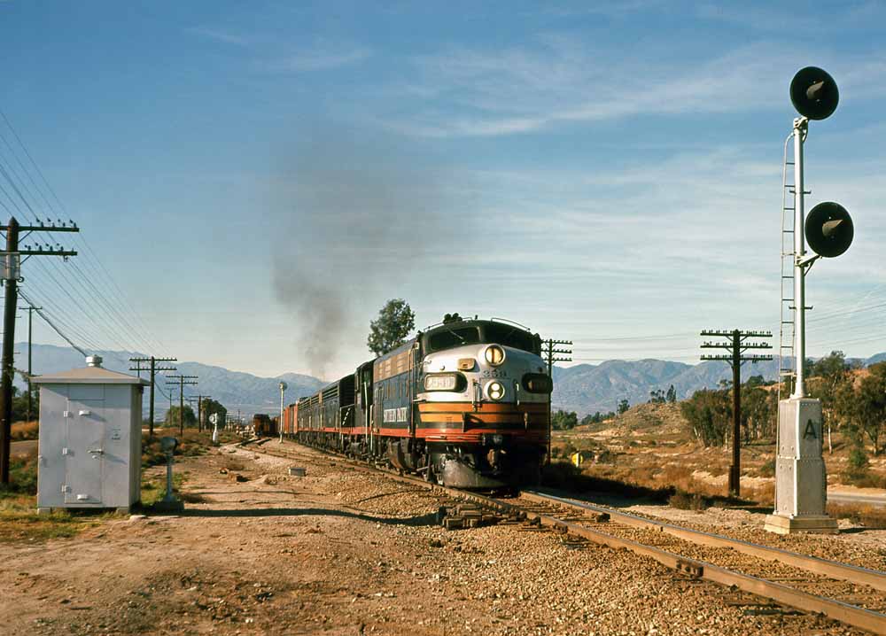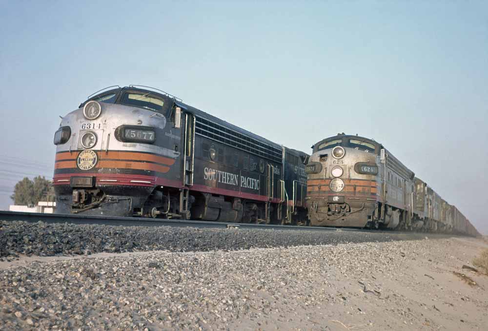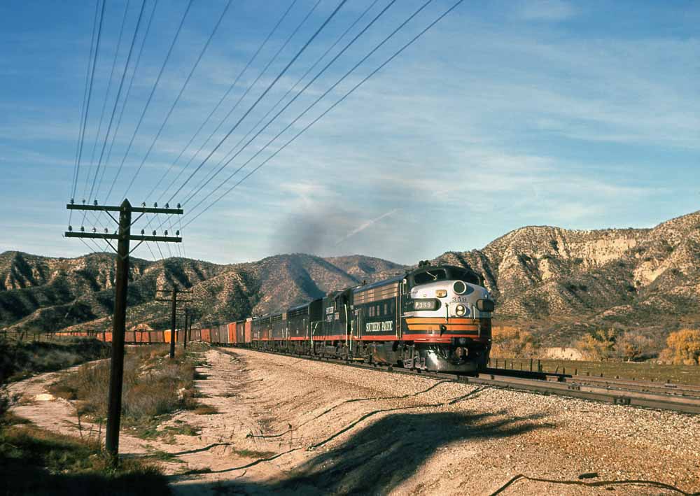 | Our concluding photos begin with an action shot at Indio of SP #624 passing #6314 and then two shots of #359 leading an almost all F-unit consist, first at Redlands and then in San Timoteo Canyon. |
