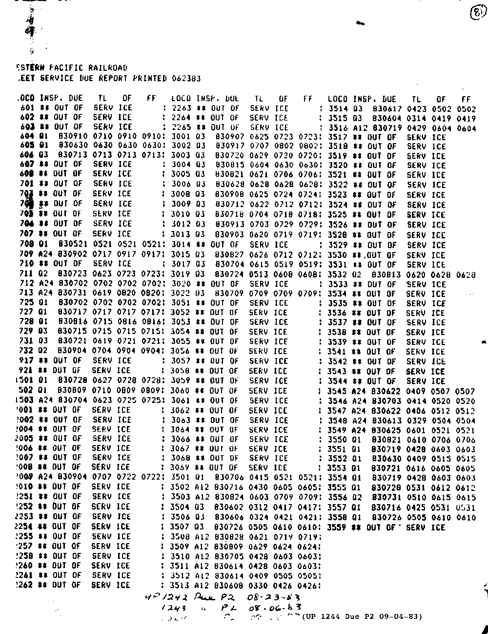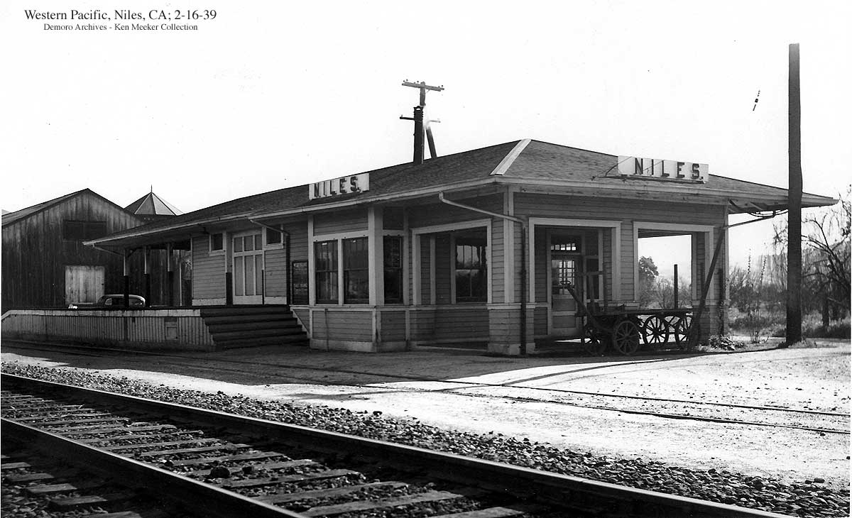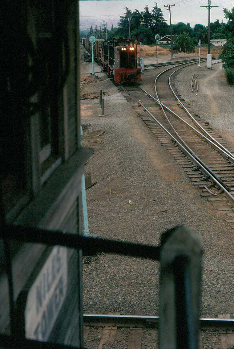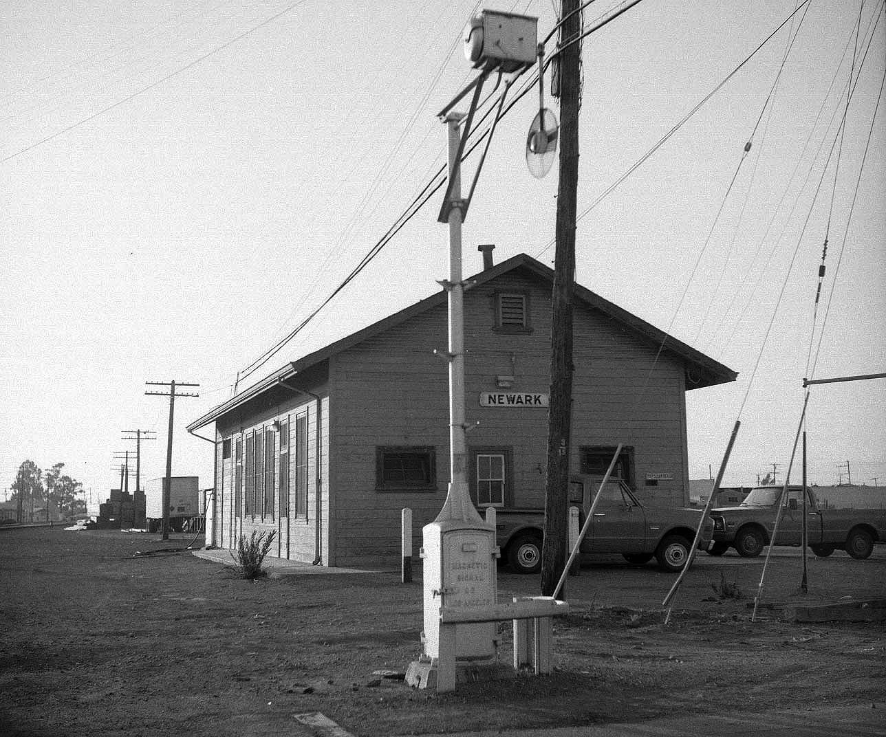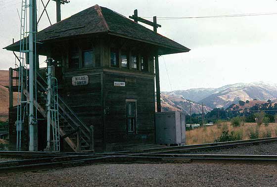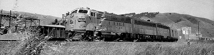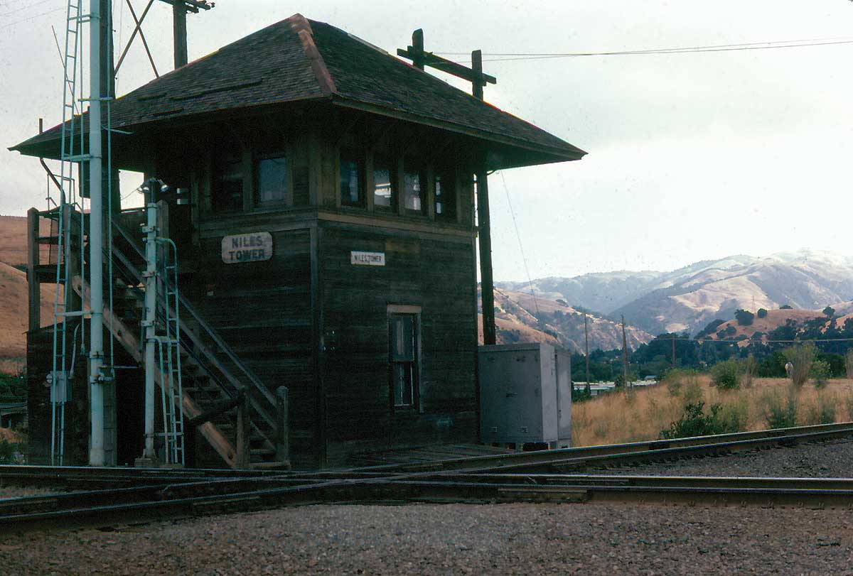 Near the end: Niles Tower on April 30, 1983 Though the nation was far along in its advance out of the 1980 recession, SP was not. Its boxcar business had evaporated, never to return. SP trains by Niles Tower were infrequent, compared with the past. Worse, WP had just plain evaporated the previous January. UP yellow was already beginning to predominate at the tower. By late June, sixty percent of the former WP locomotive roster was out of service, not that it made any difference to Wx4 staff on that Saturday morning: no UP trains. Thus, during our one hour visit with Cookie, the tower's UP operator, the only train that we saw was SP's East Pleasanton turn. Bay Area railfanning was slim pickens during the recession. Further down the page, you will find the "and Envirions": WP in Fremont and a couple of looks at Niles Canyon, plus Wx4 Bonus Photos of Newark. |