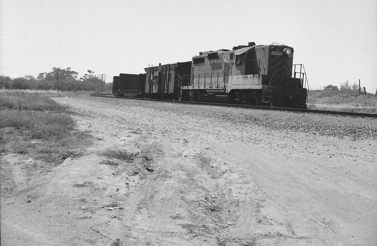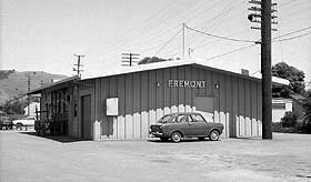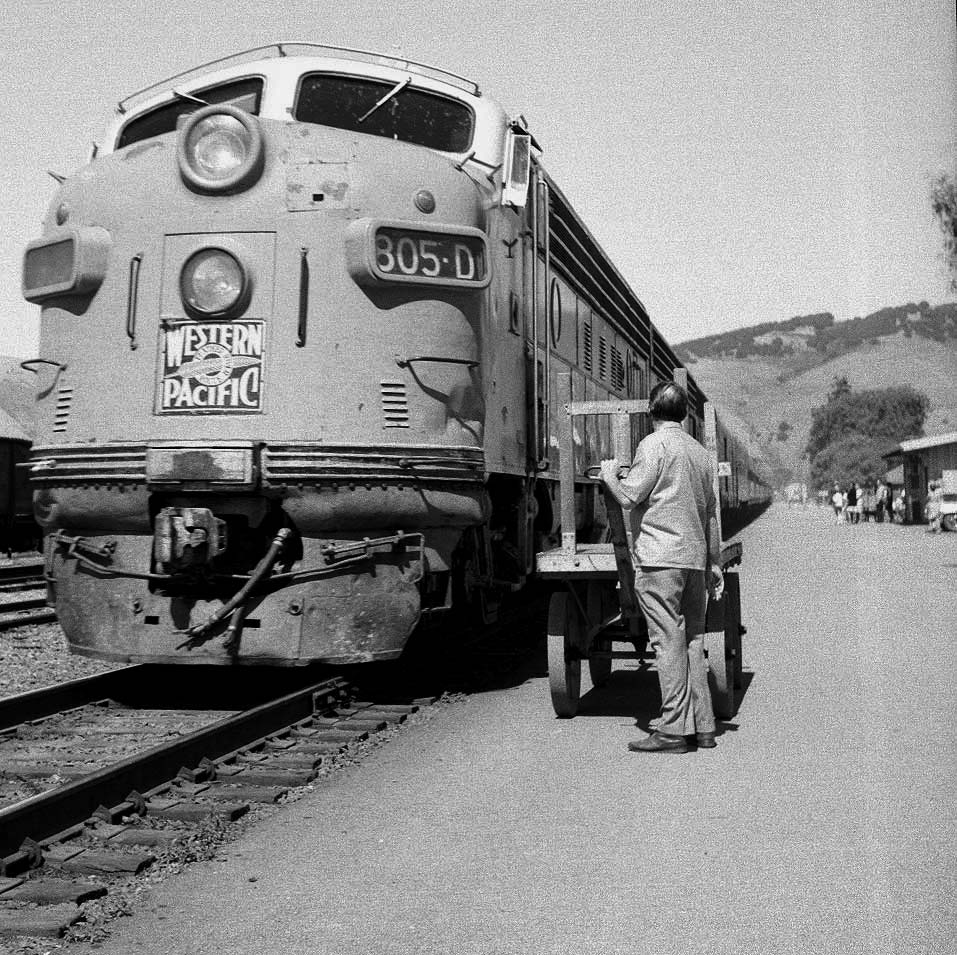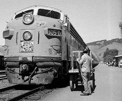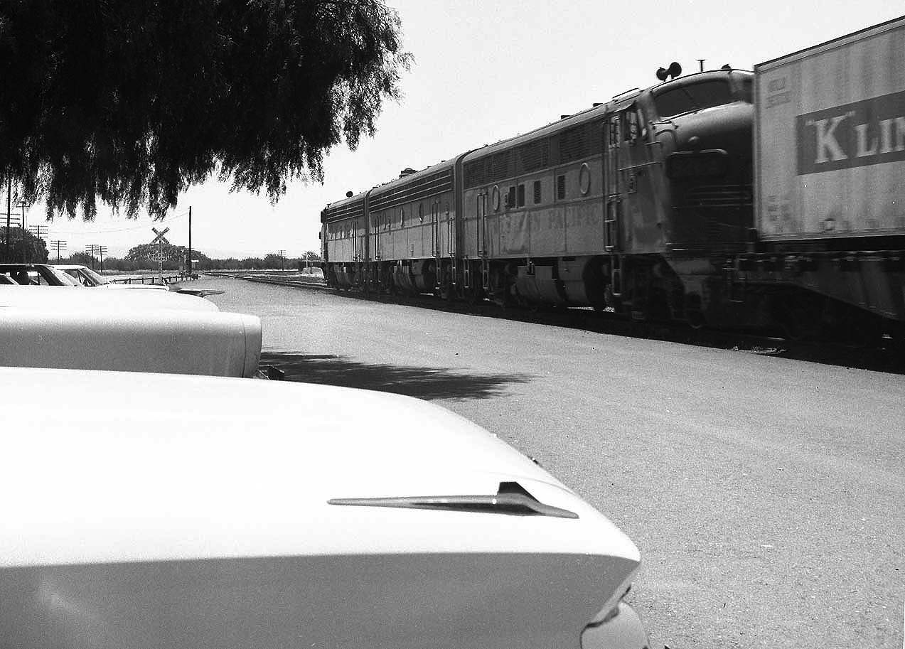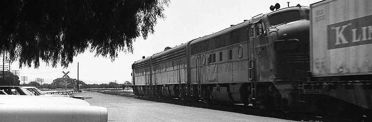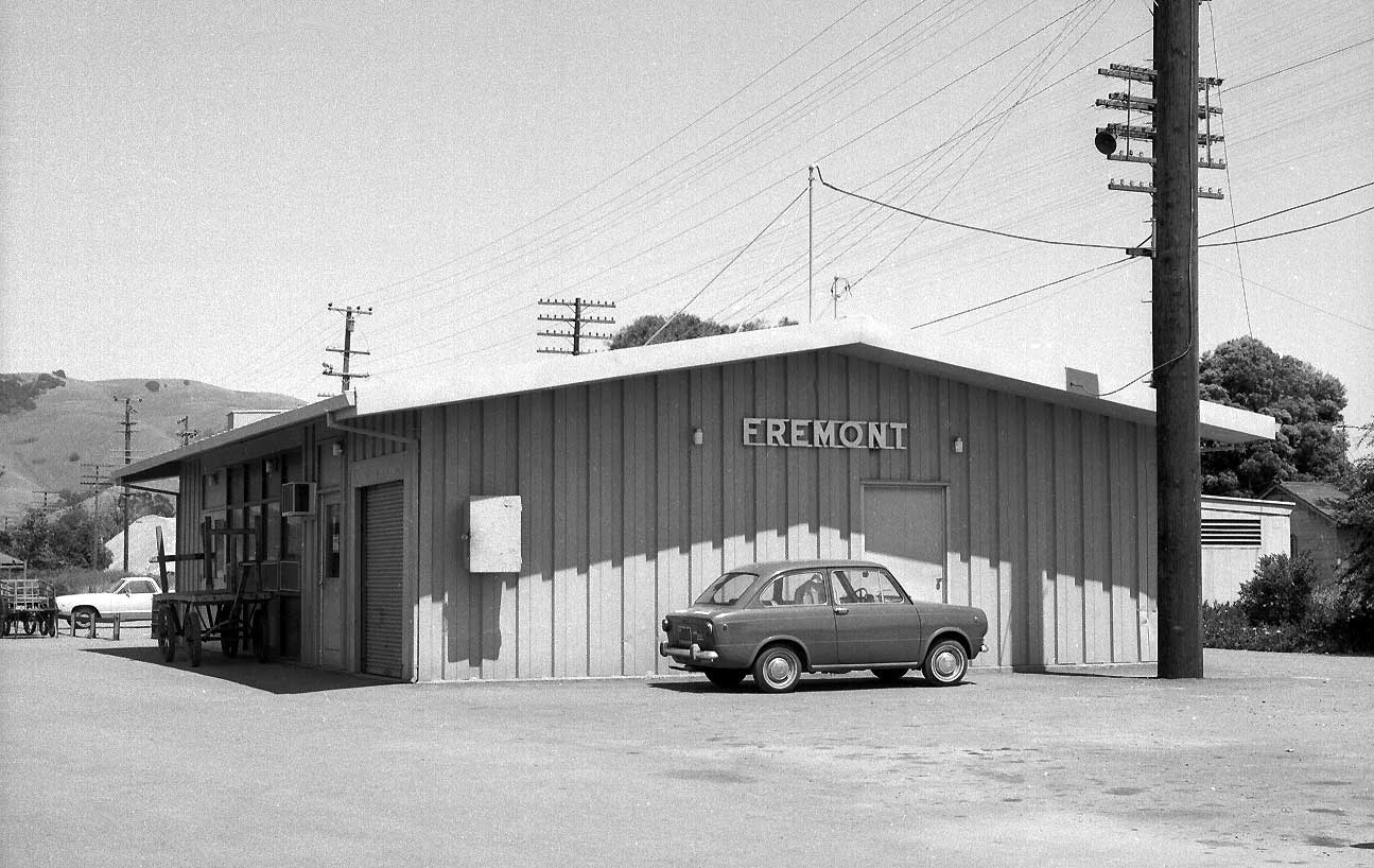 | Now it should become obvious why you don't see many (any?) pictures of WP's second Fremont/Niles depot. That little Hillman (above) is one heck of a bunch more interesting than the tin monstrosity behind it, yes? In truthfulness, WP's original Fremont/Niles depot, which was demolished in favor of the tin shed in 1963, wasn't much better looking, as far as we are concerned - it looks very similar to WP's surviving Irvington depot, which was uprooted and deposited on the hillside above downtown Niles in the 1955. Fremont depot's saving grace was that the California Zephyr used to call upon it twice a day, The photos left and below show the Zephyr's arrival and departure on a positively wonderful day in June, 1969 (the other pics come from that day, as well). The lower view was taken at the great curve just west of Fremont Yard. That's Pacific States Steel, which operated from 1938 to 1978, on the left. The photo second below, featuring GP20 # 2006, shows the curve looking the other direction. Third below, is the curve from the depot parking lot. The crossbucks protect the interchange track that connects with SP's Shinn siding. Note the passenger F3 on the freighter still retains its nose wings, while the 805-D is missing hers. |