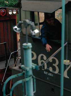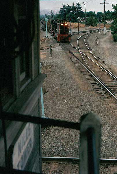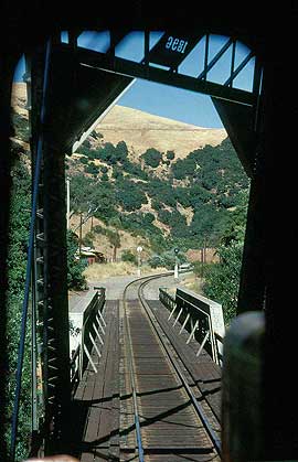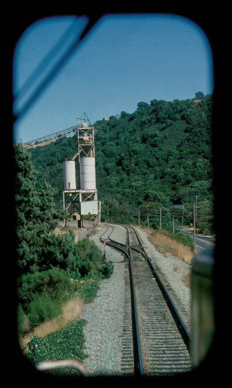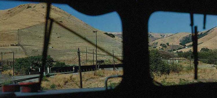 | From the cab of an eastbound East Pleasanton Turn, Summer, 1979; Left: Brightside, now (2005) Niles Canyon Railway's headquarters; Right: Farwell bridge; Below: east leg of SP's Niles Junction wye. Note the signals visible (barely) in the right windshield. It was a short block between the junction switch and the last intermediate signal up the canyon east of the wye switch. Plus, the wye signal was on a blind curve, and would sneak up on you. If an engineer didn't already have a good hold on a heavy train when he first saw that intermediate displaying approach, he could easily slide by the junction signal. Many new engineers did. | |||||