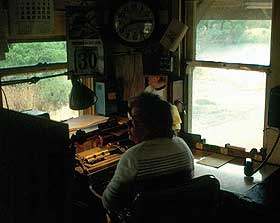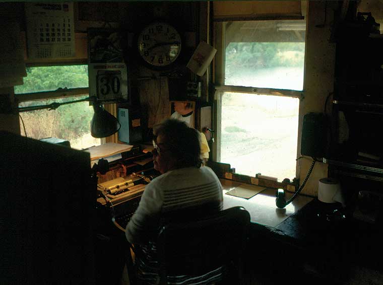 | Above & upper right: This being a Saturday, the East Pleasanton Turn did not operate to East Pleasanton. Rather, it headed up the Milpitas line from San Jose to Niles Tower, then backed up to the Centerville Wye and headed towards Newark through the east leg's hand-throw switches. Eventually, the train headed back to San Jose via Agnew. In former years, before SP closed the Dumbarton Bridge, this train operated out of Bayshore Yard and mainly carried rock from three quarries at East Pleasanton/Elliot. It also made occasional runs to the steel mill in Livermore and out the San Ramon Valley branch after the East Pleasanton switcher job was annulled. In the late 1970's, the Turn's arrival at its namesake often coincided with the passage of the F-units on WP's San Jose Autos. The "EPT" was one of Wx4 staff's favorite runs. Anyone recognize the hoghead? Above right: Cookie, the WP operator (and a genuinely nice gal), has a blank order in the Underwood, and is ready to "copy one". Notice the pre-WWII calendar featuring a slant-nose Missouri Pacific E-unit. Also note the ancient dispatcher's-line phone, and the more modern (UP dispatcher?) phone off of the hook to avoid interruption. The interlocking machine at her left only controls SP switches. |