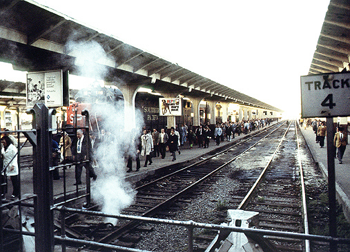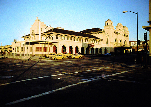 | Third & King, looking southwest: The King St. trackage in the foreground served both as interchange to the SF / State Belt RR and as arrival/departure tracks for long haul passenger trains. | ![]() |
