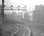 A smoggy-day, long-telephoto look up the half-mile, or so, between the depot and the roundhouse on July 20, 1969. If you had turned around and hiked about 200 feet north from the position of the top photo, this is what you would have seen: freight lead in foreground, eastbound main in center, westbound occupied by overpowered plug #151. The east leg of the wye is out of the photo just to the right of the train's marker light. Lenzen Avenue and the roundhouse appear ahead of the locomotives.