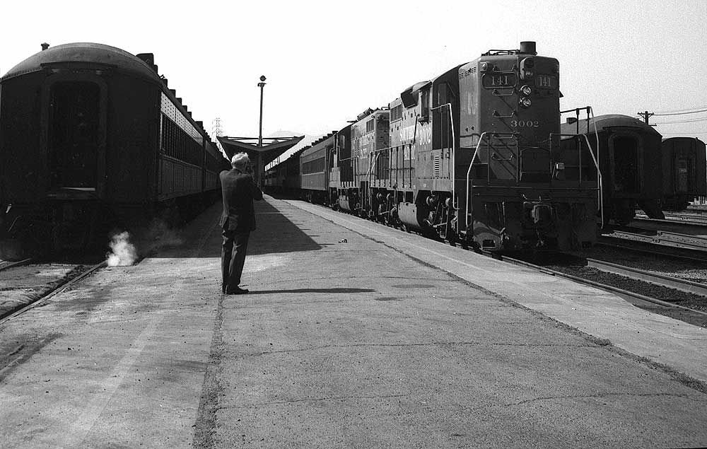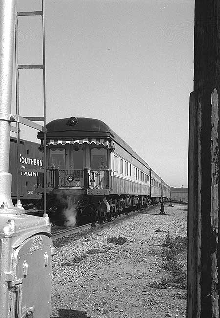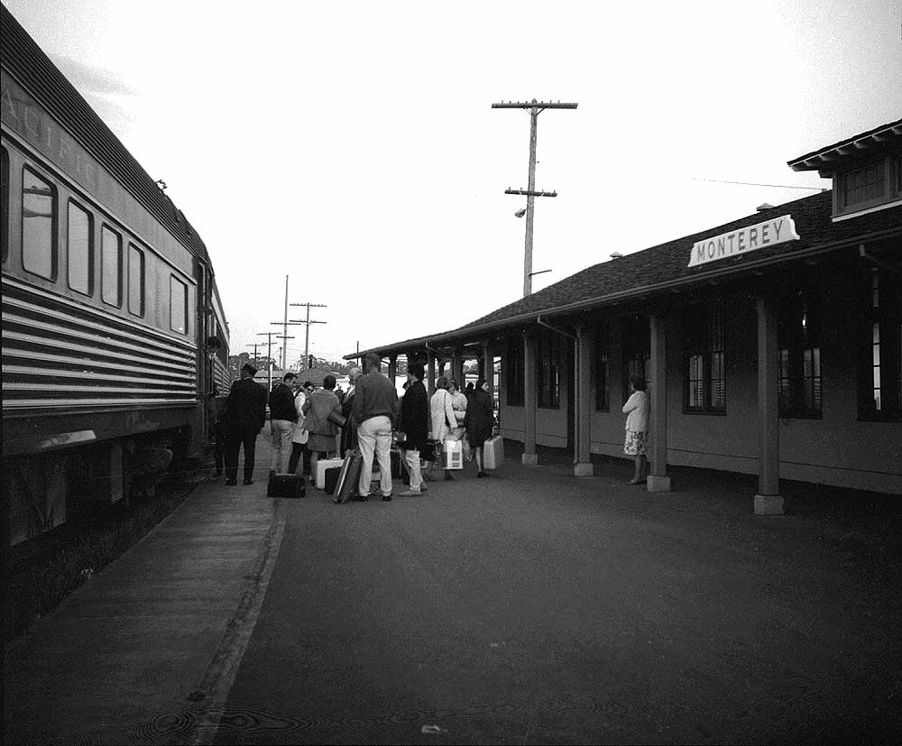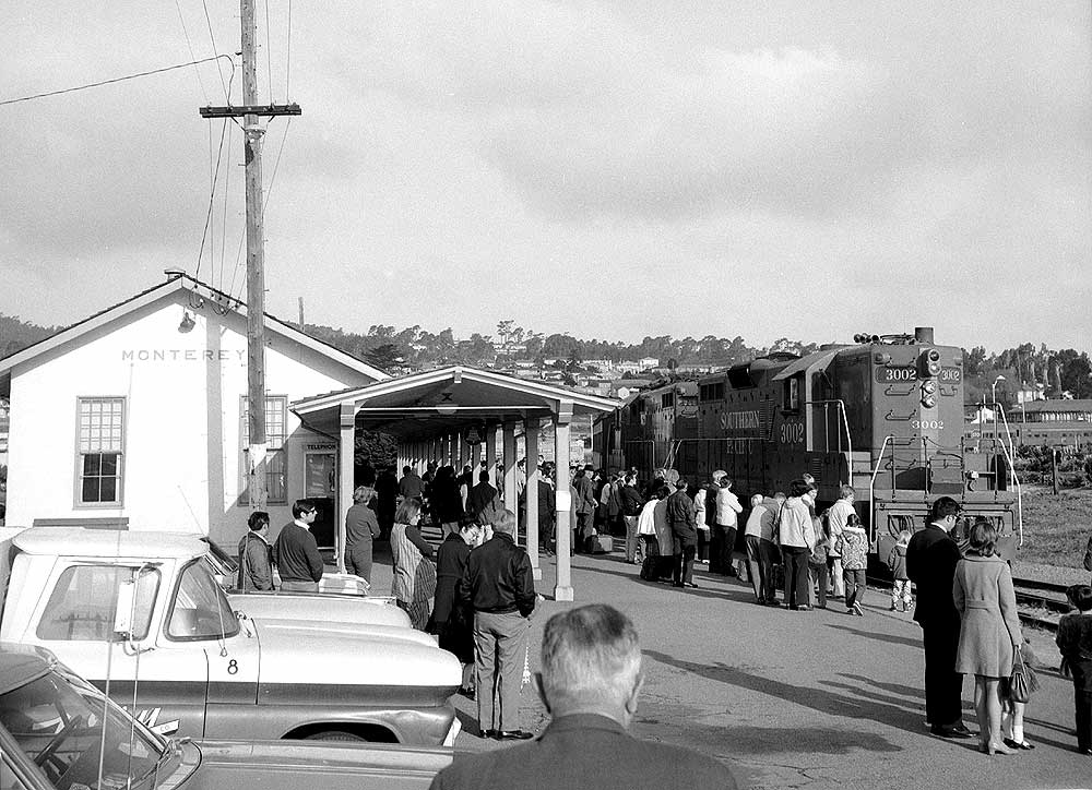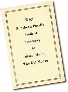 The crowds of riders that once attended Southern Pacific's Monterey trains rapidly vanished in the 1950's. SP's annual July passenger count showed on average less than 40 passengers in 1962, a precipitous drop from a few years before. Concluding that "There isn't anything more that we can do" to regain ridership (see pamphlet at right), SP threw in the towel in September and filed its first pertition to discontinue the Del Monte with the California PUC. It and subsequent efforts were rebuffed by PUC, and the train survived until the onset of Amtrak. Amtrak's original mandate allowed it to operate long haul trains, defined as runs of at least 150 miles, only. Anything under that was a commuter train, according to Amtrak's charter. Sadly, the SP's Del Monte only ran about 125 miles, so it sat in a Catch 22 type situation: Amtrak's could not legally take over the train, because it was a "commuter" train, but SP maintained that it was a long haul train, subject to discontinuance with the start up of Amtrak. Ultimately, SP's viewpoint prevailed and the Del Monte came off. I wanted to ride on the train's last westbound and eastbound trips, but April 30, 1971 fell on a Thursday, and I had college classes to attend. Instead, I chose to climb aboard on its last Saturday, April 25. As today, most of my |