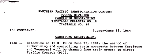 Once we employees got used to DTC, and it didn't take long, some found that bending the new system could enhance their chances of getting over the road in short order. This they did by releasing their DTC block authority a little early, before the train had cleared the block, figuring that the dispatcher would think that they were making better time than they actually were. It was a Cajun engineer, one of the loaners from the T&L Lines in Louisiana, who first employed this approach. Luckily, he had few imitators. When he released blocks early on one trip with us, Sammy "tore him a new asshole" at the end of the run. Undeterred, the Cajun grew bolder and bolder, until he began releasing blocks before he ever entered them. His shenanigans didn't last long - one day he released a block, only to hear the dispatcher subsequently grant authority to an opposing train to occupy the track that the Cajun had not yet cleared. This didn't sit well with the opposing crew, who knew what was up and stayed in the clear, and one of them 'turned him in' to the Tucumcari trainmaster. End of problem, at least with him. Other minor technical problems with DTC arose, but they were identified and corrected in short order. Overall, DTC was a wonder that, over night, transformed a bottleneck into a reasonably functioning railroad. Surely the other headaches - broken locomotives, crew shortages and such - remained, but DTC moderated their impact. Ultimately, DTC wasn't the best solution, because it relied upon an unreliable conveyance - the radio - and SP later would replace it with CTC. Overall, though, DTC was a successful cheap fix for a money-short railroad, and I don't think it was coincidence that, shortly thereafter, many large railroads began replacing train orders with various forms of radio dispatching, such as Track Warrant Control. SP showed that radio dispatching could work under the most adverse of circumstances. Within a few years, Form G's were gone, along with the operators that cut them and the stations where they were delivered. train-orderdispatched movements, along with hundreds of train order stations and their operators, were gone from America's railroads. |