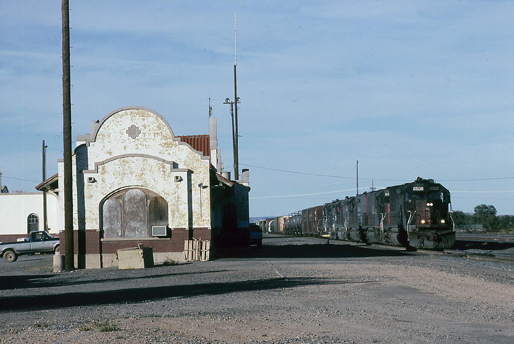| Postscript I only worked in Tucumcari for a few more weeks, until July 31, before traffic slowed and I was bumped off of my regular job on Sammy's caboose. I learned that I finally had enough seniority (after three years) to again hold the freight brakeman's extra board in San Francisco, so the family and I returned home. Unlike other parts of the SP, Winter was the busy time in the Southwest, so we fully expected to return to New Mexico in a few months, after I was cut-off (furloughed) in San Francisco. We even left some of our stuff with our landlord, Sammy's niece. This was not to be, because about a month later, the company accepted my application to go firing in Dunsmuir. Up there, I saw the change from train orders to DTC on the Syskiyou line as well, but since there usually was only one train working below Ashland (my seniority district) at any given time, the transformation was not dramatic as it was out there in the wilds of the high desert. NEW 9-29-2022: I have not visited Tucumcari in the nearly four decades since, so I have depended upon others to record the decline and rebirth of the old depot. By UP merger time the depot was in rough shape, as seen immediately below on September 30, 1996, 19 days after SP ceased to be. Note that the former Rock Island Amarillo Main track and the depot house track - as seen occupied by locomotives at page top - are gone. But, while down, the depot was not out. In 2002 UP deeded the structure to the city; in 2008 efforts began to repair spruce up the place; in 2014 the Tucumcari Railroad Museum was incorporated. Today (see second below) the depot hosts a variety of exihibits recalling past glories as it approaches 2026, its 100th anniversary. Note that a puddle of water occupies the pedestrian crossing over Highway 54. It was at this precise spot in 1984 that another fellow and I rescued a woman from her partially submeged Volkswagon Beetle during a flash flood. |