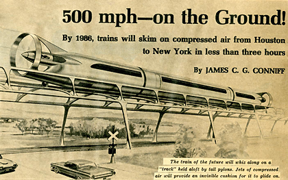 | For instance, we lament that his cognitive infirmities apparently kept him from apprising himself of an even more fantasmic proposal to whisk people from here to there - at 500 mph, no less. Staff does not know the particulars of this device (or its name) beyond what can be determined from the clipping below. We would guess that the image is from the pages of Mechanix Illustrated, the authoritative, but now defunct, purveyor of the future as applied to everyday living. Among other things, MI prepared us for the atomic-powered butter knives and underwear that are ubiquitous today. The key feature of this train was not its overall design, which we judge was inspired by a photo of a collision between two Marklin Rail Zeppelin toys, or alternately, a sexual nightmare. Rather, its big selling point was its use of a compressed air cushion to replace wheel to rail contact. This should have put construction funding over the top, given that compressed air tends to be very hot and is in heavy use in the halls of Congress. For the lack of a name, we shall dub it the Marklin 500! |
