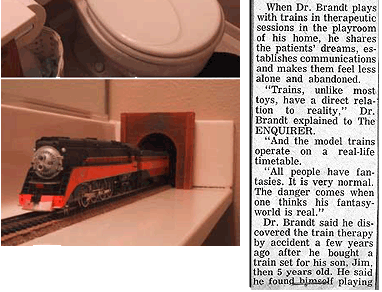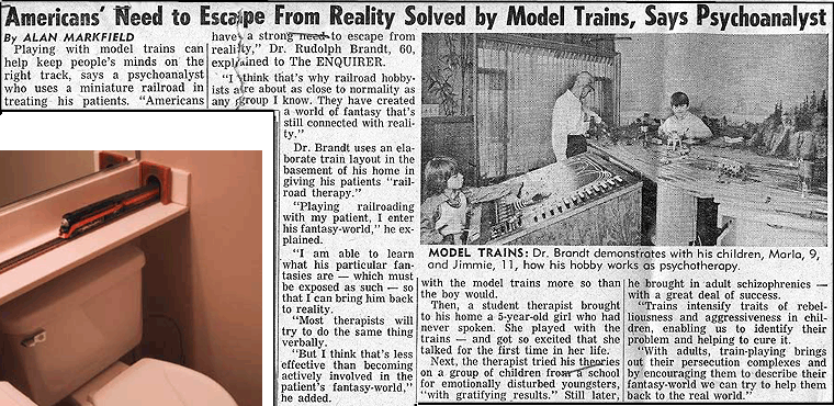 By way of documentation: A fellow engineer (thanks, Howie!) sent me the toilet pic without identifying the proud owner of this model railroad. If it's somebody that I work with, I don't want to know. Back in about 1971, by dear Aunt Gladys forwarded to me the article, which she had clipped from a Dallas newspaper. I believe that, at the time, my family was engaged in a desperate attempt to legitimize my peculiar behavior, and that they eventually gave up. - E.O. |