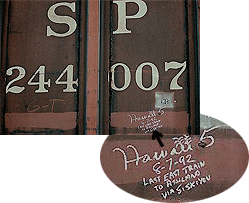 (above) Engineer Al "Double A" Marske labeled me "Hawaii 5" when I was a young SP fireman in Dunsmuir, due to my penchant for Hawaiian shirts. So in hobo tradition I came up with a (crudely drawn) moniker for the day's trip, which I scribbled on a few boxcars and bulkhead flats.