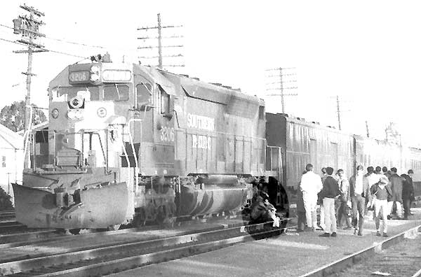 Check out the little so-and-so scrunched-over on the platform at College Park (San Jose, CA) as the Coast Daylight whizzes-by at 40 m.p.h. Such displays of idiocy are common down at the tracks and accordingly send engine crews into conniption fits. It wouldn't surprise staff to learn that - assuming this dope didn't succumb to the Law of Natural Selection - 35 years later his son is one of the current crop of Bellarmine High School boys that occasionally perform such shenanigans. This is a major safety issue brought on by the introduction of the diesel to railroading. While the engineer has the sander and whistle at his disposal, neither is a consistently effective tool in warding-off the worst bone-heads. It was a different matter with the steam engine. One judicious opening of the blow-down valve per semester was about all that it took to keep the little devils W-A-Y back. Kindly refer to the Wx4 SimUphotoTM, below. We at Wx4 think that this evidence should be compelling enough for America's railroad CEO's to order the immediate re-introduction of the steam locomotive to their rails. Otherwise, we shall be forced to conclude that their talk of safety is merely hollow poppycock. Boys, if you need follow-up work to convince your boards of directors, you can find us down at the Pub N Grub. |