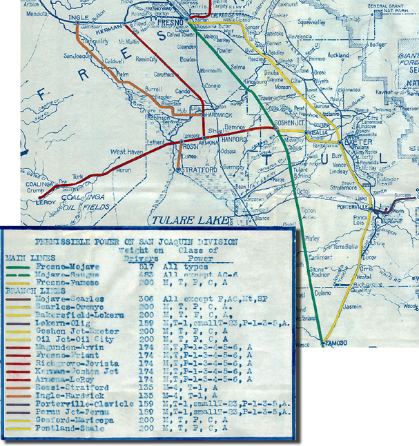 These clippings come from one of the more interesting SP maps that we have run across lately. It appears to be a paste-up for reproduction, because the legend seen here was literally pasted onto the map. More remarkable is what it in essence says: SP's 4-4-0's were banned from Coast Division branch lines, save Tres Pinos and Surf. Frankly, Staff is stumped as why this was so, especially given that, by this time, SP's 4-4-0 roster consisted of a handful of E-23's, mostly assigned to San Joaquin Valley branch lines and secondary passenger runs. The ban was almost a moot point. So, what gives?