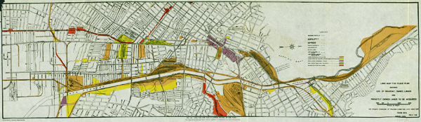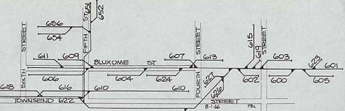 Fourth, we have scanned 11 detailed SP maps of major California and Oregon industrial areas, circa 1916-28. The originals range upwards to a nominal 3x6 feet. Below is a clipped portion of one at much reduced scale.