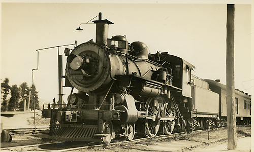 Unlike the previous photo, this one is pretty easy to scope out, since the description by photograher Gerald Best tells us that #1433 (later: #1500) is at Porterville on March 5, 1933. Note the sun angle, steam pipe connected to the dome, capped stack and baggage-RPO coupled to the tender