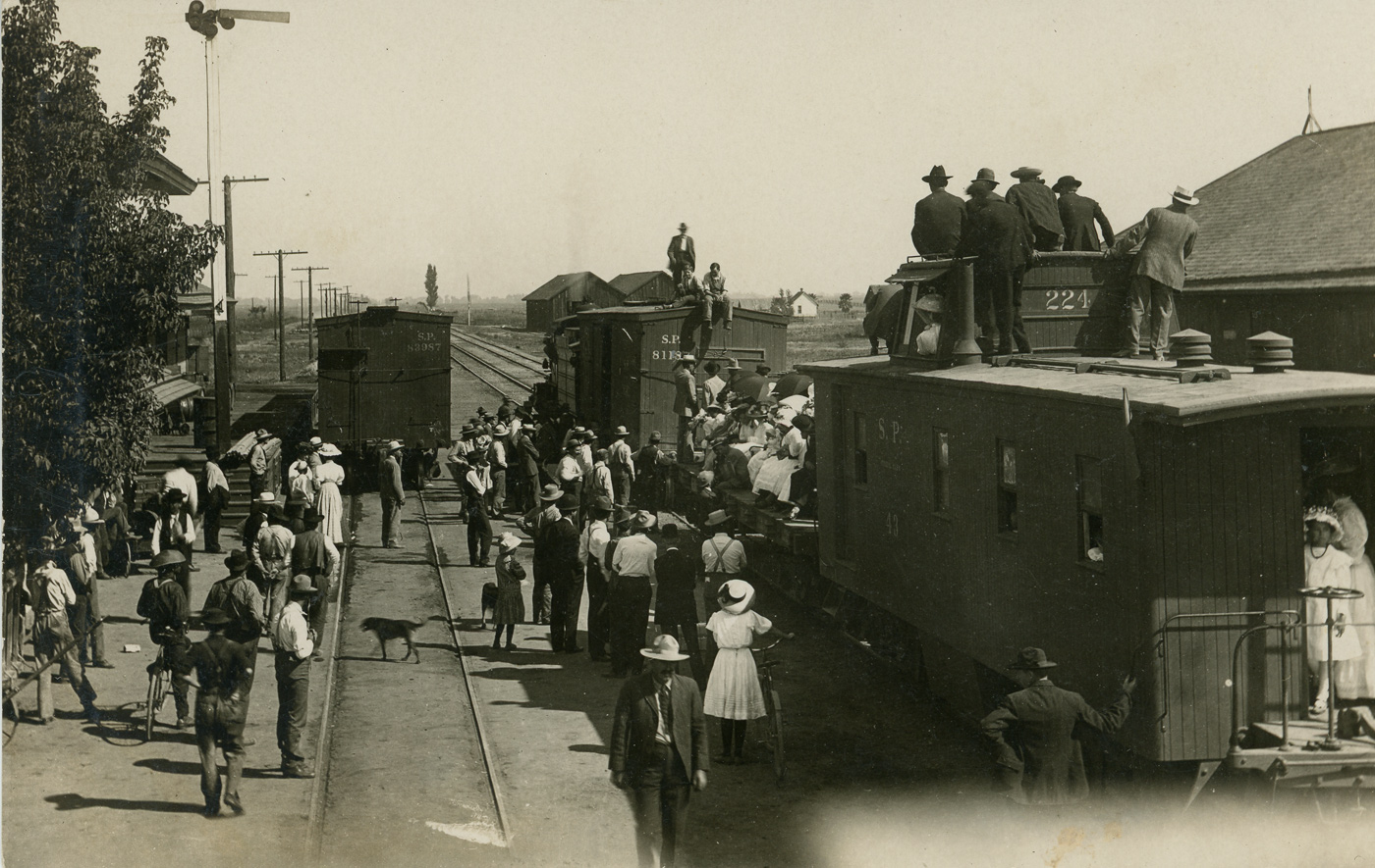 Whatever the event it was, it exemplified a time when railroads were integral to small town life, and catered to 'the locals' in befitting home spun fashion. The big city Main Office held minimal sway here. The occasion of this humble little excursion may have been Easter, Mayday, or merely a daisy picking expedition. Regardless, the preponderance of fedora hats on the gents, rather than straw boaters, suggests that this was a celebration of spring. And the shirtsleeves in those formal times indicate a warm day at that. The festivities may have been held at one of Southern Pacific's Great Central Valley towns, perhaps on the San Joaquin Valley's West Side, but why should we care?