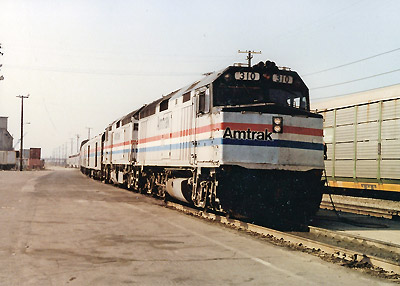 | My notes indicate that this was the OALAT coming off the Mulford at Santa Clara, but I doubt that as the train is on the eastbound main and the crossover from the westbound to the easbound is to my east (behind me). An overexposed image shows a Kodachrome in the lead. Note the cut off track in the foreground, the former Santa Clara depot house track, 1988. |