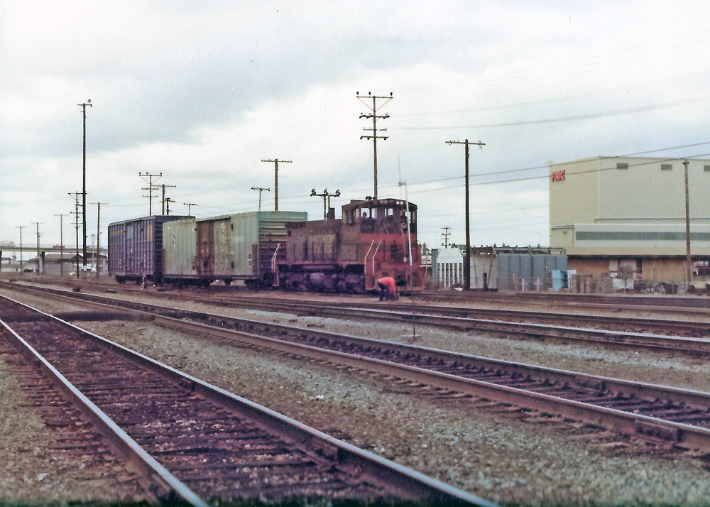 | MP15 kicking cars at the west end of the yard, 1975. |