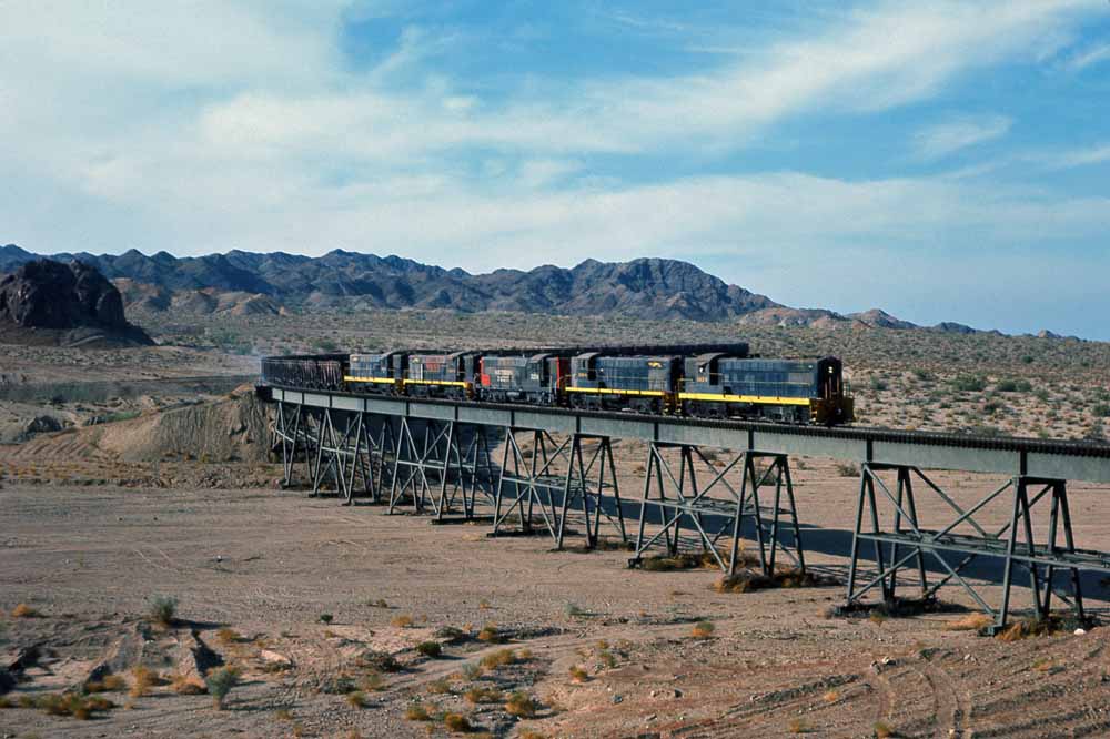 Charles visited the Eagle Mountain at least twice and maybe three times. During his first one or two visits he found the Baldwins still active, though looking tired and still carrying their original numbers. We'll start with a map of the railroad and then two of his Baldwin shots, first of four Kaiser Baldwins spliced by leased Southern Pacific AS-616 #5254 crossing the large steel bridge that carried the railroad over a normally dry wash, and then a going away shot of the 1012B and 1010B approaching a grade crossing.