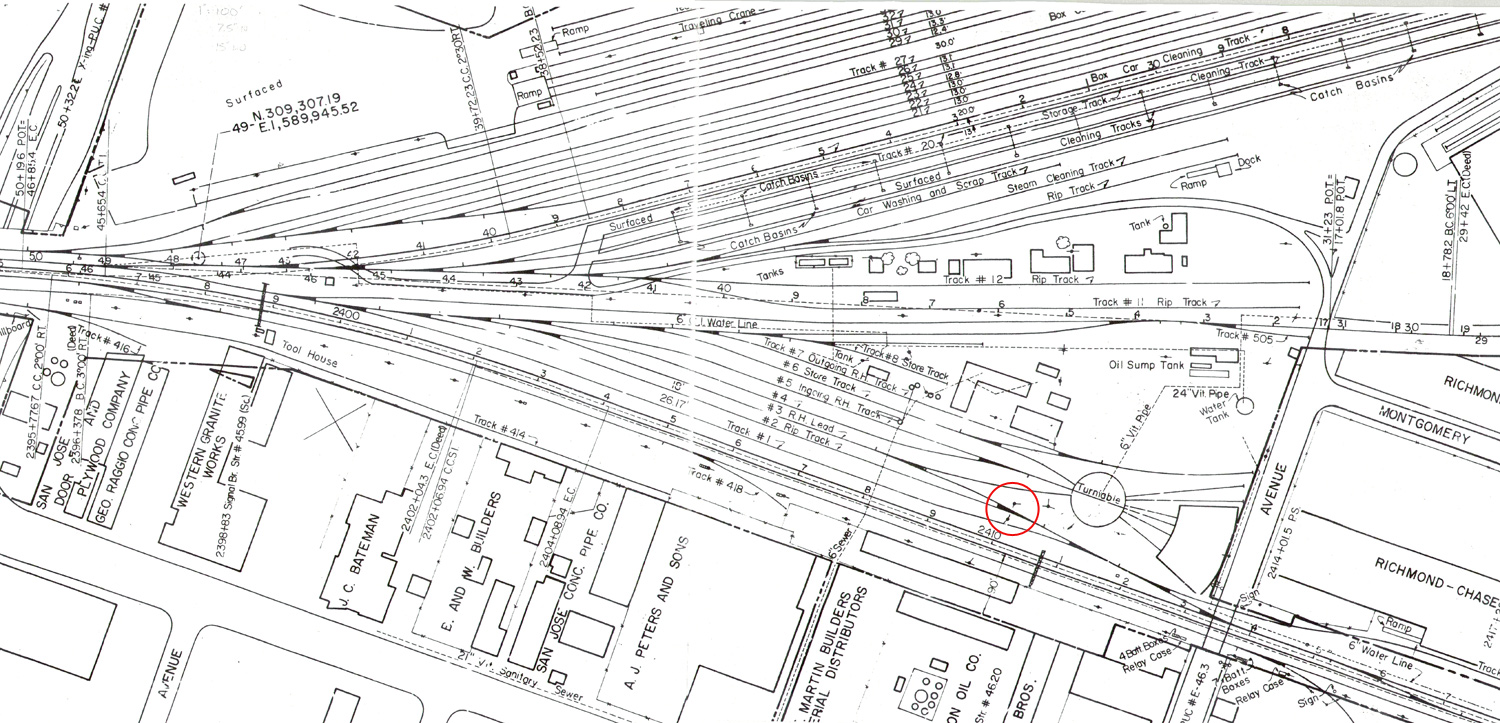 The location of the 'rope poles' shows inside the red circle on the SP circa 1960's drawing above. Note the switch controlled by College Park Tower sitting in the middle of Lenzen Avenue. Cahill depot is to the right, outside of the image. Prior to the 1935 line change, the area only held one main track, the Santa Cruz , or "Mountain" Main. Rob Sinclair Collection