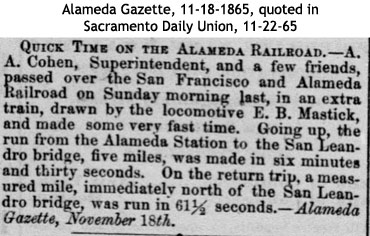 Pure steamcar speculation: No direct evidence has come to light concerning which Market Street Railroad steam car went to SF&O, or when. Market Street RR's steamcars became surplus in 1865, when it was converted to a horse railroad. A 11-16-66 SDU report says that the steamcar was already set aside as unserviceable when purchased by SF&O, which might mean that it could have come before 1865 (why purchase an unserviceable one, when other operational cars were available?), but likely it meant editorial sour grapes. Also supporting a pre-1865 purchase is that it seems that SF&O's only locomotive (until the Oakland was constructed) was the Vulcan - which would have needed at least an occasional backup, given the road's isolation.