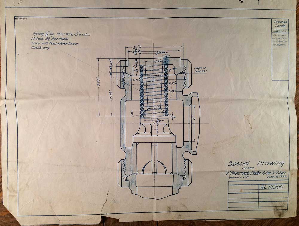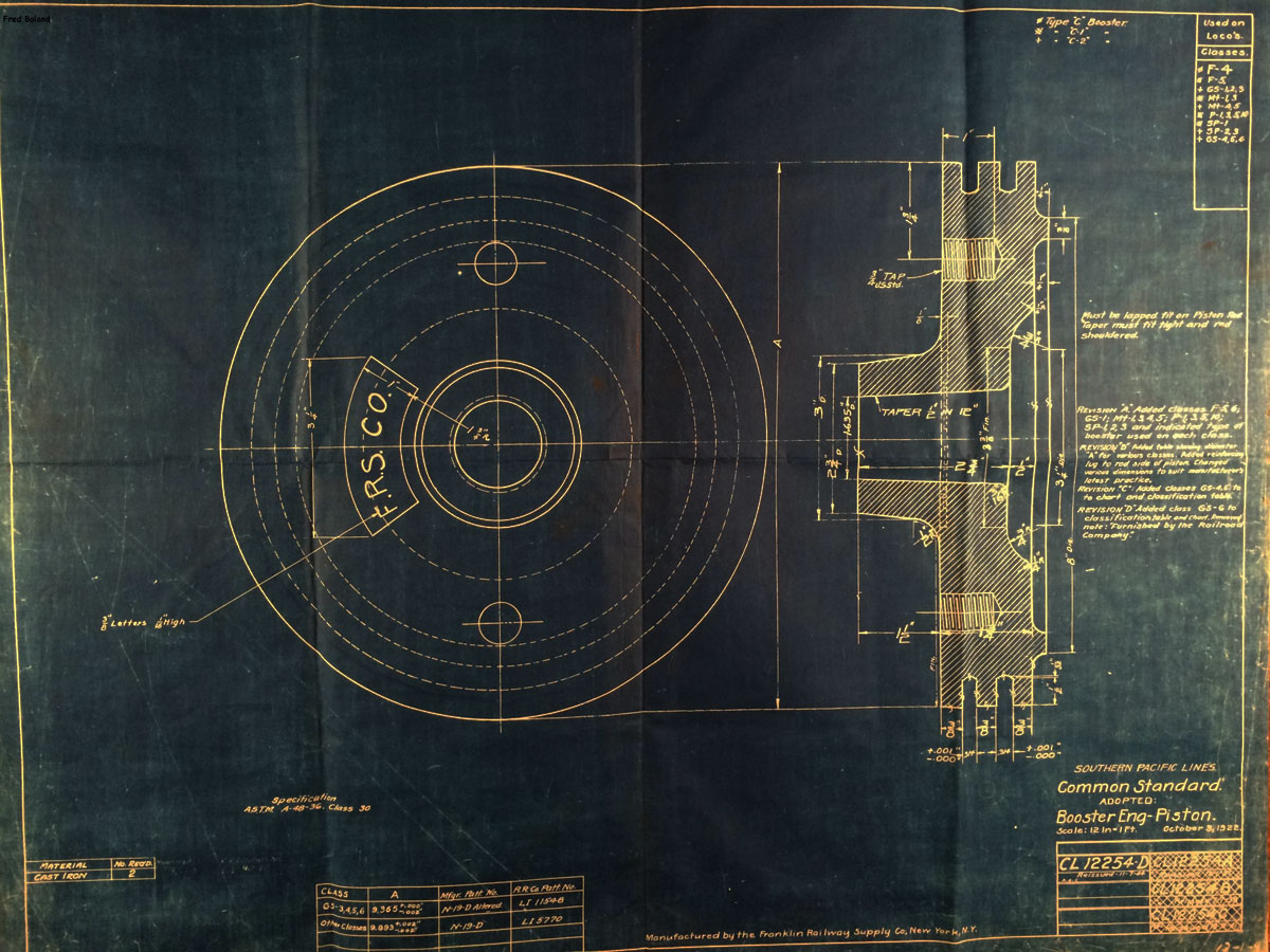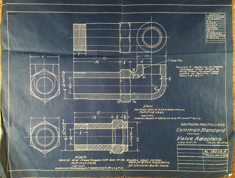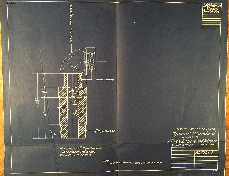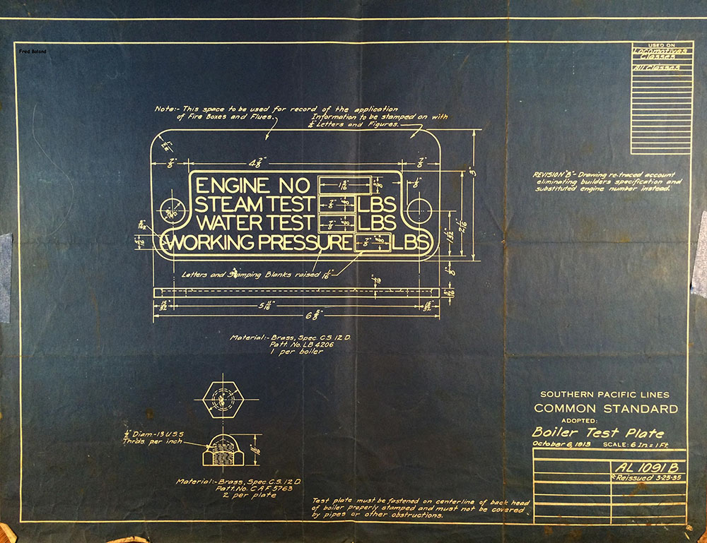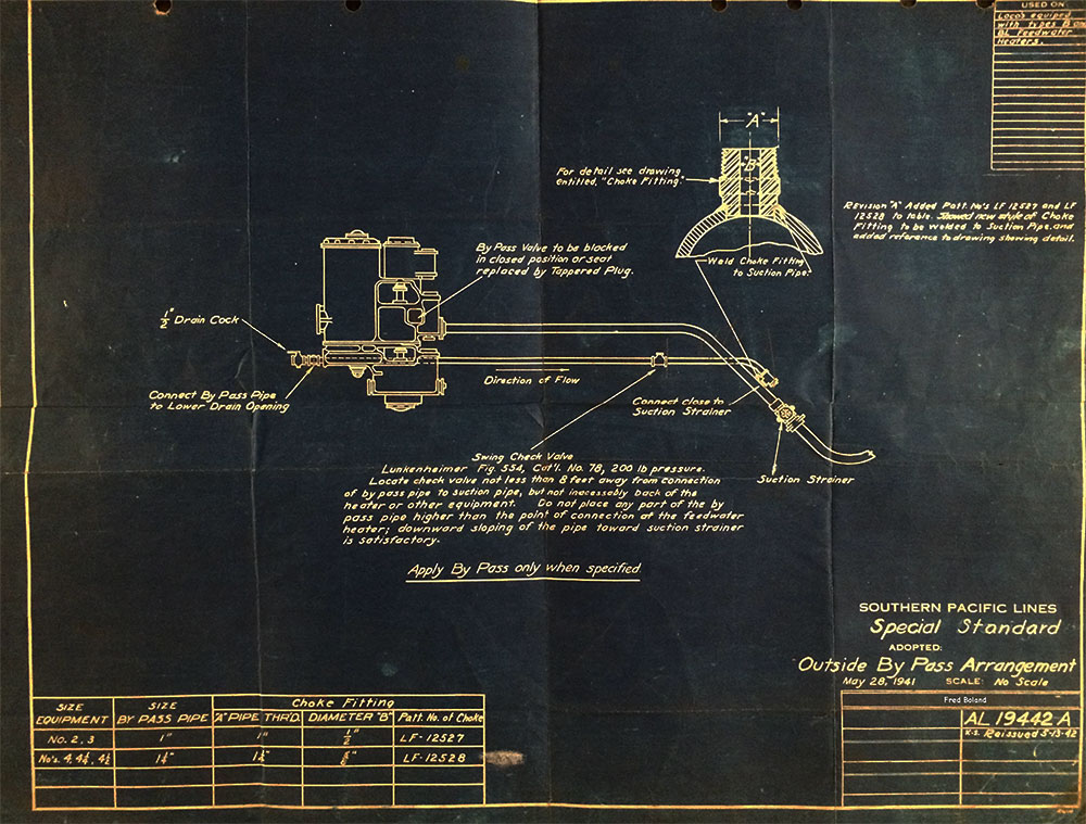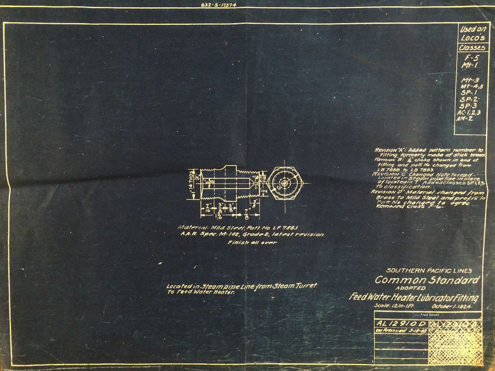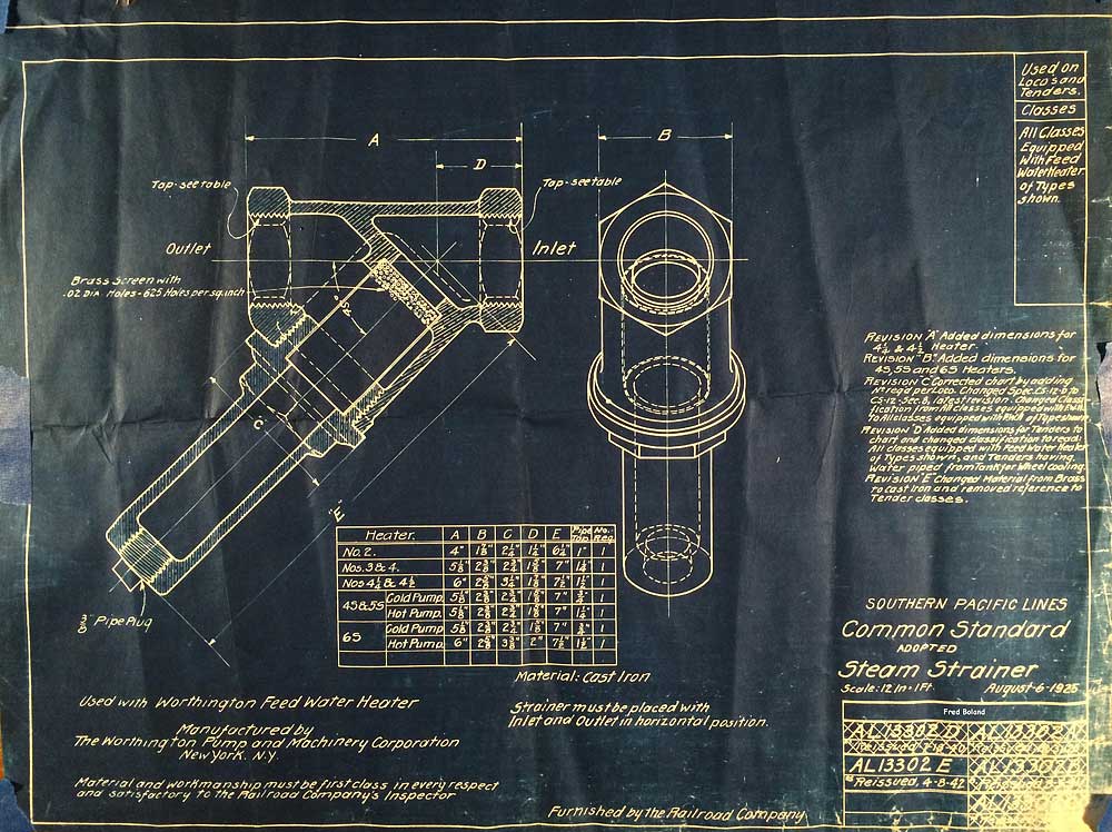 In 1958, after steam was done on Southern Pacific, somebody decided that the volumnuous collection of no-longer-needed steam locomotive drawings filed away at San Francisco's Bayshore Shops could be eliminated. Shop personnel thus began to fill a dumpster with many hundreds of drawings, much to the distress of the late Machinist Fred Boland. By then, Fred had accumulated nearly 40 years of Bayshore service, and these drawings held sentimental value for him, since he had worked with them throughout his long career. But moreover, he recognized their historical significance. Figuring that nobody cared, he began collecting them for preservation. Unfortunately, in that regard he was wrong. When his foreman discovered what Fred was doing, he ordered him to cease his efforts - these were "company secrets" that had to be destroyed, lest they fall into the wrong hands. Never-mind that they were obsolete, and that many of them were essentially those of suppliers that had been redrawn by SP draftsmen to conform to its Common Standard drawings.