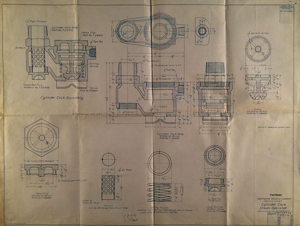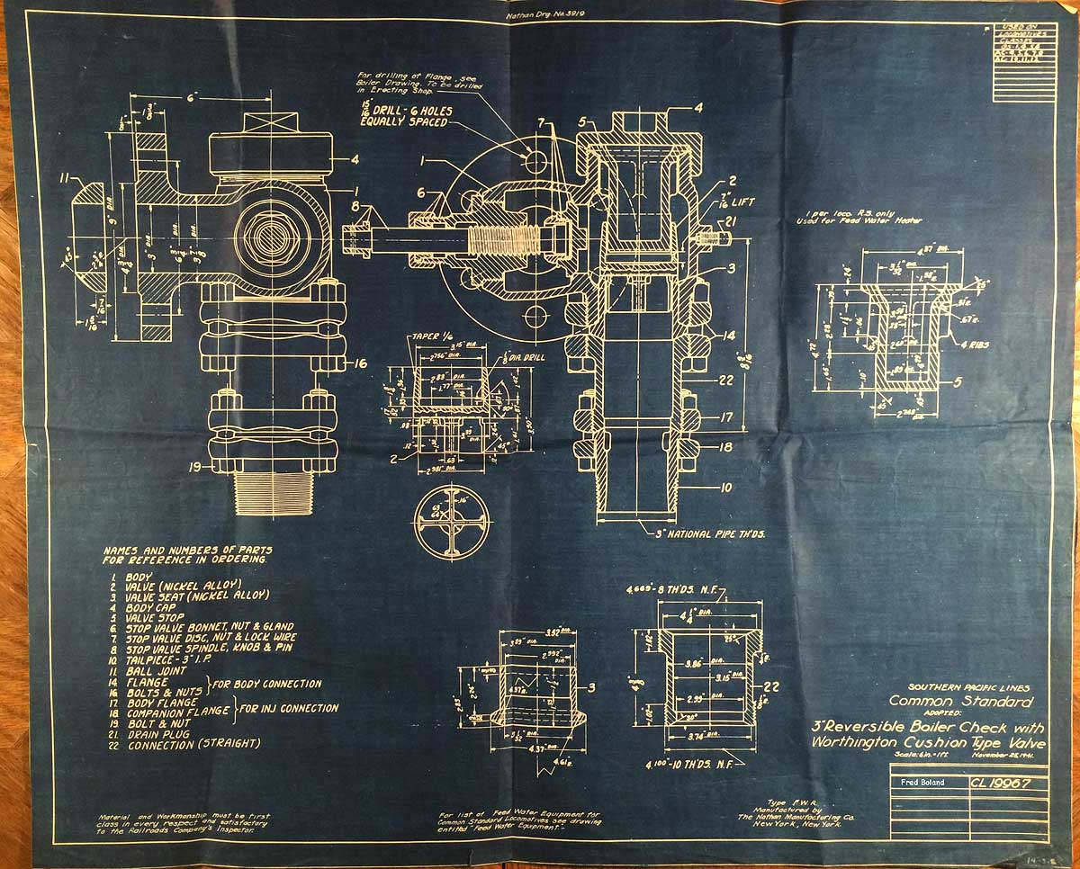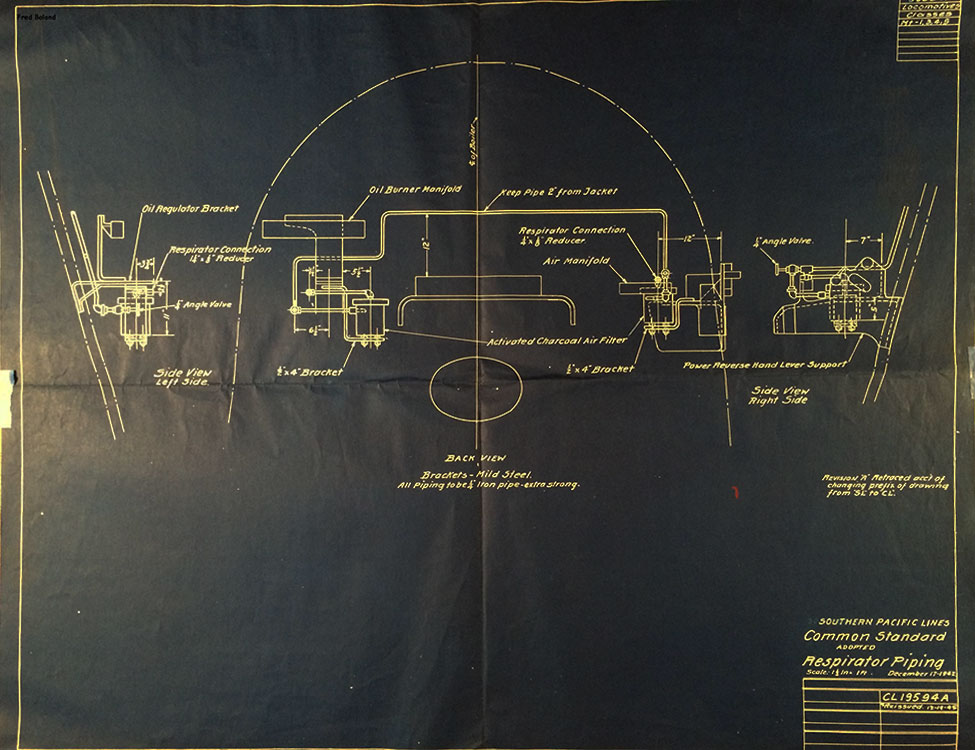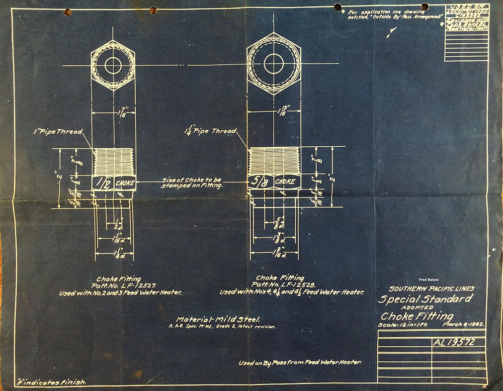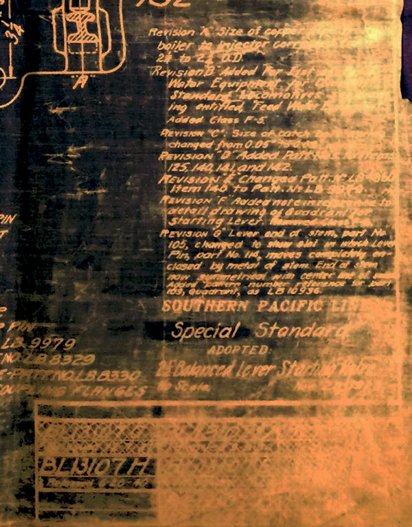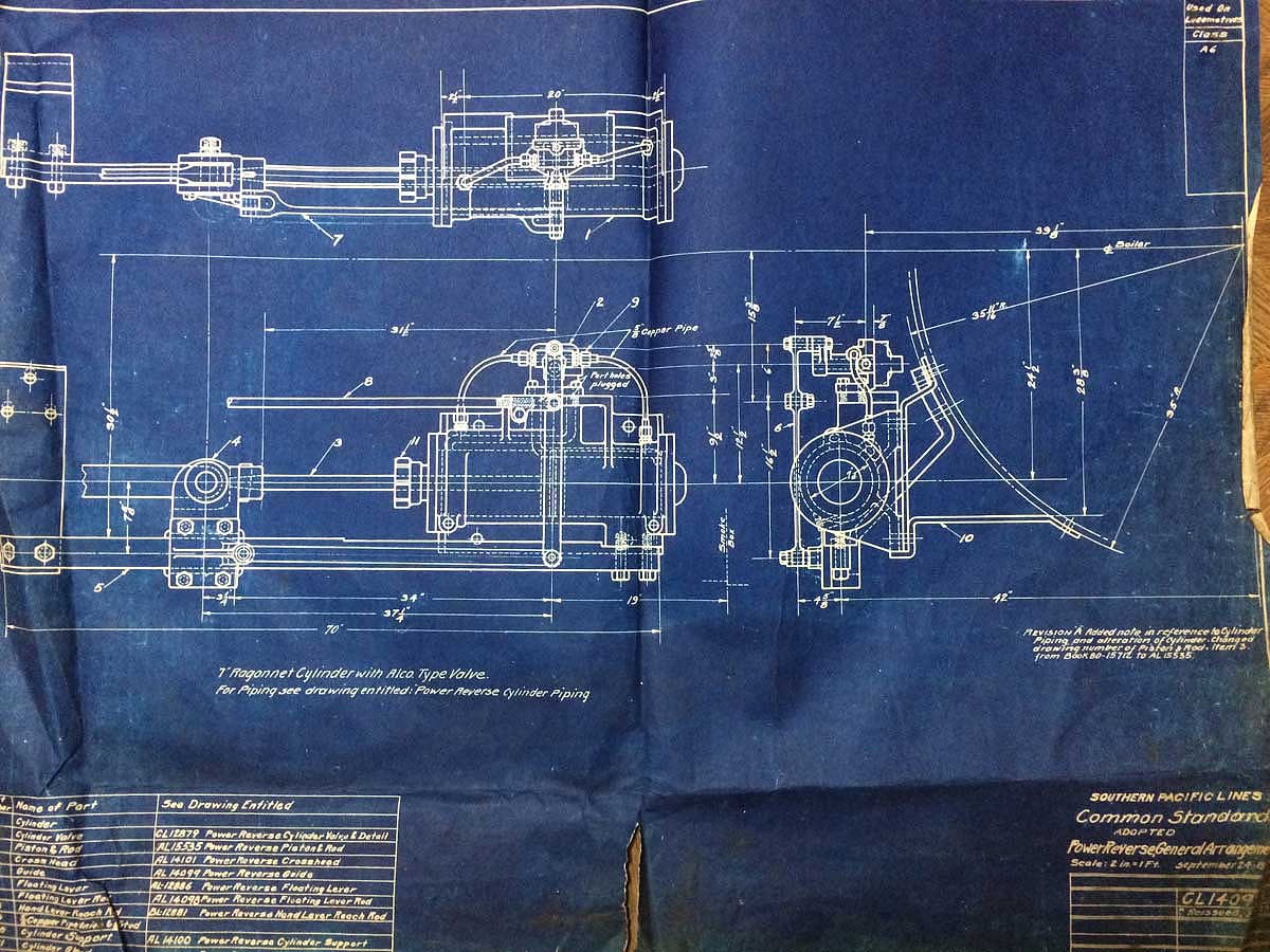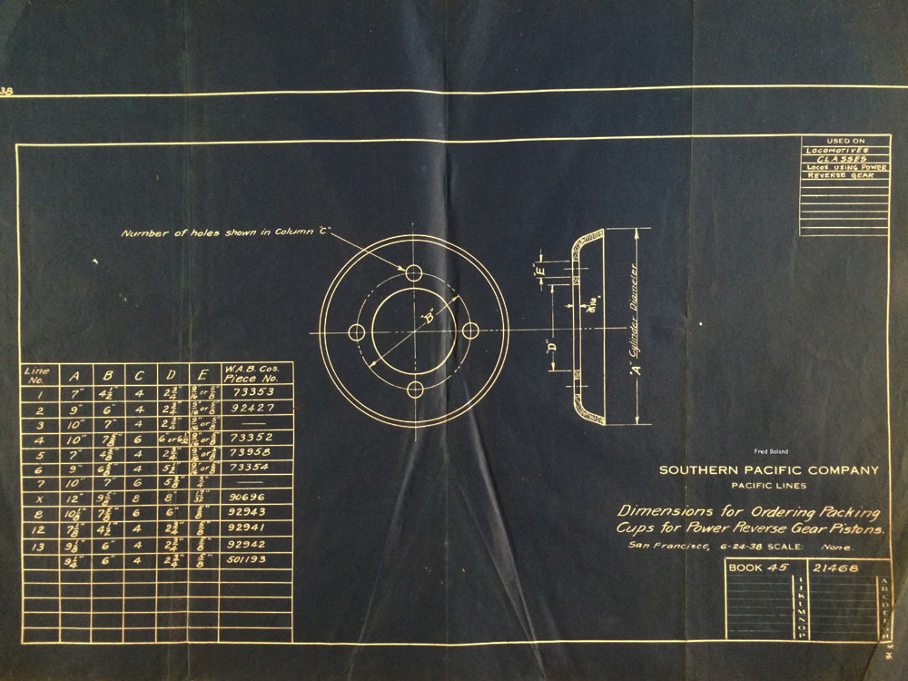 In 1958, after steam was done on Southern Pacific, somebody decided that the volumnuous collection of no-longer-needed steam locomotive drawings filed away at San Francisco's Bayshore Shops could be eliminated. Shop personnel thus began to fill a dumpster with many hundreds of drawings, much to the distress of the late Machinist Fred Boland. By then, Fred had accumulated nearly 40 years of Bayshore service, and these drawings held sentimental value for him, since he had worked with them throughout his long career. But moreover, he recognized their historical significance. Figuring that nobody cared, he began collecting them for preservation. Unfortunately, in that regard he was wrong. When his foreman discovered what Fred was doing, he ordered him to cease his efforts - these were "company secrets" that had to be destroyed, lest they fall into the wrong hands. Never-mind that they were obsolete, and that many of them were essentially those of suppliers that had been redrawn by SP draftsmen to conform to its Common Standard drawings.