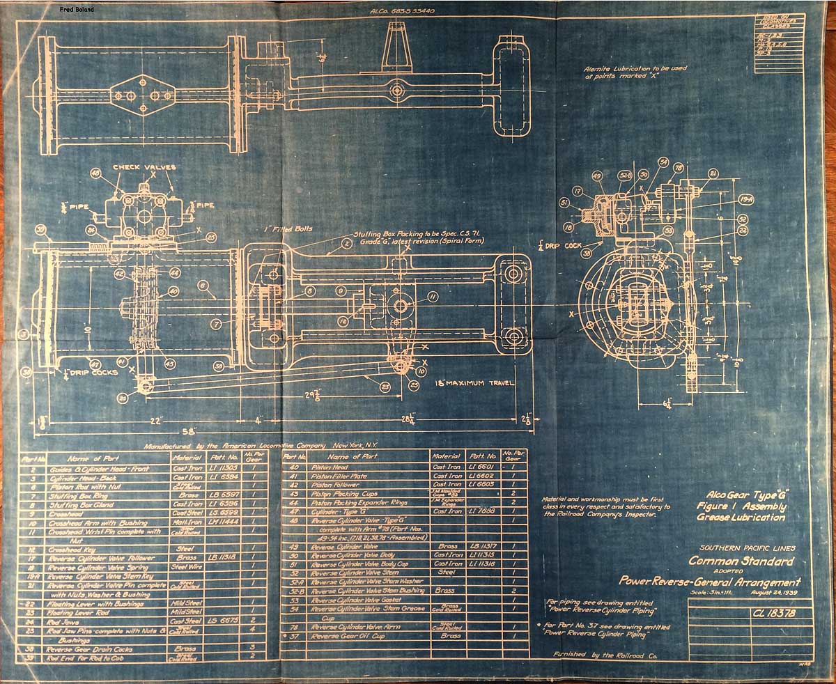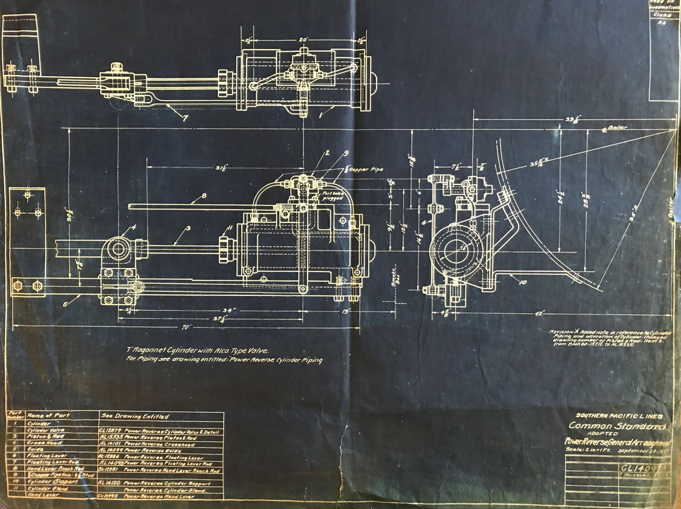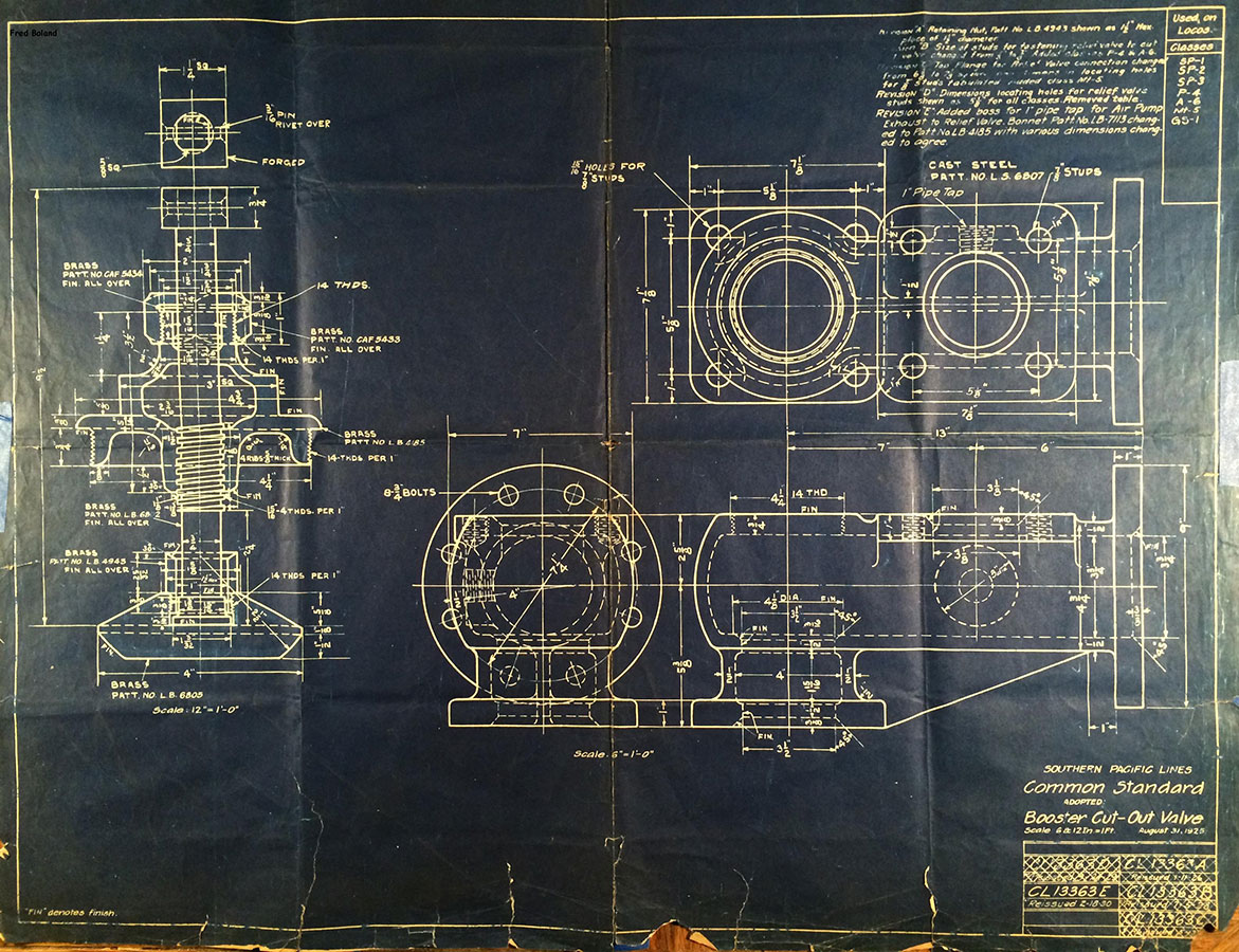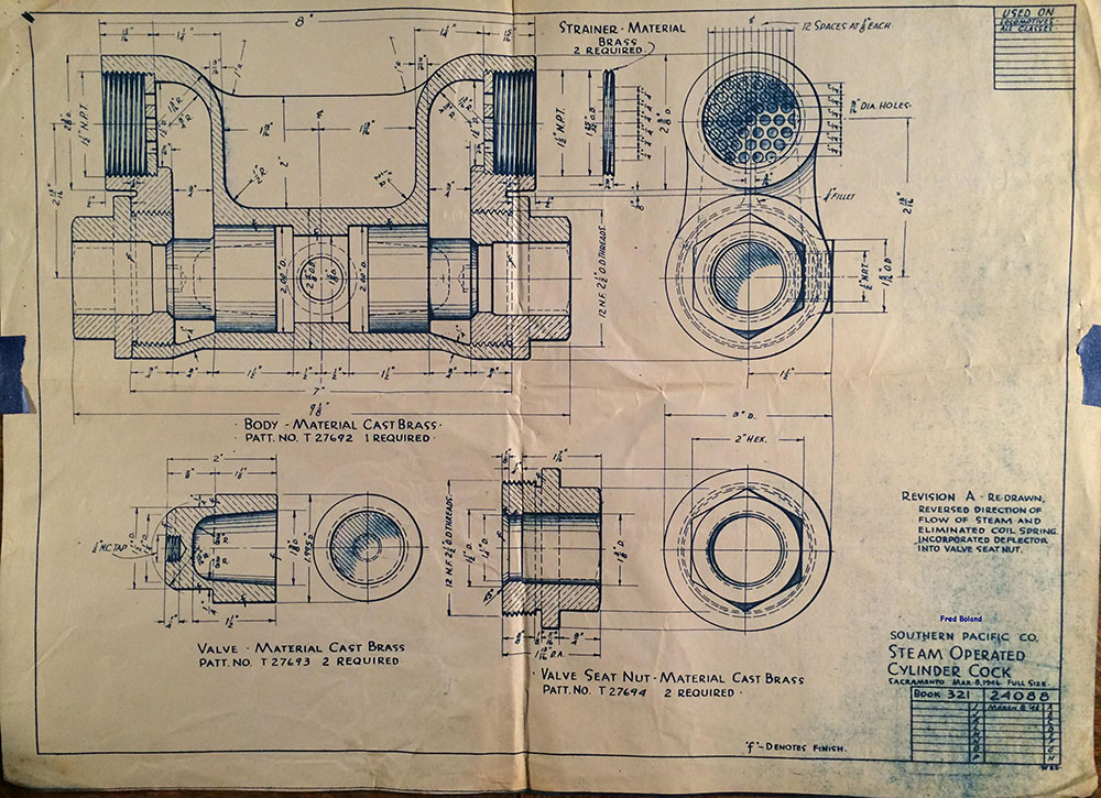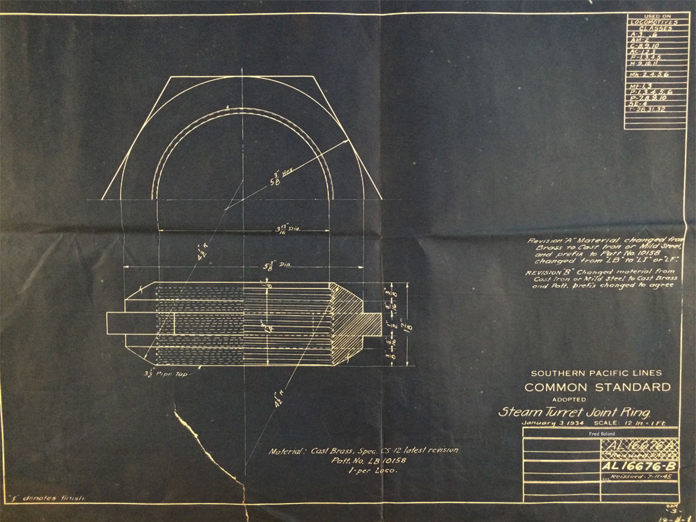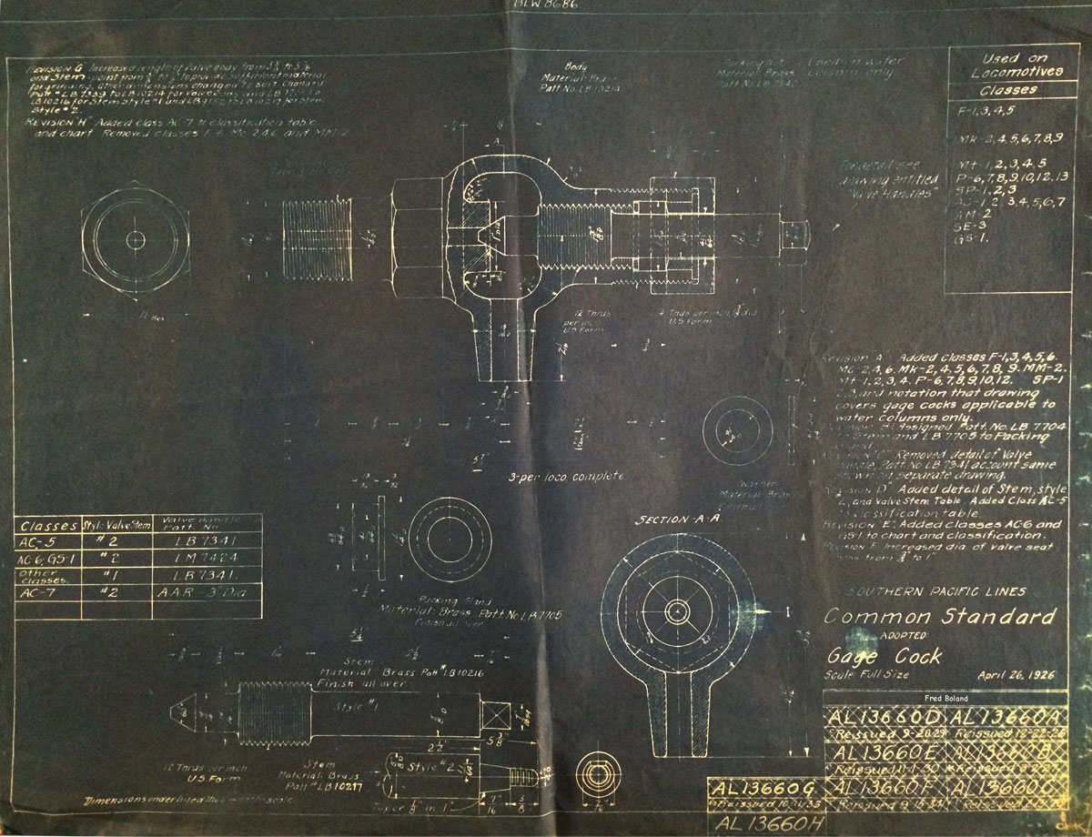In 1958, after steam was done on Southern Pacific, somebody decided that the volumnuous collection of no-longer-needed steam locomotive drawings filed away at San Francisco's Bayshore Shops could be eliminated. Shop personnel thus began to fill a dumpster with many hundreds of drawings, much to the distress of the late Machinist Fred Boland. By then, Fred had accumulated nearly 40 years of Bayshore service, and these drawings held sentimental value for him, since he had worked with them throughout his long career. But moreover, he recognized their historical significance. Figuring that nobody cared, he began collecting them for preservation. Unfortunately, in that regard he was wrong. When his foreman discovered what Fred was doing, he ordered him to cease his efforts - these were "company secrets" that had to be destroyed, lest they fall into the wrong hands. Never-mind that they were obsolete, and that many of them were essentially those of suppliers that had been redrawn by SP draftsmen to conform to its Common Standard drawings.
