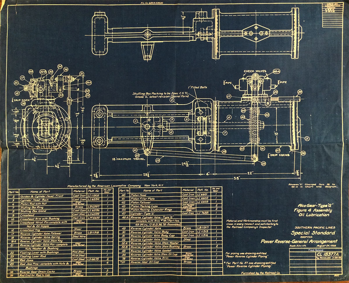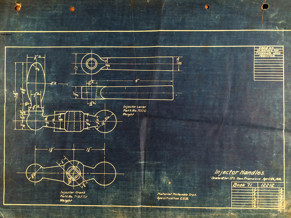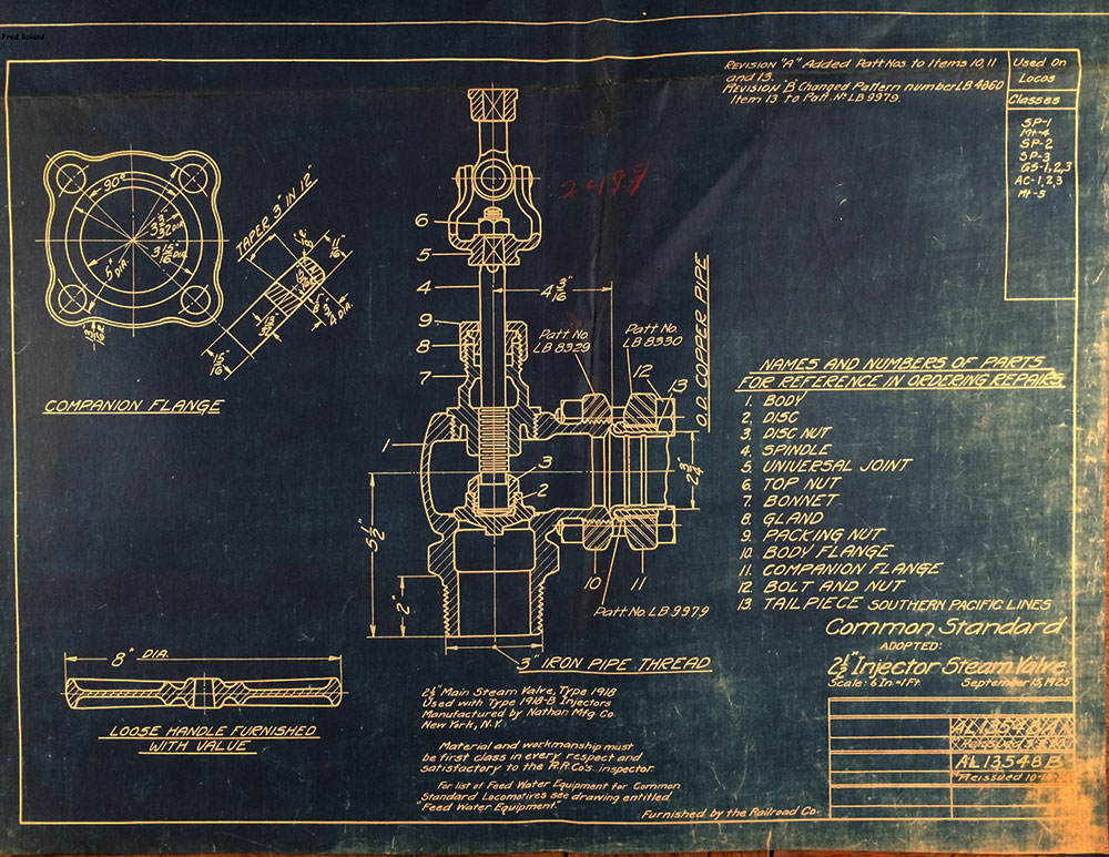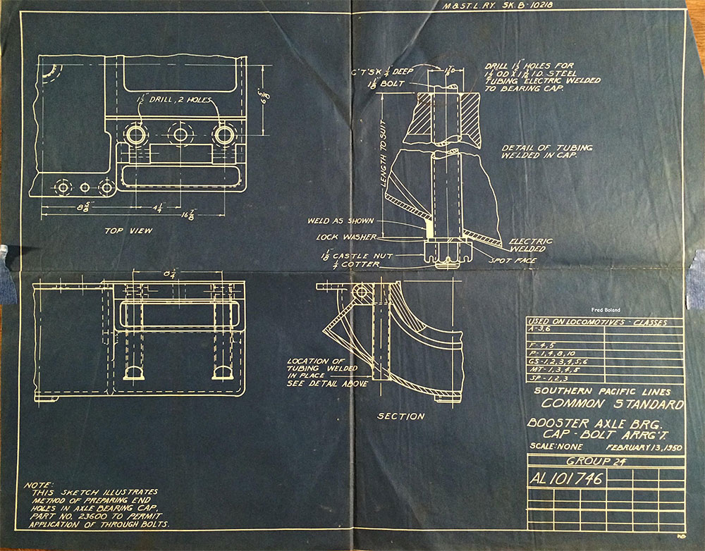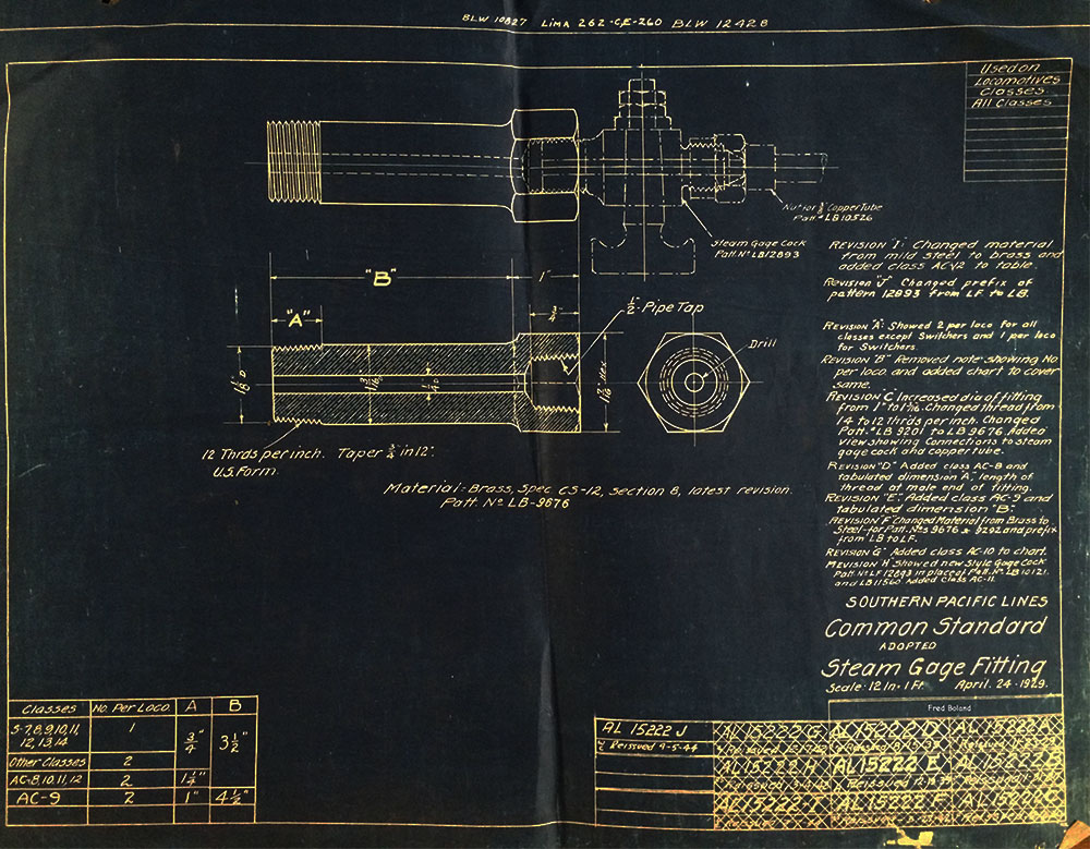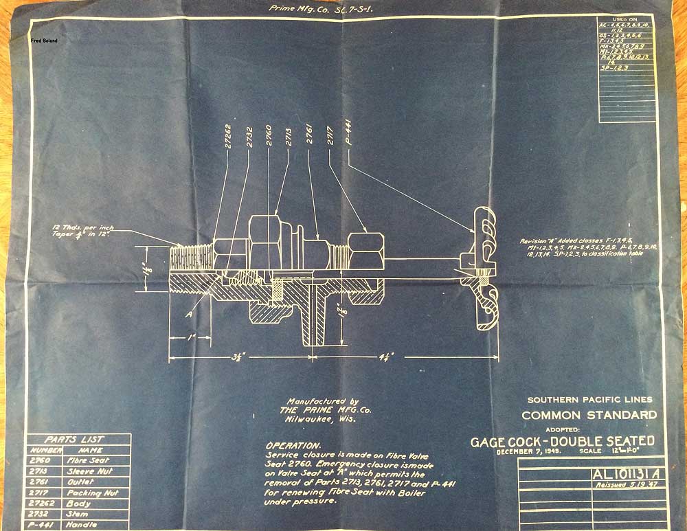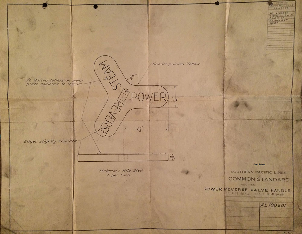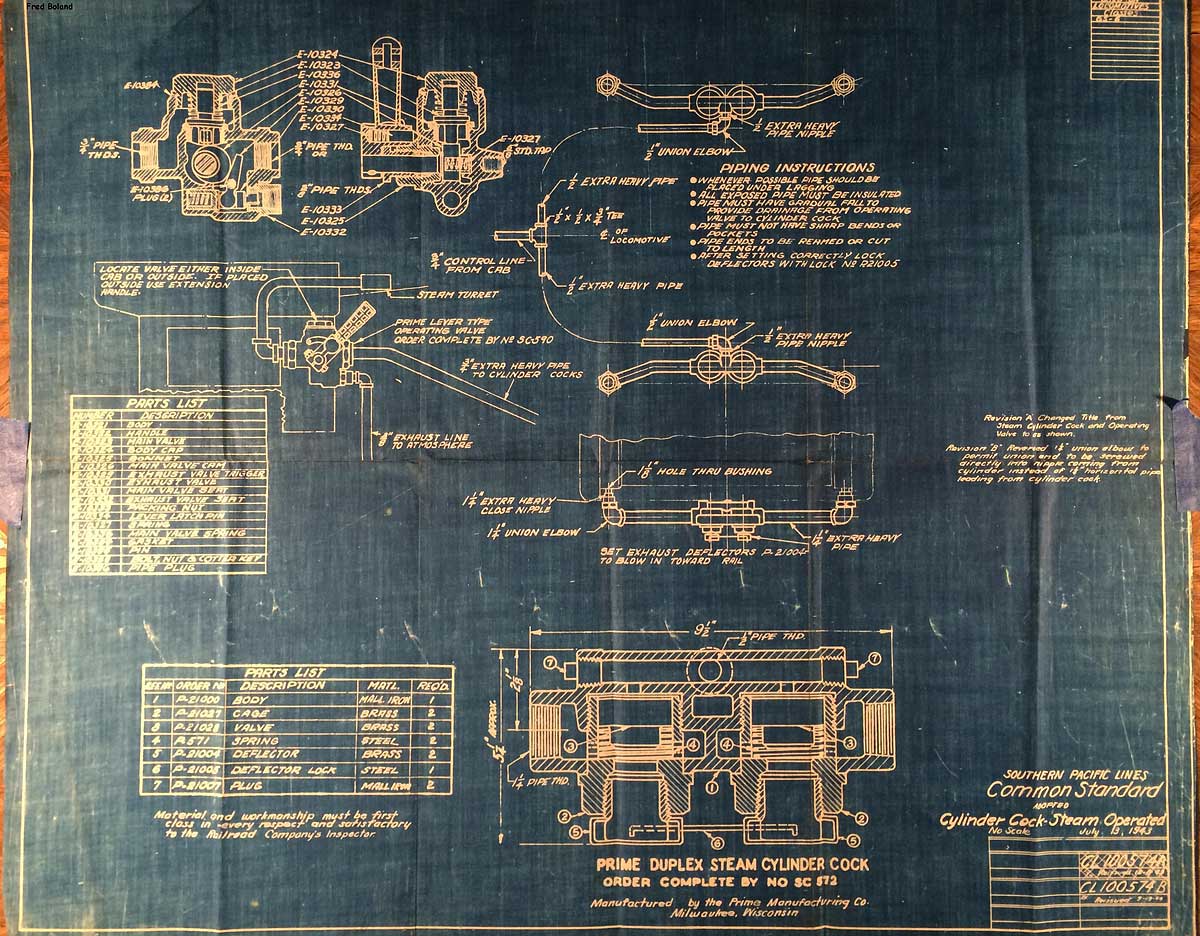 In 1958, after steam was done on Southern Pacific, somebody decided that the volumnuous collection of no-longer-needed steam locomotive drawings filed away at San Francisco's Bayshore Shops could be eliminated. Shop personnel thus began to fill a dumpster with many hundreds of drawings, much to the distress of the late Machinist Fred Boland. By then, Fred had accumulated nearly 40 years of Bayshore service, and these drawings held sentimental value for him, since he had worked with them throughout his long career. But moreover, he recognized their historical significance. Figuring that nobody cared, he began collecting them for preservation. Unfortunately, in that regard he was wrong. When his foreman discovered what Fred was doing, he ordered him to cease his efforts - these were "company secrets" that had to be destroyed, lest they fall into the wrong hands. Never-mind that they were obsolete, and that many of them were essentially those of suppliers that had been redrawn by SP draftsmen to conform to its Common Standard drawings.
