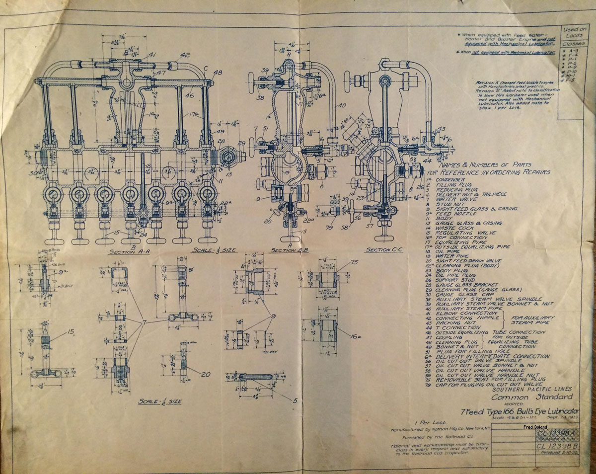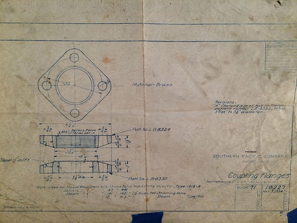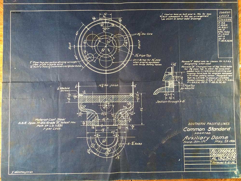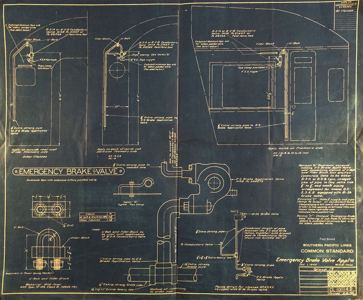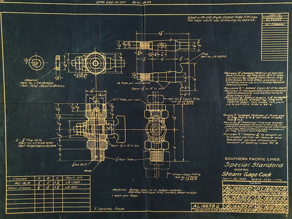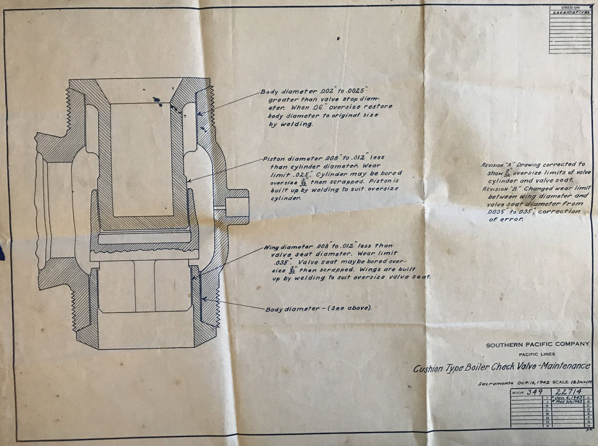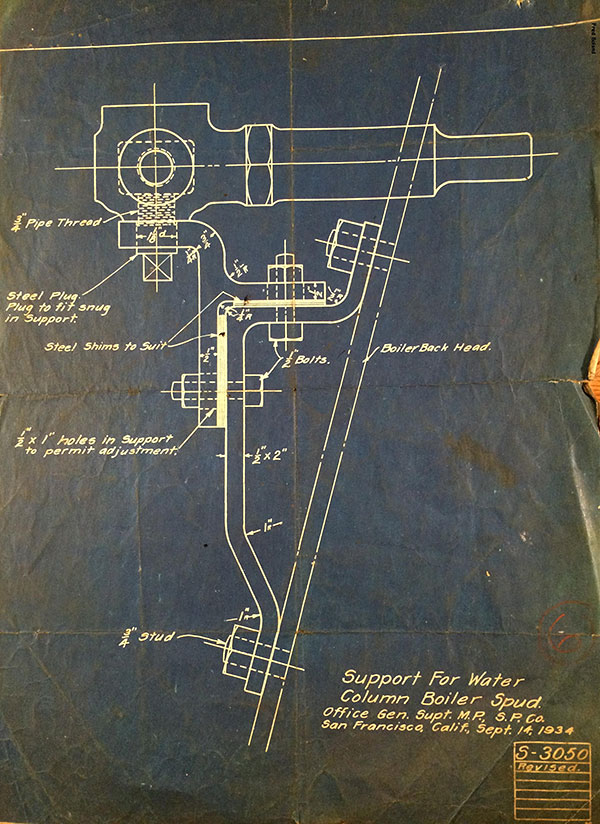 In 1958, after steam was done on Southern Pacific, somebody decided that the volumnuous collection of no-longer-needed steam locomotive drawings filed away at San Francisco's Bayshore Shops could be eliminated. Shop personnel thus began to fill a dumpster with many hundreds of drawings, much to the distress of the late Machinist Fred Boland. By then, Fred had accumulated nearly 40 years of Bayshore service, and these drawings held sentimental value for him, since he had worked with them throughout his long career. But moreover, he recognized their historical significance. Figuring that nobody cared, he began collecting them for preservation. Unfortunately, in that regard he was wrong. When his foreman discovered what Fred was doing, he ordered him to cease his efforts - these were "company secrets" that had to be destroyed, lest they fall into the wrong hands. Never-mind that they were obsolete, and that many of them were essentially those of suppliers that had been redrawn by SP draftsmen to conform to its Common Standard drawings.