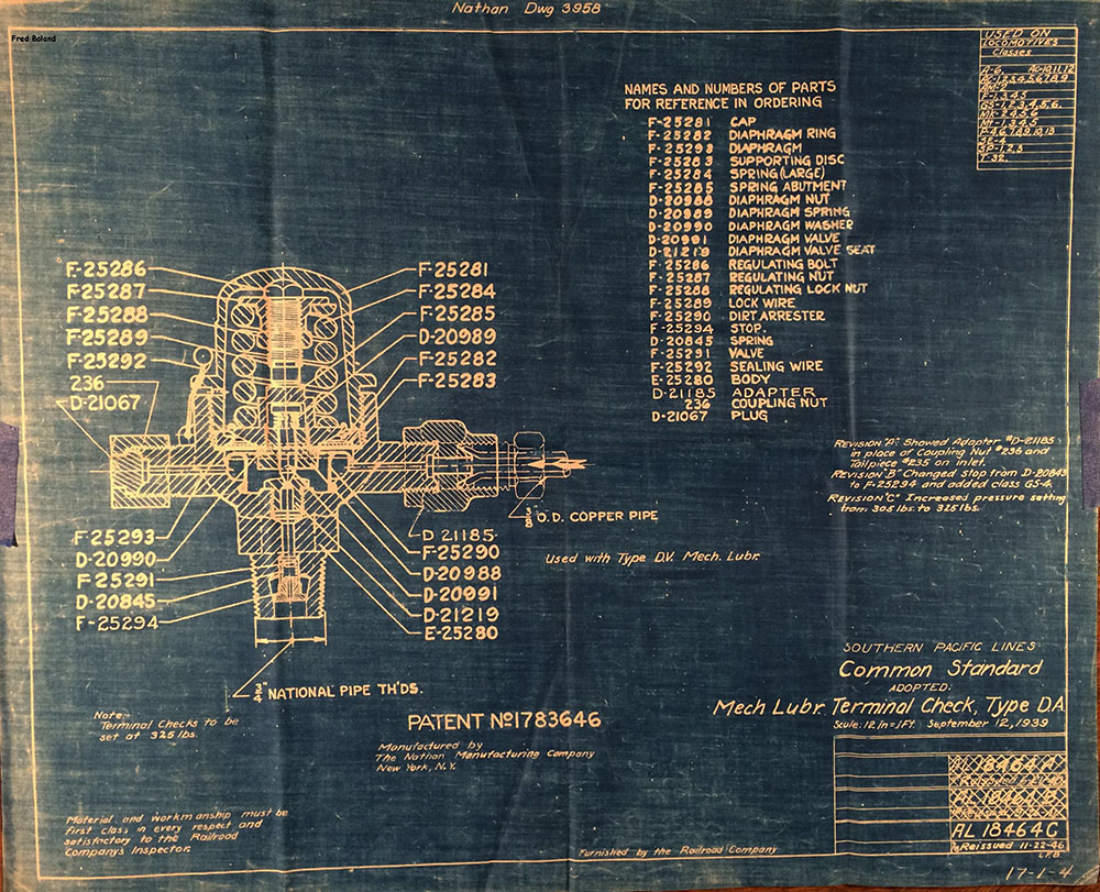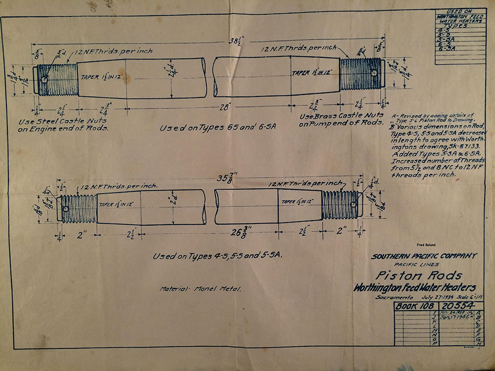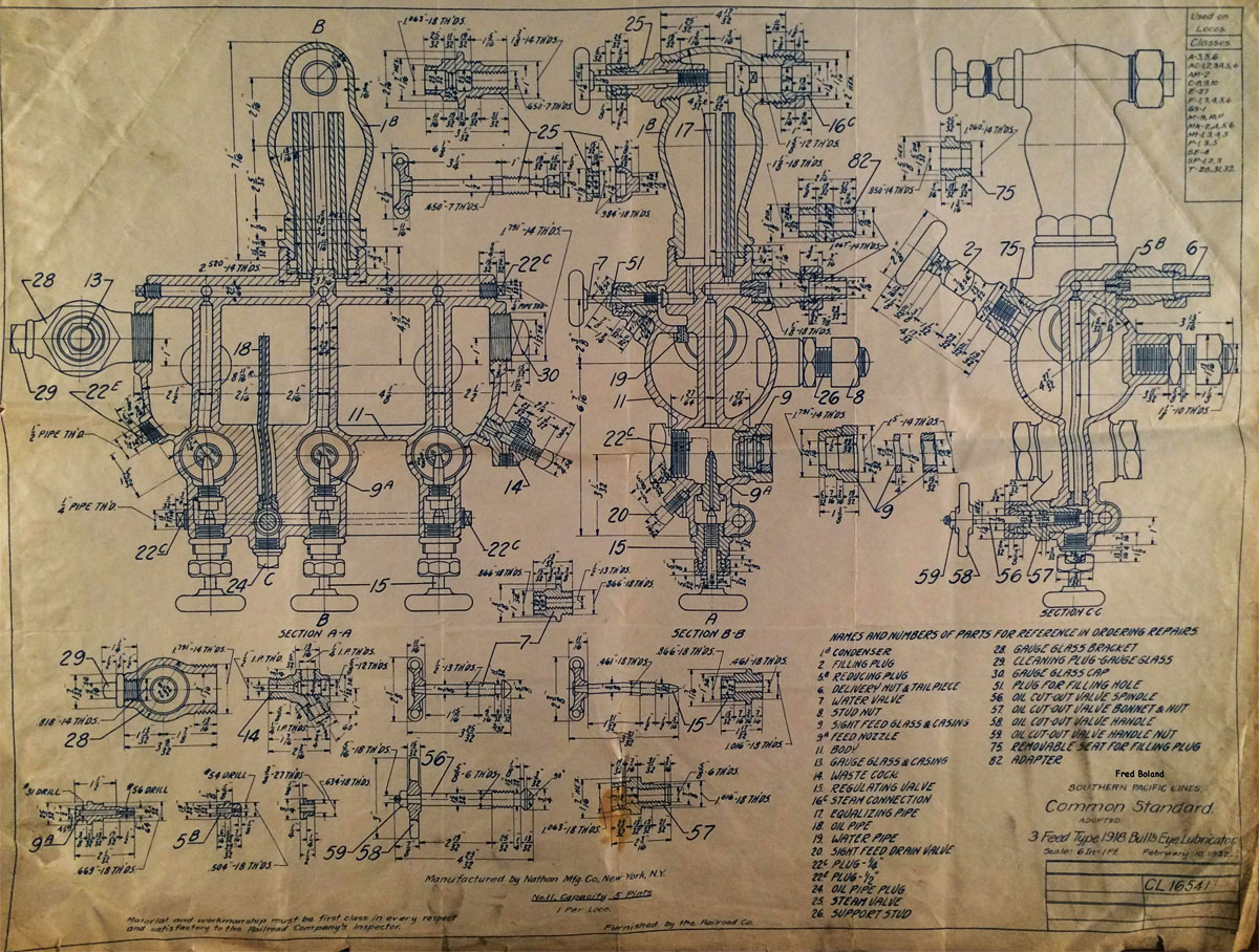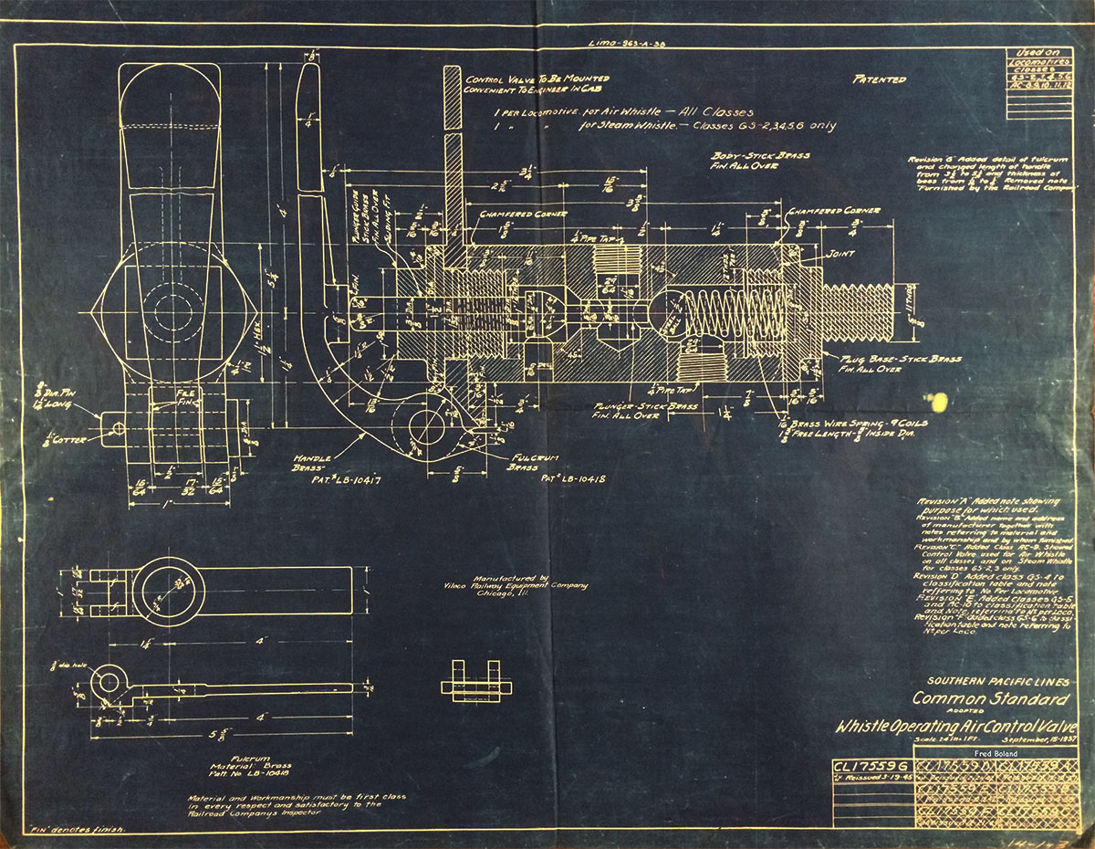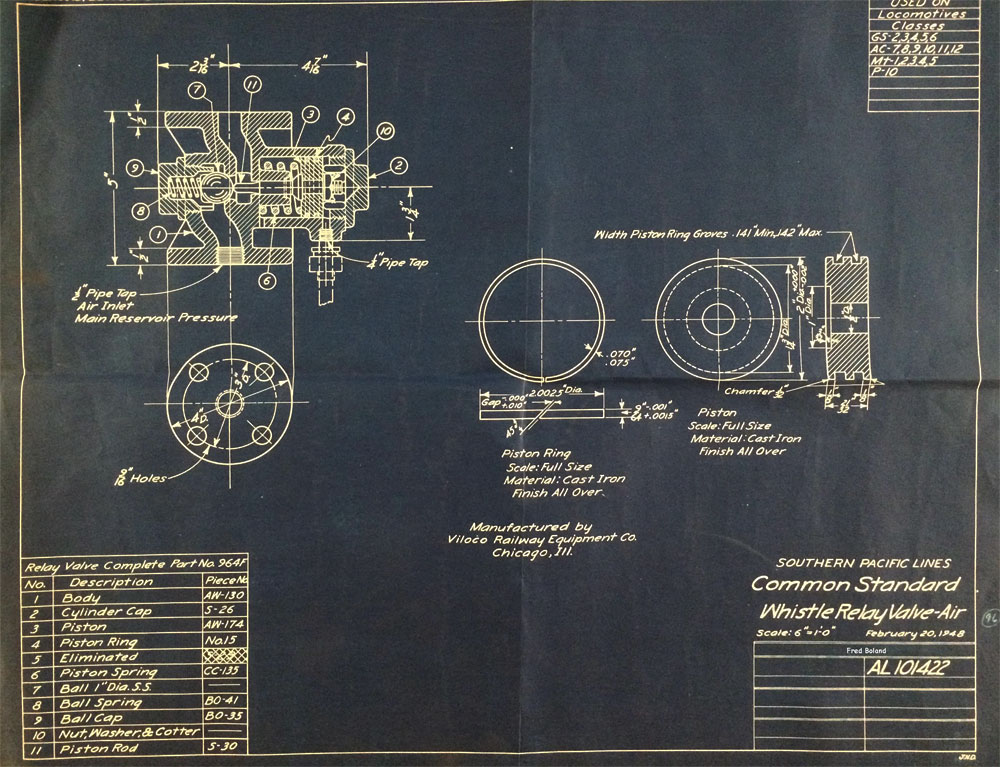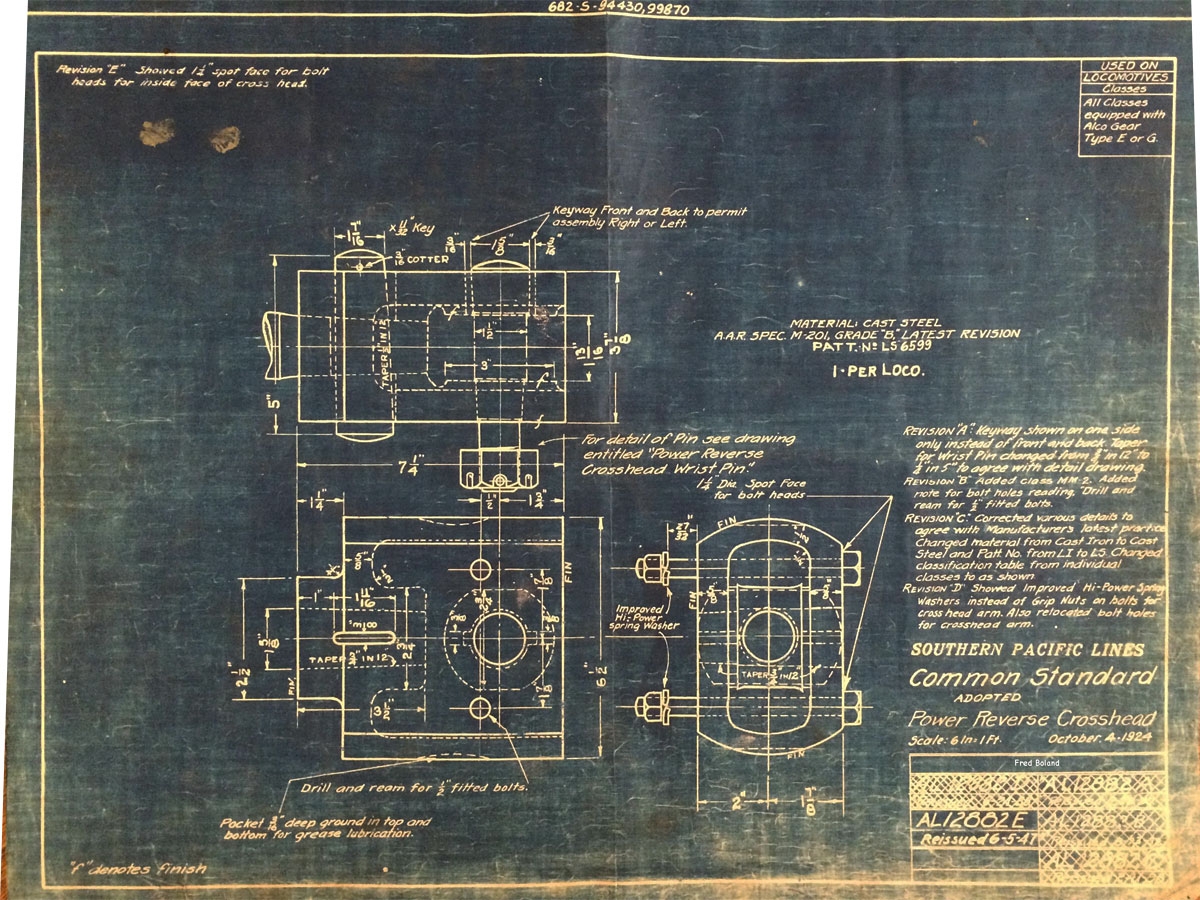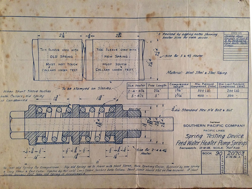 In 1958, after steam was done on Southern Pacific, somebody decided that the volumnuous collection of no-longer-needed steam locomotive drawings filed away at San Francisco's Bayshore Shops could be eliminated. Shop personnel thus began to fill a dumpster with many hundreds of drawings, much to the distress of the late Machinist Fred Boland. By then, Fred had accumulated nearly 40 years of Bayshore service, and these drawings held sentimental value for him, since he had worked with them throughout his long career. But moreover, he recognized their historical significance. Figuring that nobody cared, he began collecting them for preservation. Unfortunately, in that regard he was wrong. When his foreman discovered what Fred was doing, he ordered him to cease his efforts - these were "company secrets" that had to be destroyed, lest they fall into the wrong hands. Never-mind that they were obsolete, and that many of them were essentially those of suppliers that had been redrawn by SP draftsmen to conform to its Common Standard drawings.