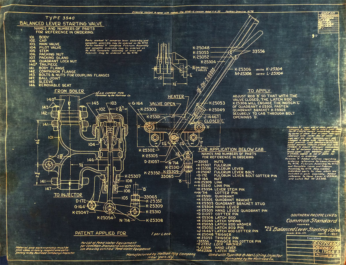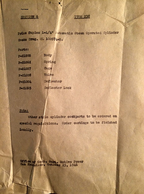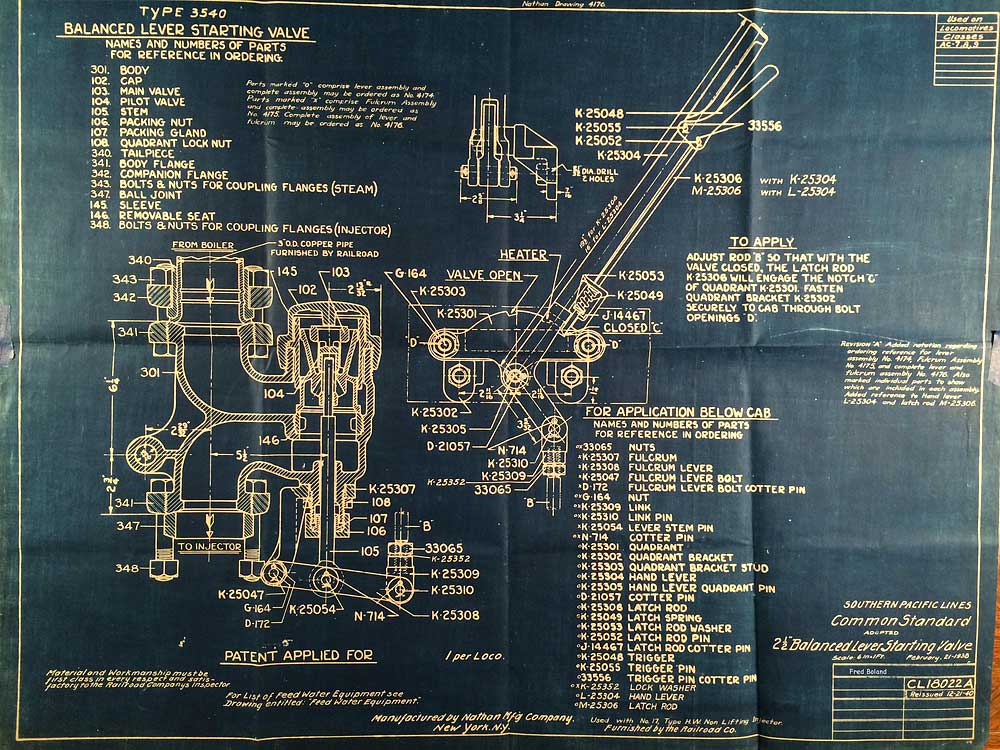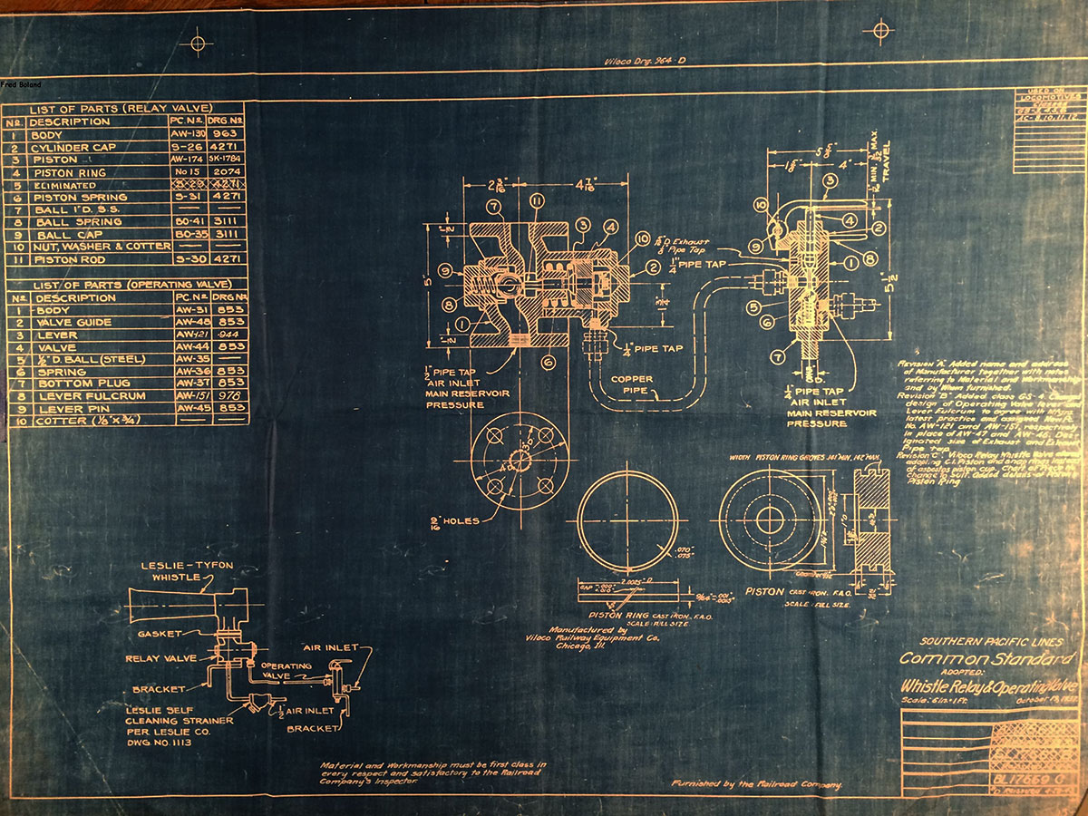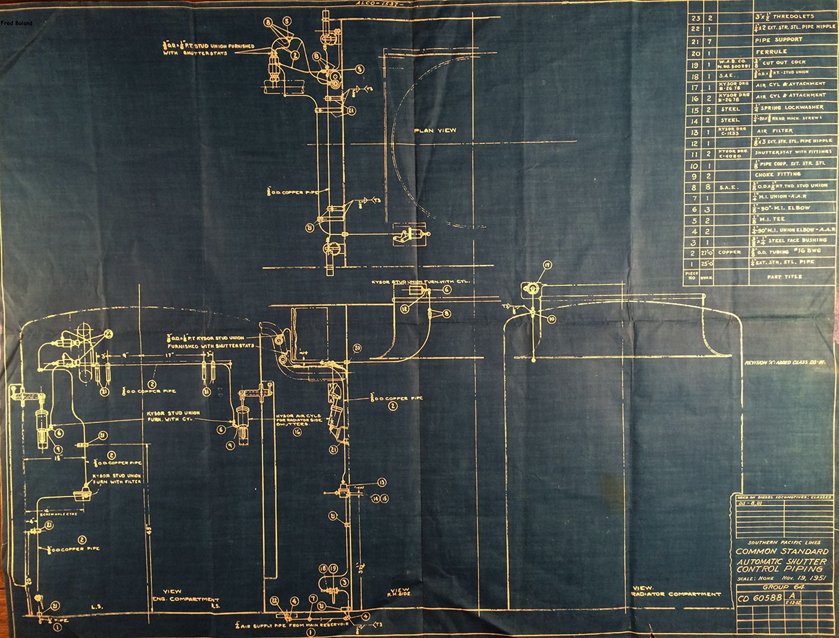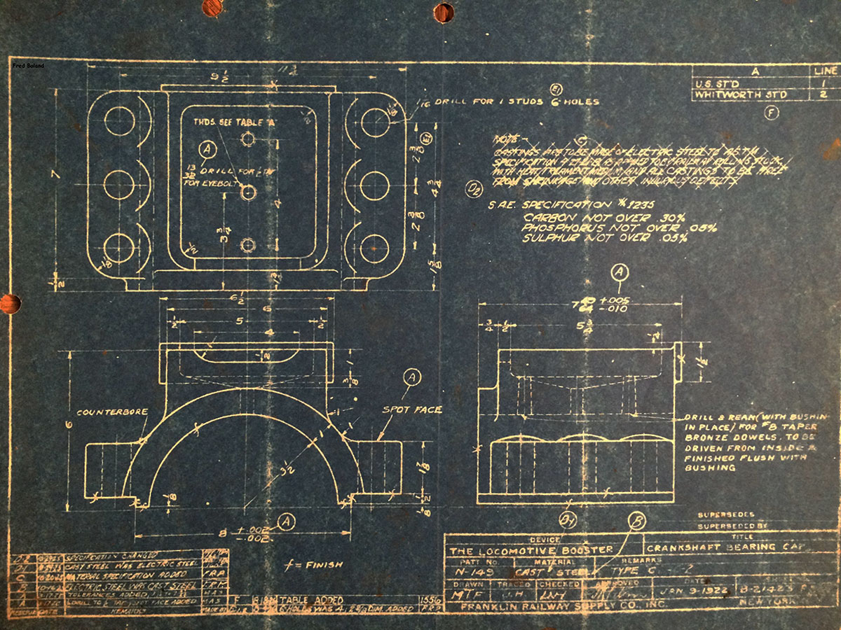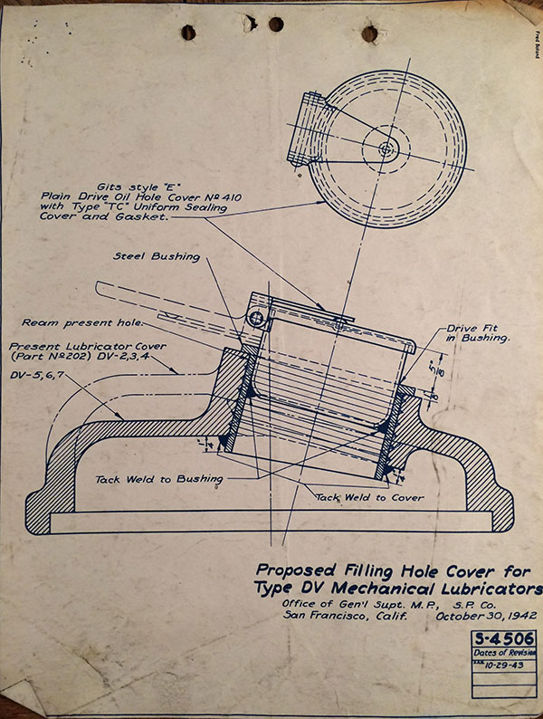 In 1958, after steam was done on Southern Pacific, somebody decided that the volumnuous collection of no-longer-needed steam locomotive drawings filed away at San Francisco's Bayshore Shops could be eliminated. Shop personnel thus began to fill a dumpster with many hundreds of drawings, much to the distress of the late Machinist Fred Boland. By then, Fred had accumulated nearly 40 years of Bayshore service, and these drawings held sentimental value for him, since he had worked with them throughout his long career. But moreover, he recognized their historical significance. Figuring that nobody cared, he began collecting them for preservation. Unfortunately, in that regard he was wrong. When his foreman discovered what Fred was doing, he ordered him to cease his efforts - these were "company secrets" that had to be destroyed, lest they fall into the wrong hands. Never-mind that they were obsolete, and that many of them were essentially those of suppliers that had been redrawn by SP draftsmen to conform to its Common Standard drawings.
