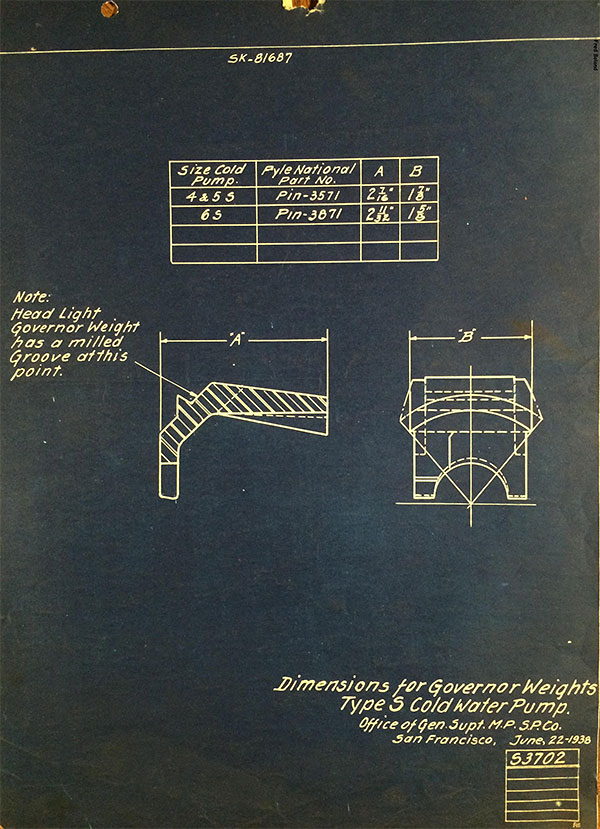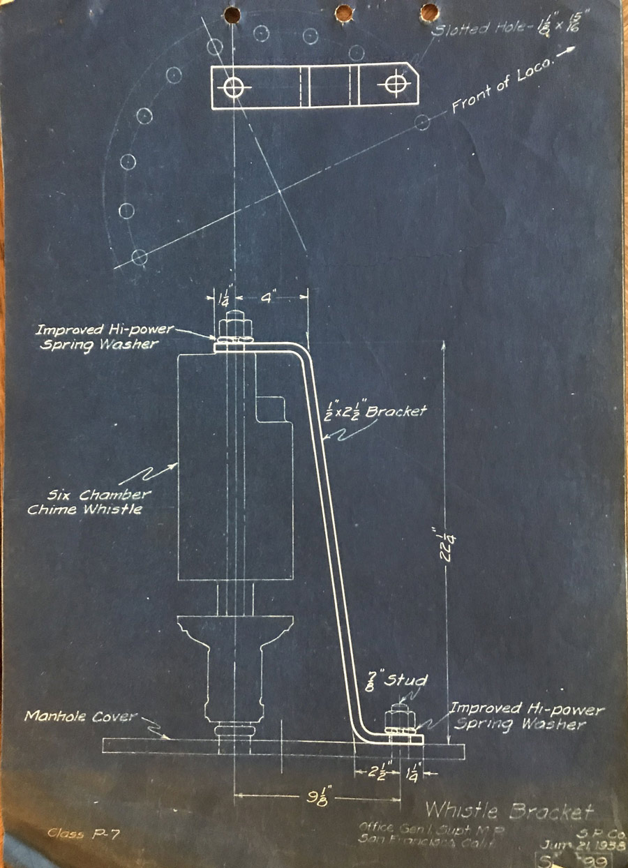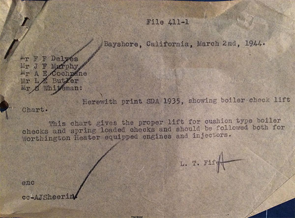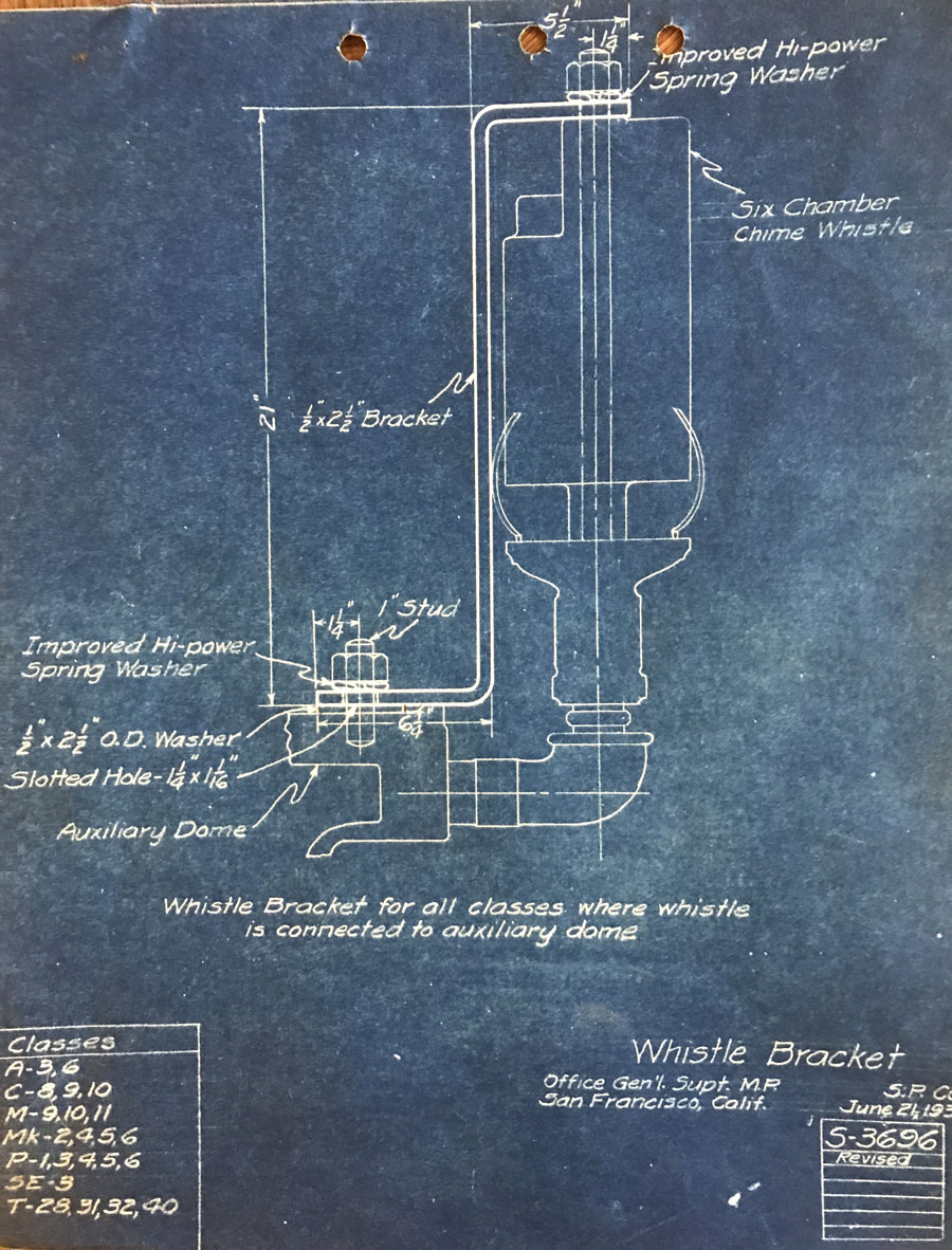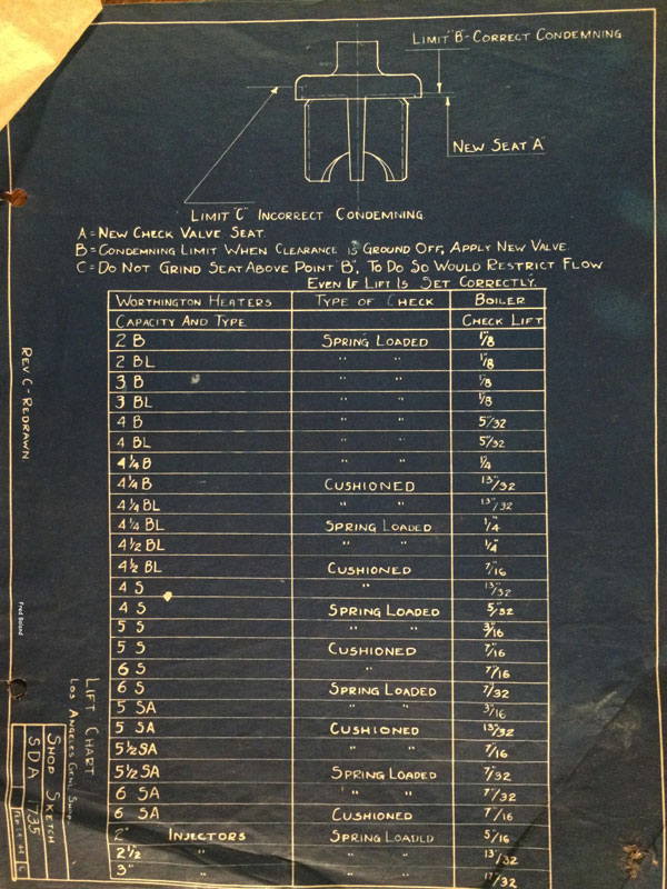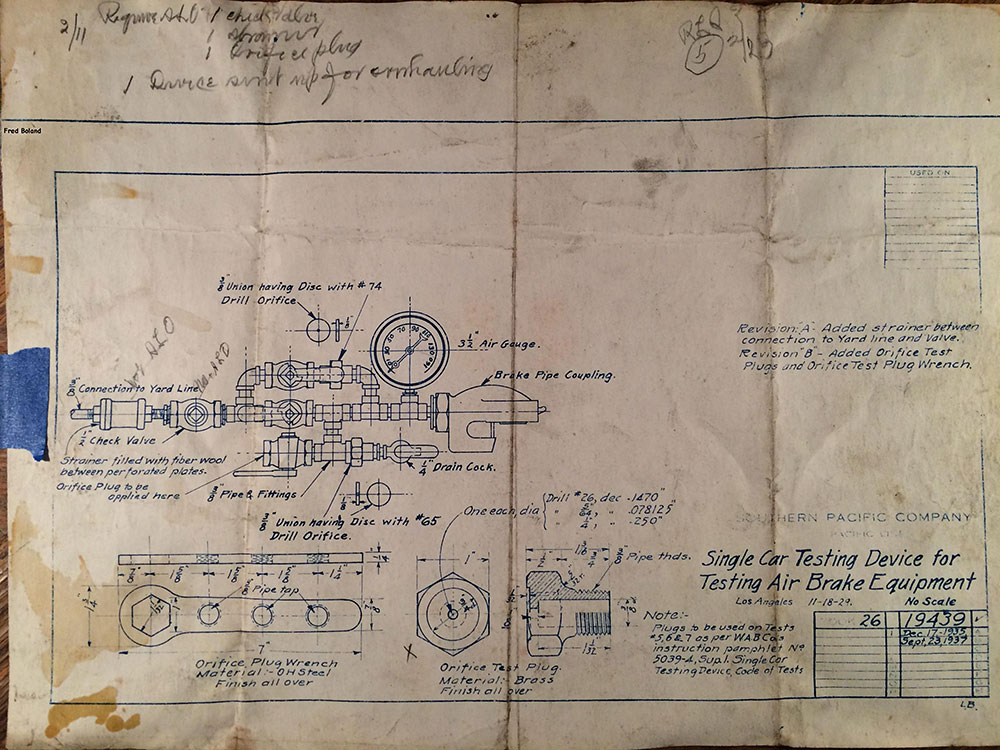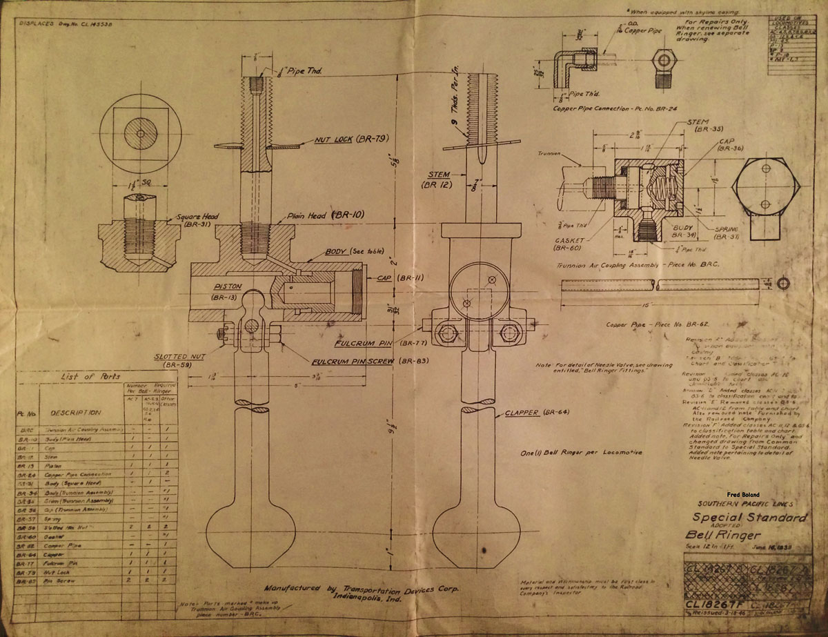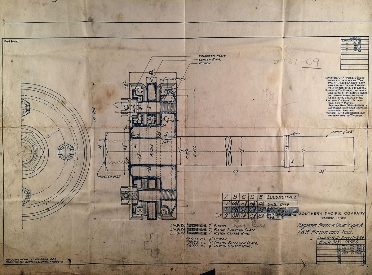 In 1958, after steam was done on Southern Pacific, somebody decided that the volumnuous collection of no-longer-needed steam locomotive drawings filed away at San Francisco's Bayshore Shops could be eliminated. Shop personnel thus began to fill a dumpster with many hundreds of drawings, much to the distress of the late Machinist Fred Boland. By then, Fred had accumulated nearly 40 years of Bayshore service, and these drawings held sentimental value for him, since he had worked with them throughout his long career. But moreover, he recognized their historical significance. Figuring that nobody cared, he began collecting them for preservation. Unfortunately, in that regard he was wrong. When his foreman discovered what Fred was doing, he ordered him to cease his efforts - these were "company secrets" that had to be destroyed, lest they fall into the wrong hands. Never-mind that they were obsolete, and that many of them were essentially those of suppliers that had been redrawn by SP draftsmen to conform to its Common Standard drawings.