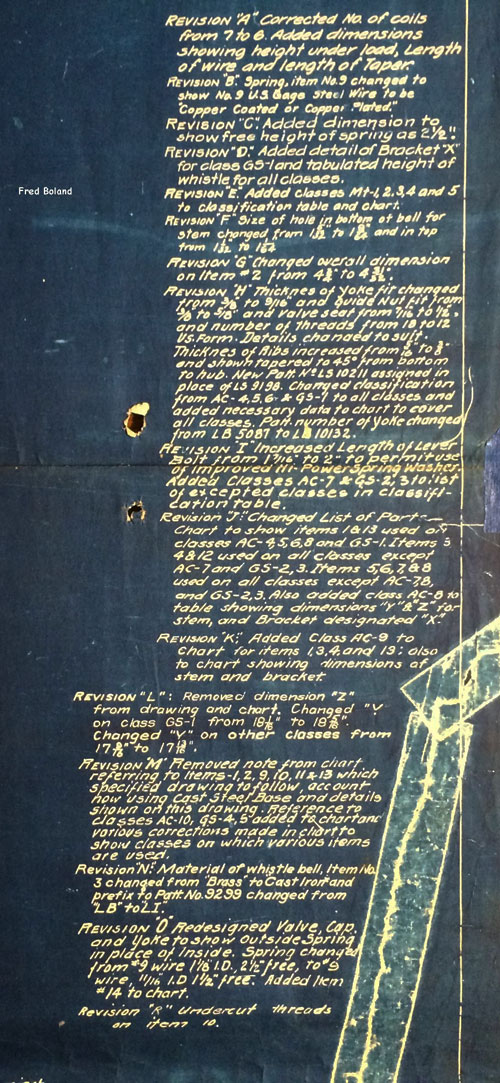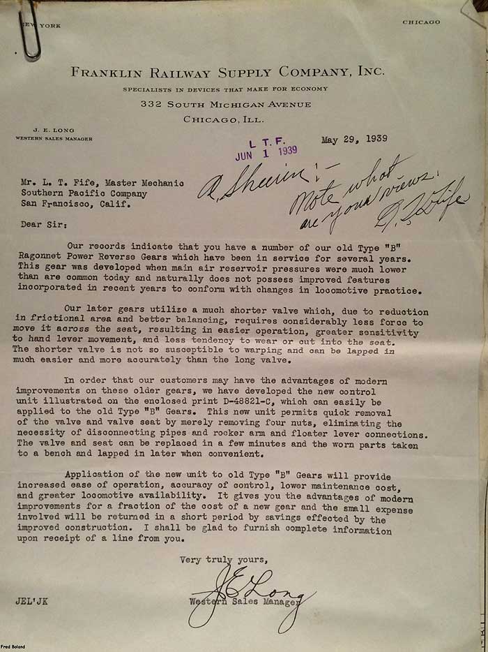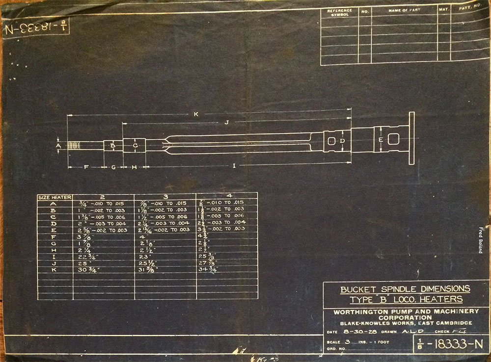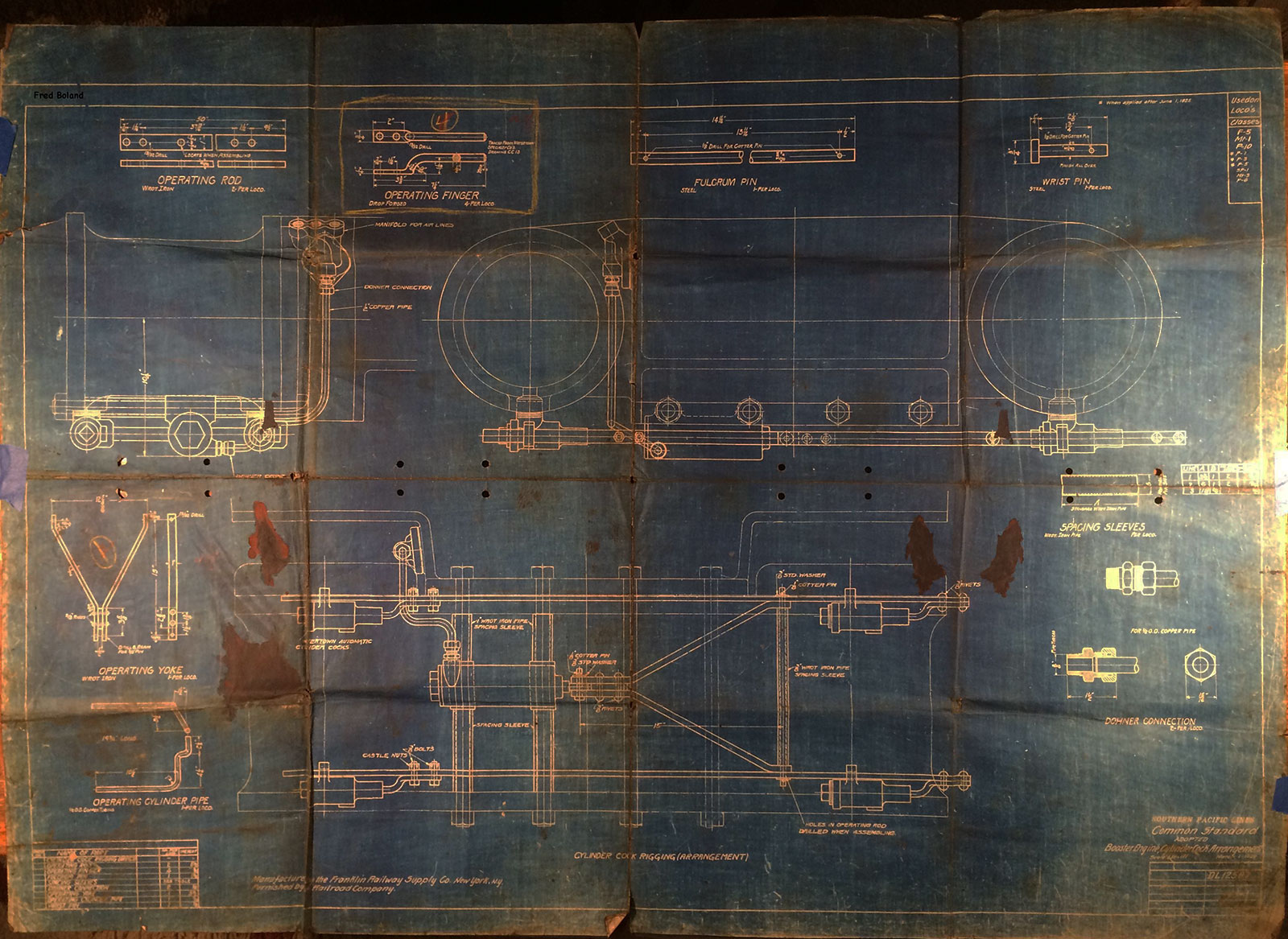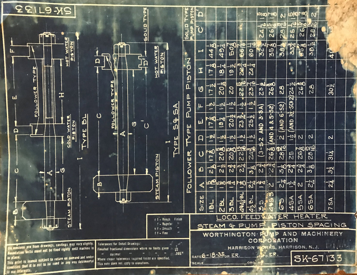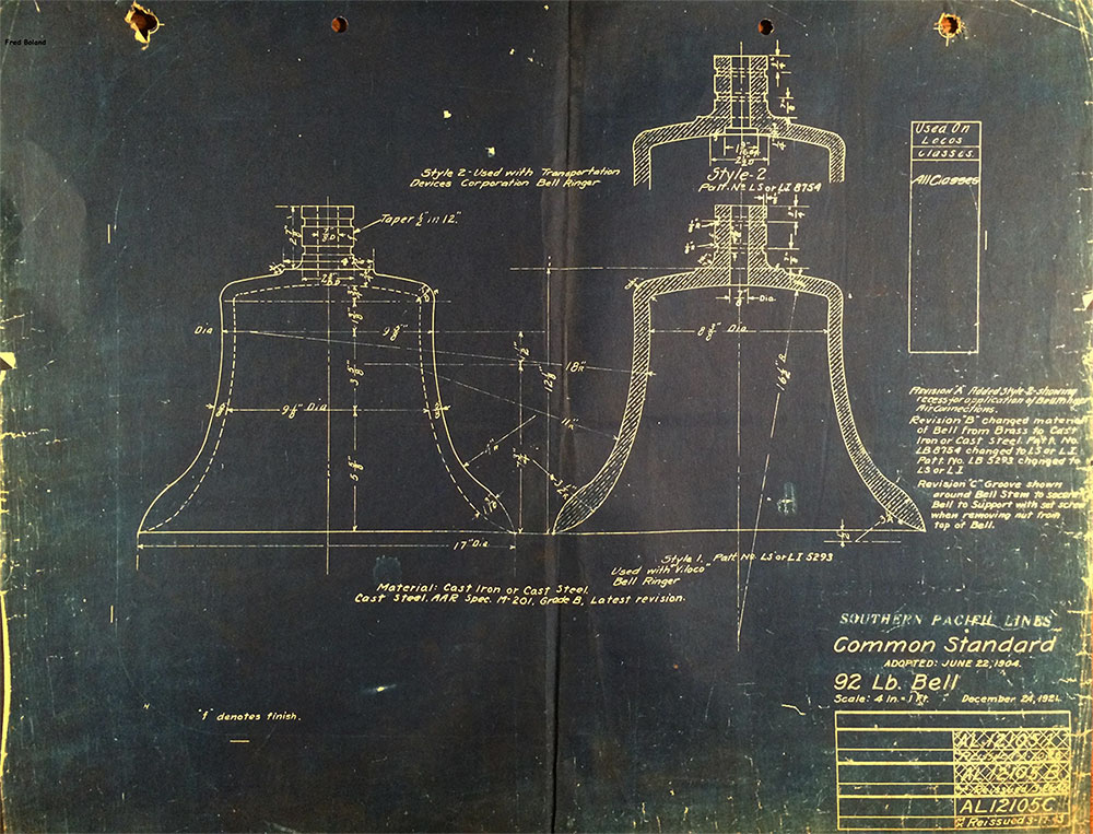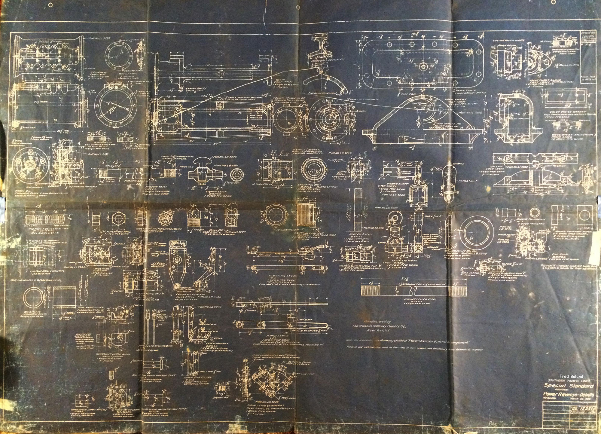 In 1958, after steam was done on Southern Pacific, somebody decided that the volumnuous collection of no-longer-needed steam locomotive drawings filed away at San Francisco's Bayshore Shops could be eliminated. Shop personnel thus began to fill a dumpster with many hundreds of drawings, much to the distress of the late Machinist Fred Boland. By then, Fred had accumulated nearly 40 years of Bayshore service, and these drawings held sentimental value for him, since he had worked with them throughout his long career. But moreover, he recognized their historical significance. Figuring that nobody cared, he began collecting them for preservation. Unfortunately, in that regard he was wrong. When his foreman discovered what Fred was doing, he ordered him to cease his efforts - these were "company secrets" that had to be destroyed, lest they fall into the wrong hands. Never-mind that they were obsolete, and that many of them were essentially those of suppliers that had been redrawn by SP draftsmen to conform to its Common Standard drawings.
