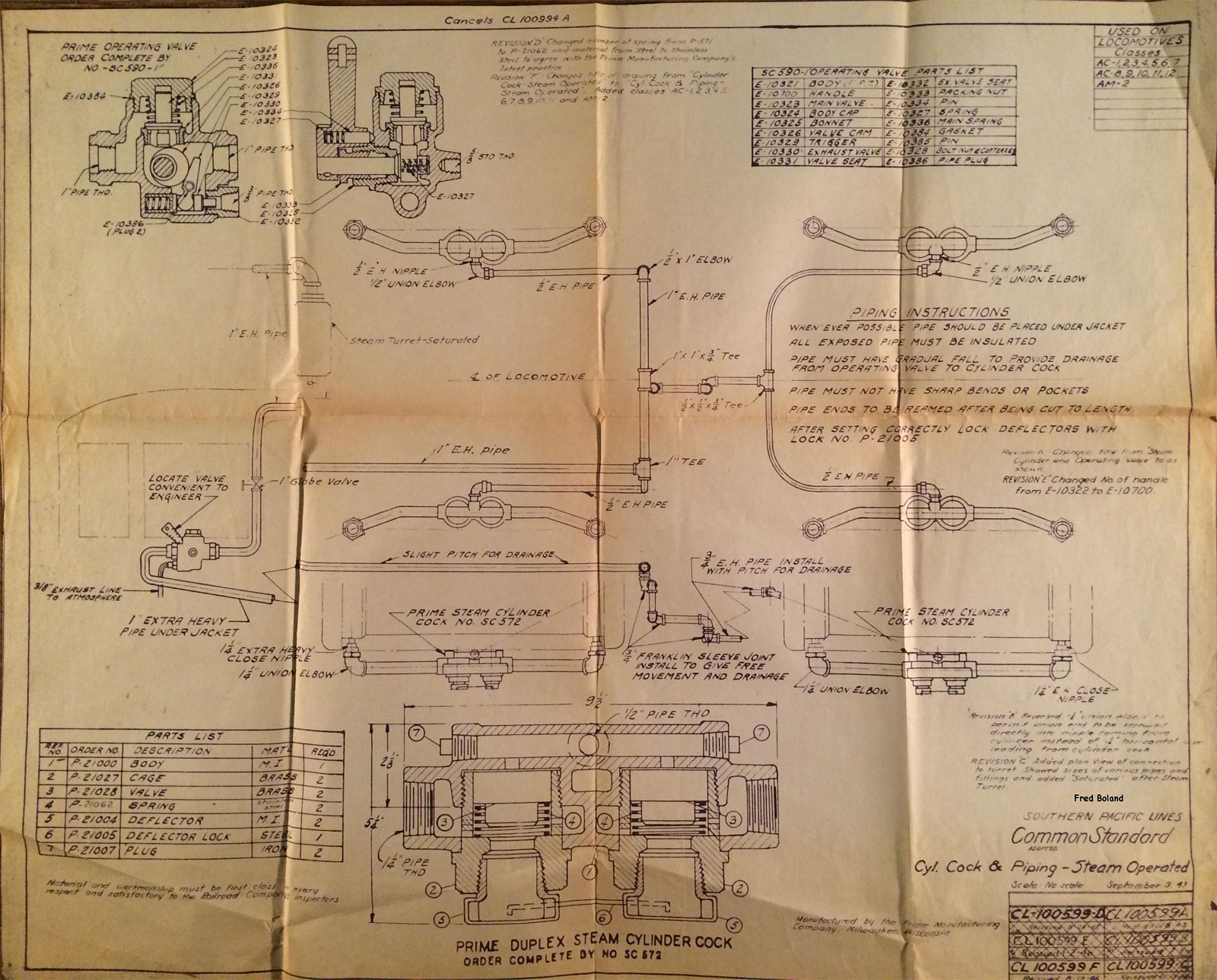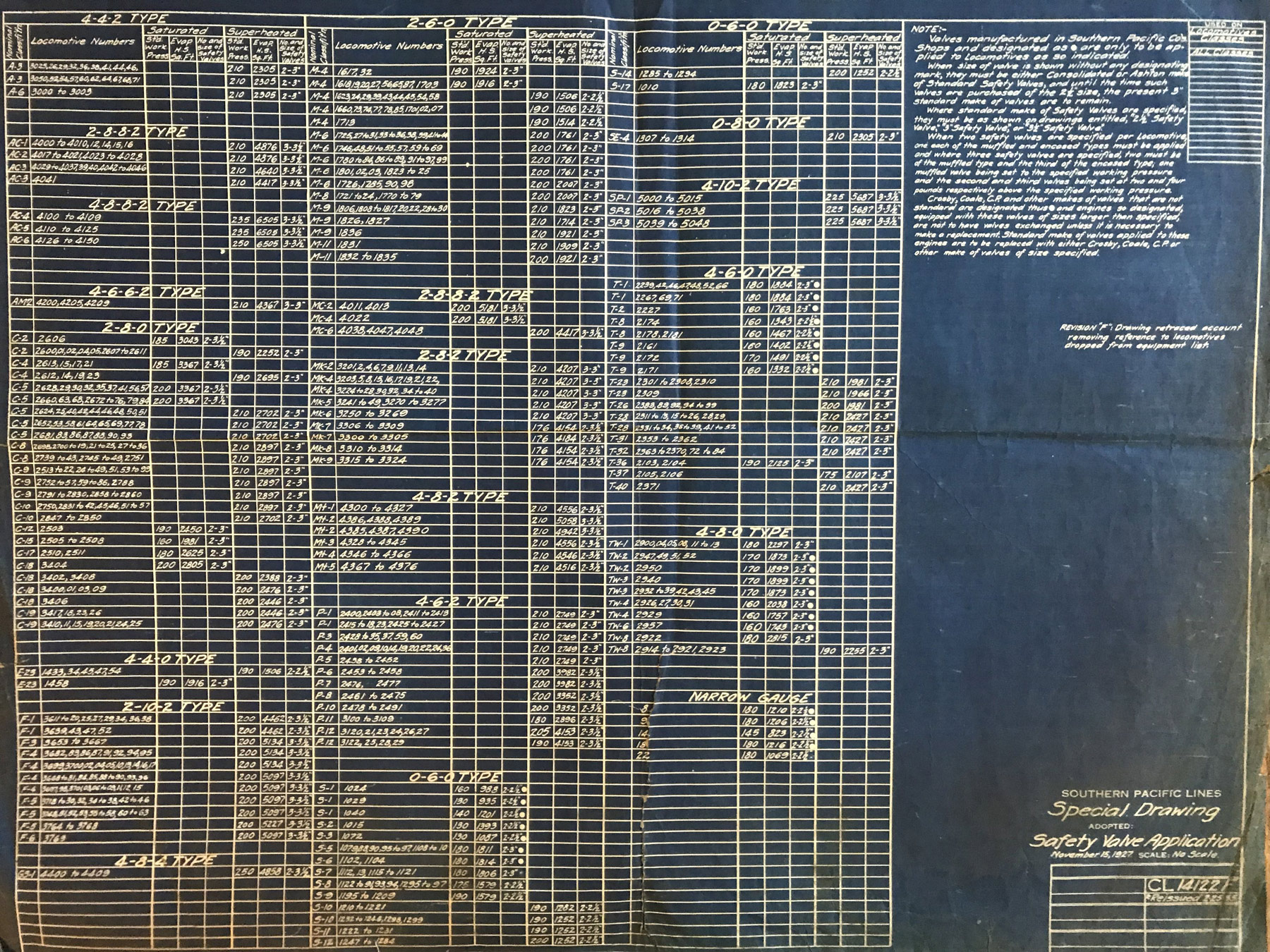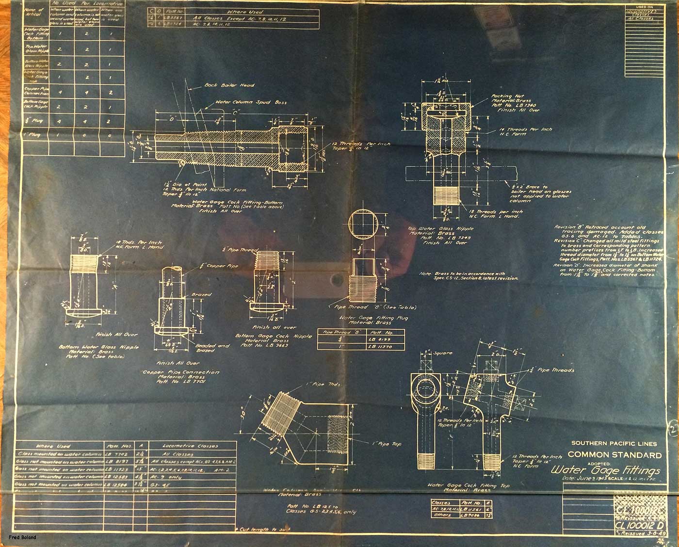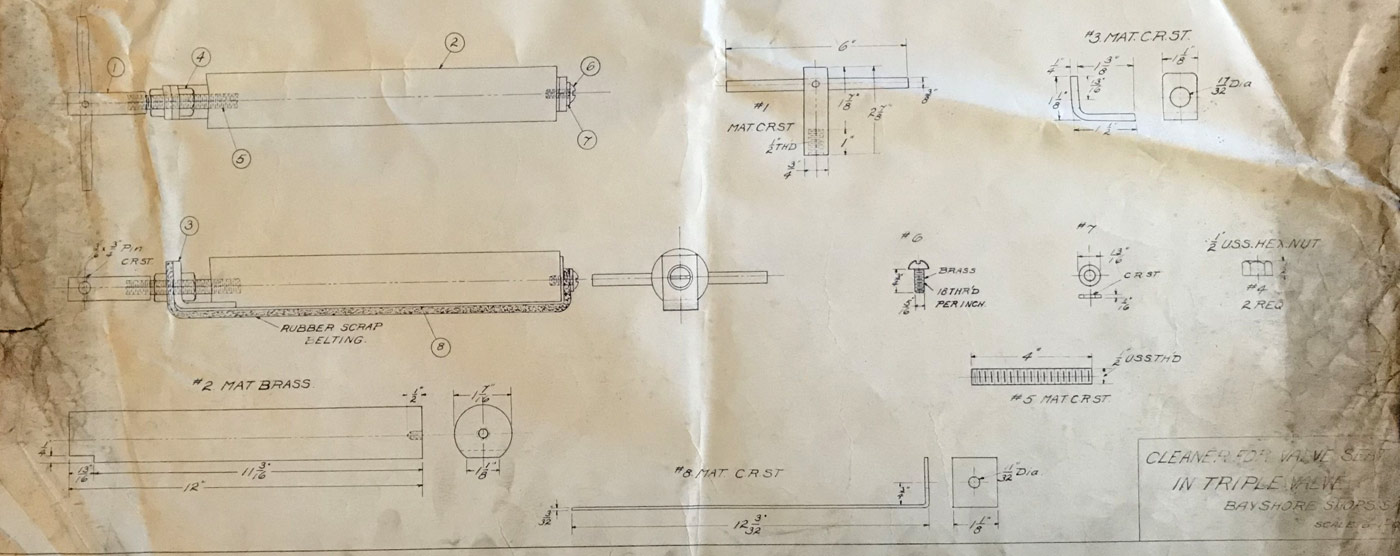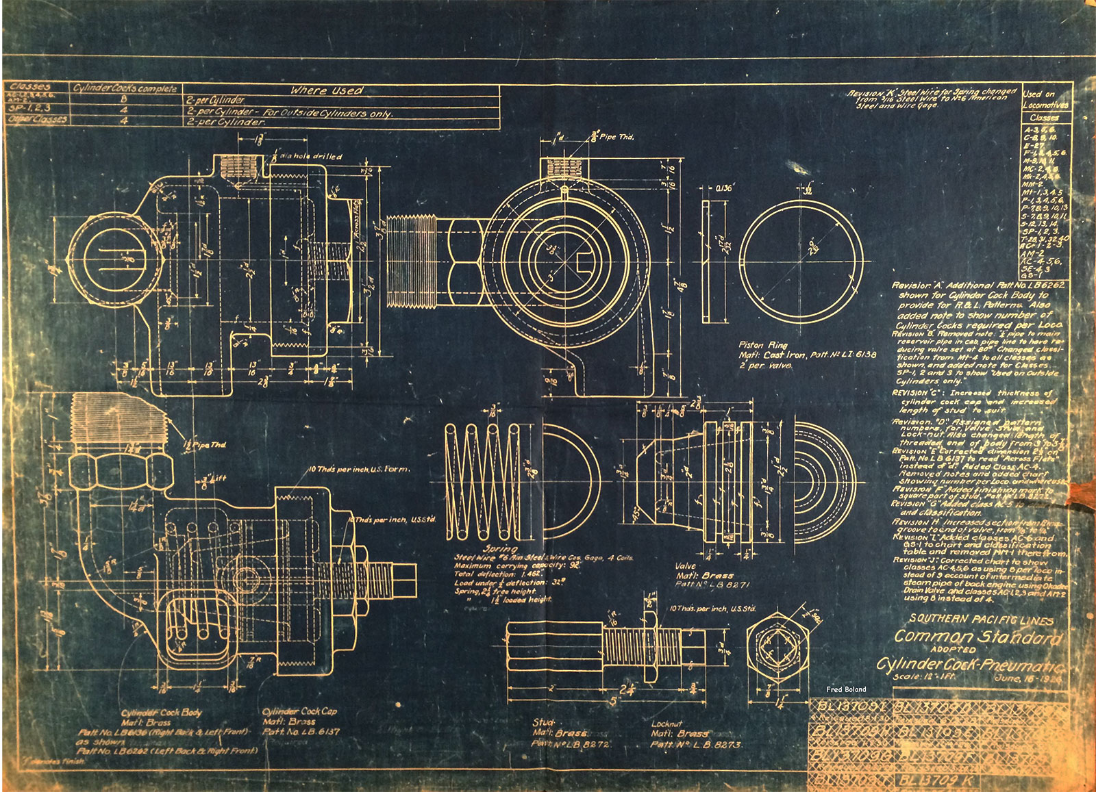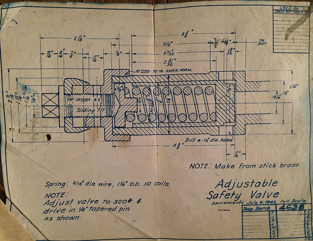 In 1958, after steam was done on Southern Pacific, somebody decided that the volumnuous collection of no-longer-needed steam locomotive drawings filed away at San Francisco's Bayshore Shops could be eliminated. Shop personnel thus began to fill a dumpster with many hundreds of drawings, much to the distress of the late Machinist Fred Boland. By then, Fred had accumulated nearly 40 years of Bayshore service, and these drawings held sentimental value for him, since he had worked with them throughout his long career. But moreover, he recognized their historical significance. Figuring that nobody cared, he began collecting them for preservation. Unfortunately, in that regard he was wrong. When his foreman discovered what Fred was doing, he ordered him to cease his efforts - these were "company secrets" that had to be destroyed, lest they fall into the wrong hands. Never-mind that they were obsolete, and that many of them were essentially those of suppliers that had been redrawn by SP draftsmen to conform to its Common Standard drawings.