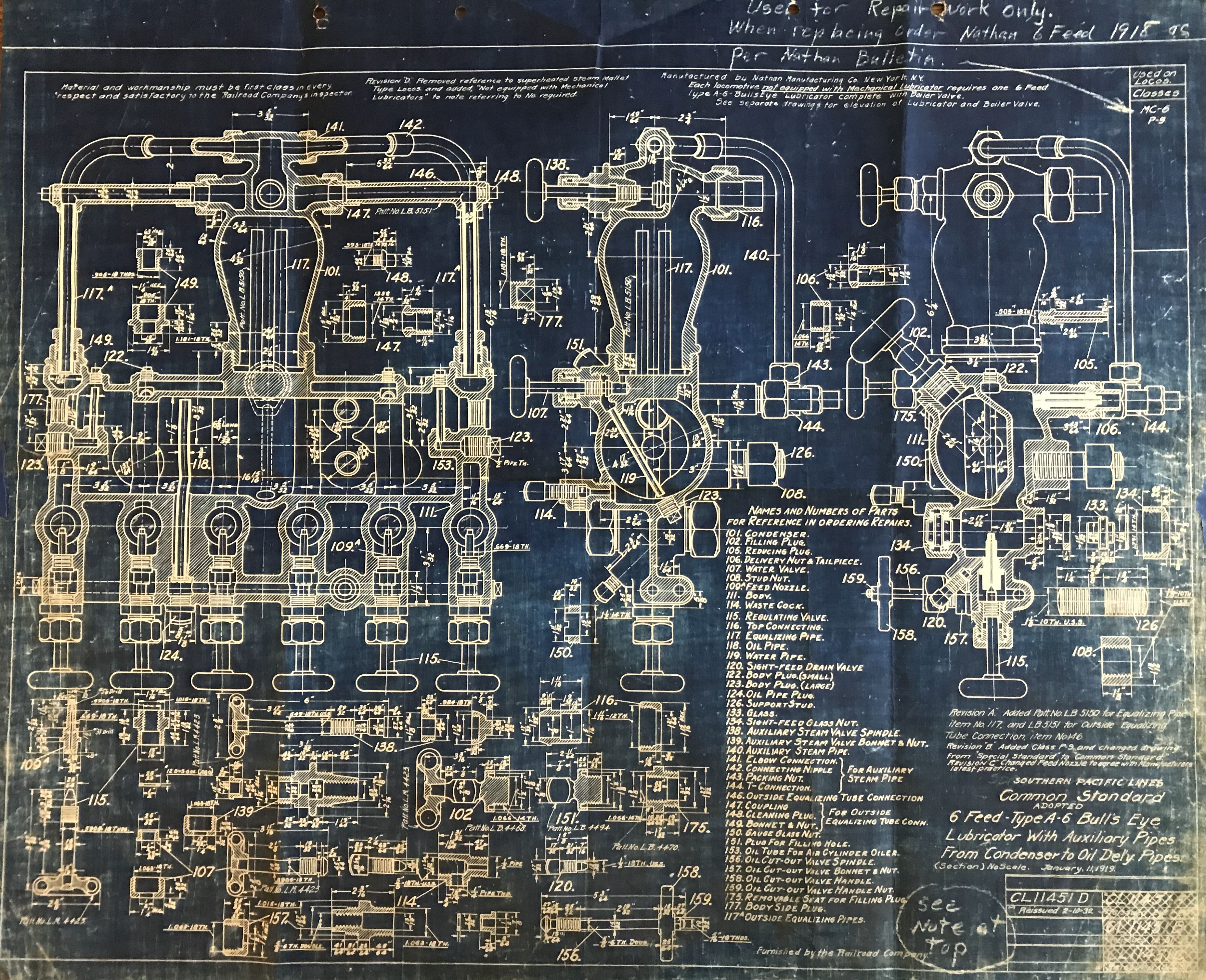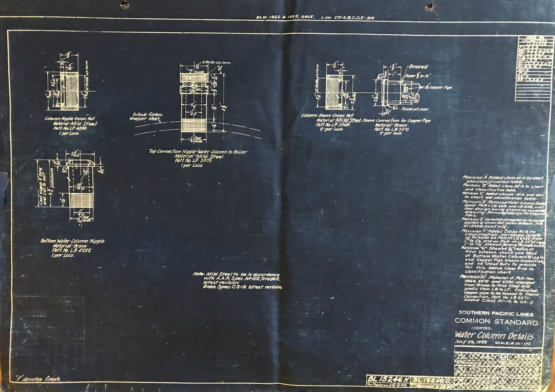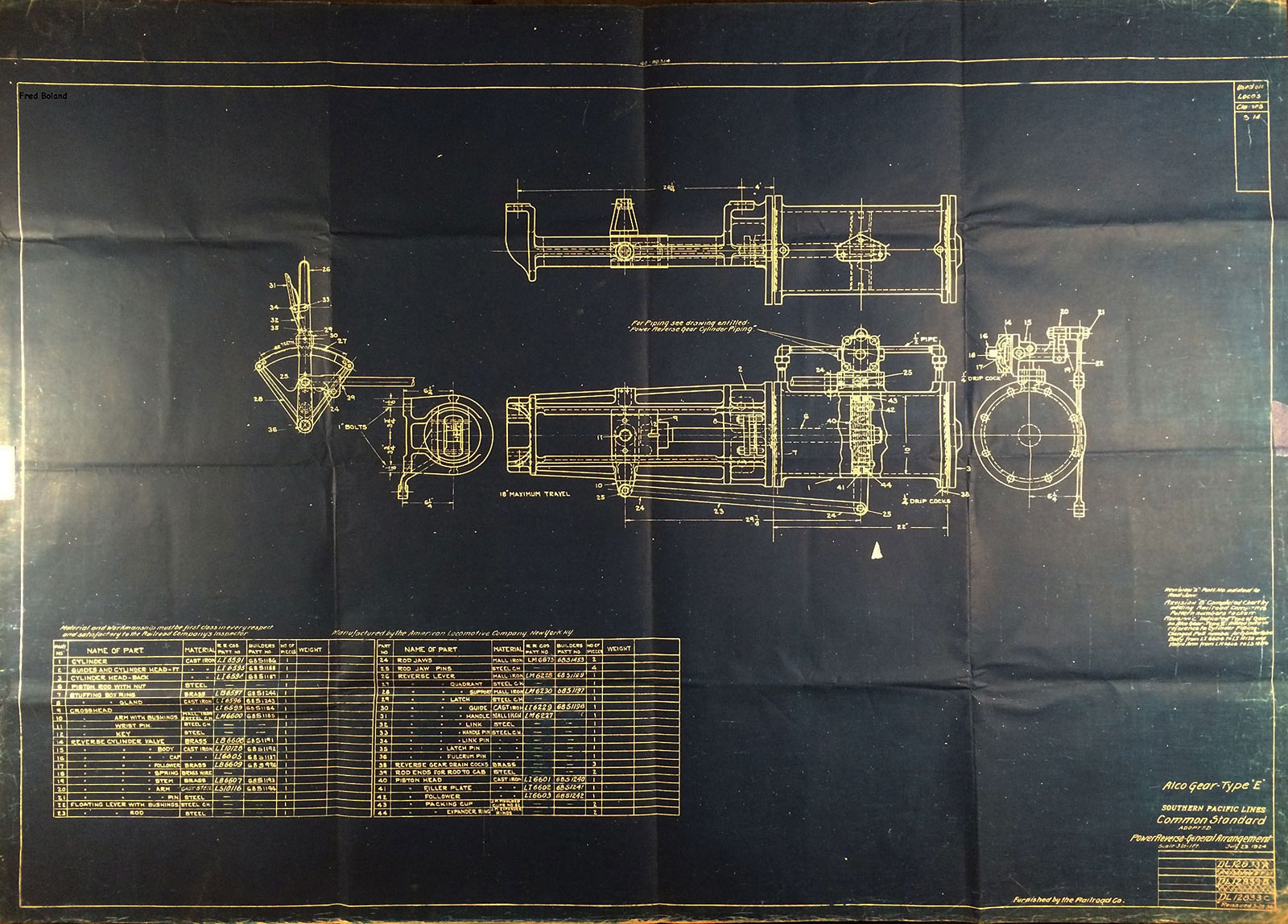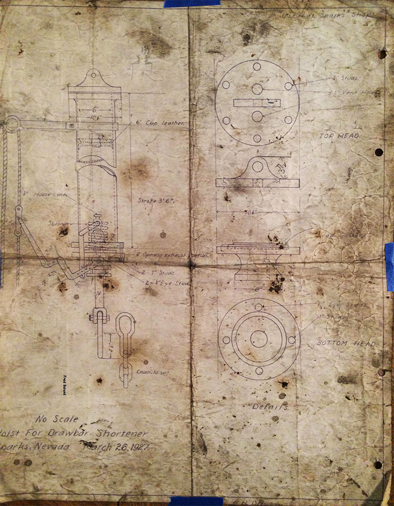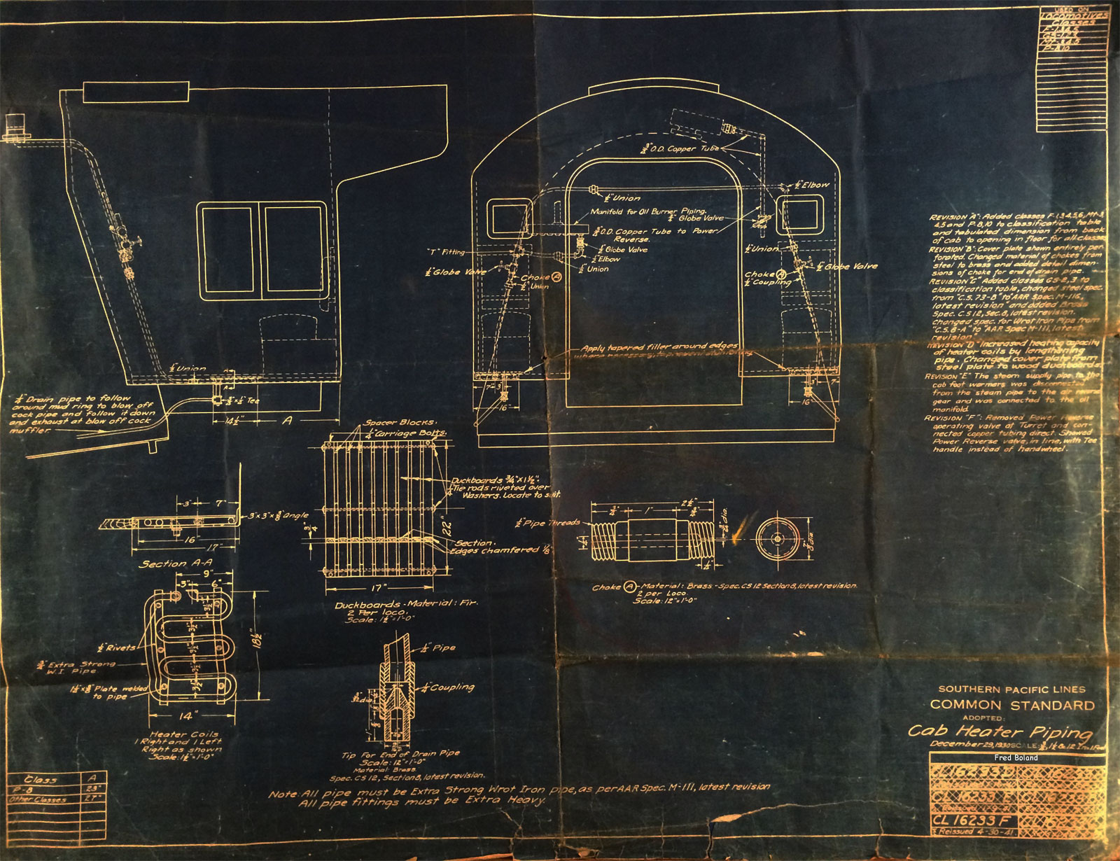 In 1958, after steam was done on Southern Pacific, somebody decided that the volumnuous collection of no-longer-needed steam locomotive drawings filed away at San Francisco's Bayshore Shops could be eliminated. Shop personnel thus began to fill a dumpster with many hundreds of drawings, much to the distress of the late Machinist Fred Boland. By then, Fred had accumulated nearly 40 years of Bayshore service, and these drawings held sentimental value for him, since he had worked with them throughout his long career. But moreover, he recognized their historical significance. Figuring that nobody cared, he began collecting them for preservation. Unfortunately, in that regard he was wrong. When his foreman discovered what Fred was doing, he ordered him to cease his efforts - these were "company secrets" that had to be destroyed, lest they fall into the wrong hands. Never-mind that they were obsolete, and that many of them were essentially those of suppliers that had been redrawn by SP draftsmen to conform to its Common Standard drawings.