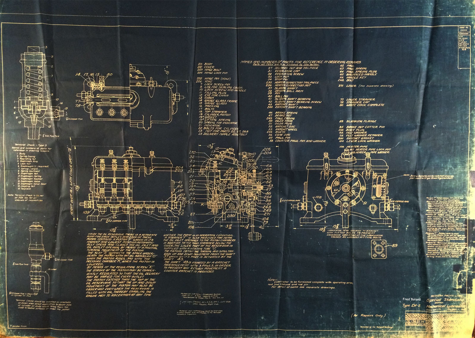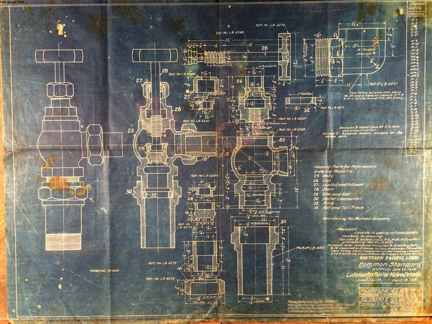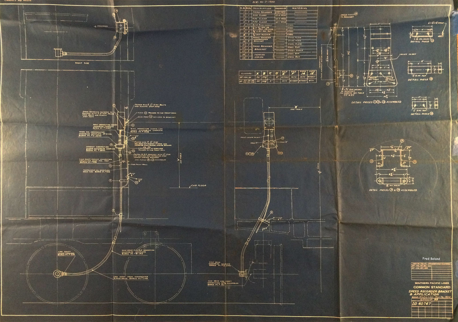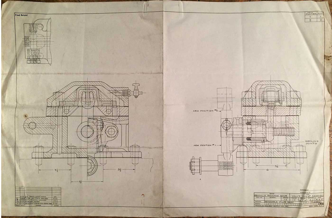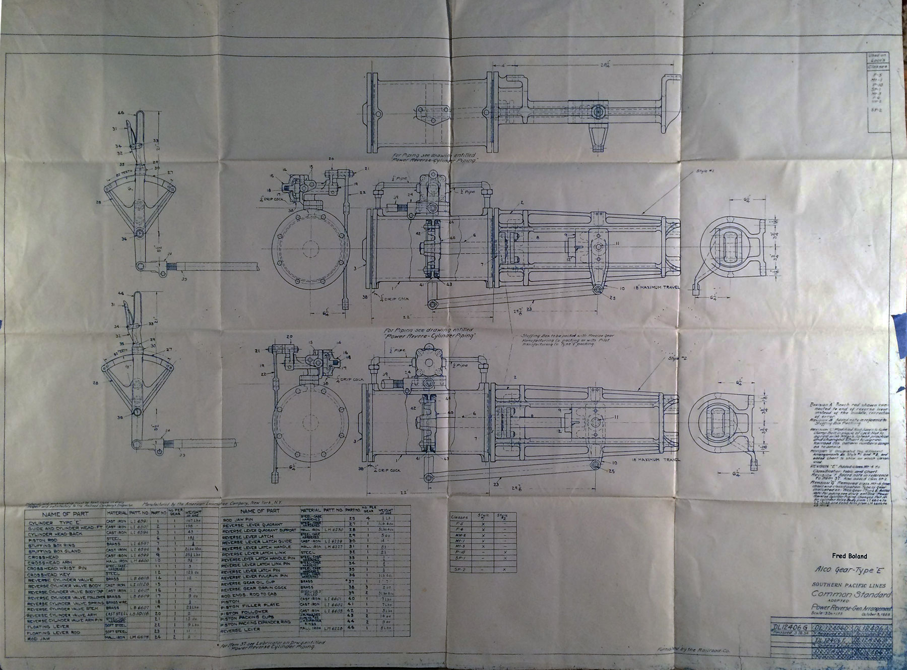 In 1958, after steam was done on Southern Pacific, somebody decided that the volumnuous collection of no-longer-needed steam locomotive drawings filed away at San Francisco's Bayshore Shops could be eliminated. Shop personnel thus began to fill a dumpster with many hundreds of drawings, much to the distress of the late Machinist Fred Boland. By then, Fred had accumulated nearly 40 years of Bayshore service, and these drawings held sentimental value for him, since he had worked with them throughout his long career. But moreover, he recognized their historical significance. Figuring that nobody cared, he began collecting them for preservation. Unfortunately, in that regard he was wrong. When his foreman discovered what Fred was doing, he ordered him to cease his efforts - these were "company secrets" that had to be destroyed, lest they fall into the wrong hands. Never-mind that they were obsolete, and that many of them were essentially those of suppliers that had been redrawn by SP draftsmen to conform to its Common Standard drawings.